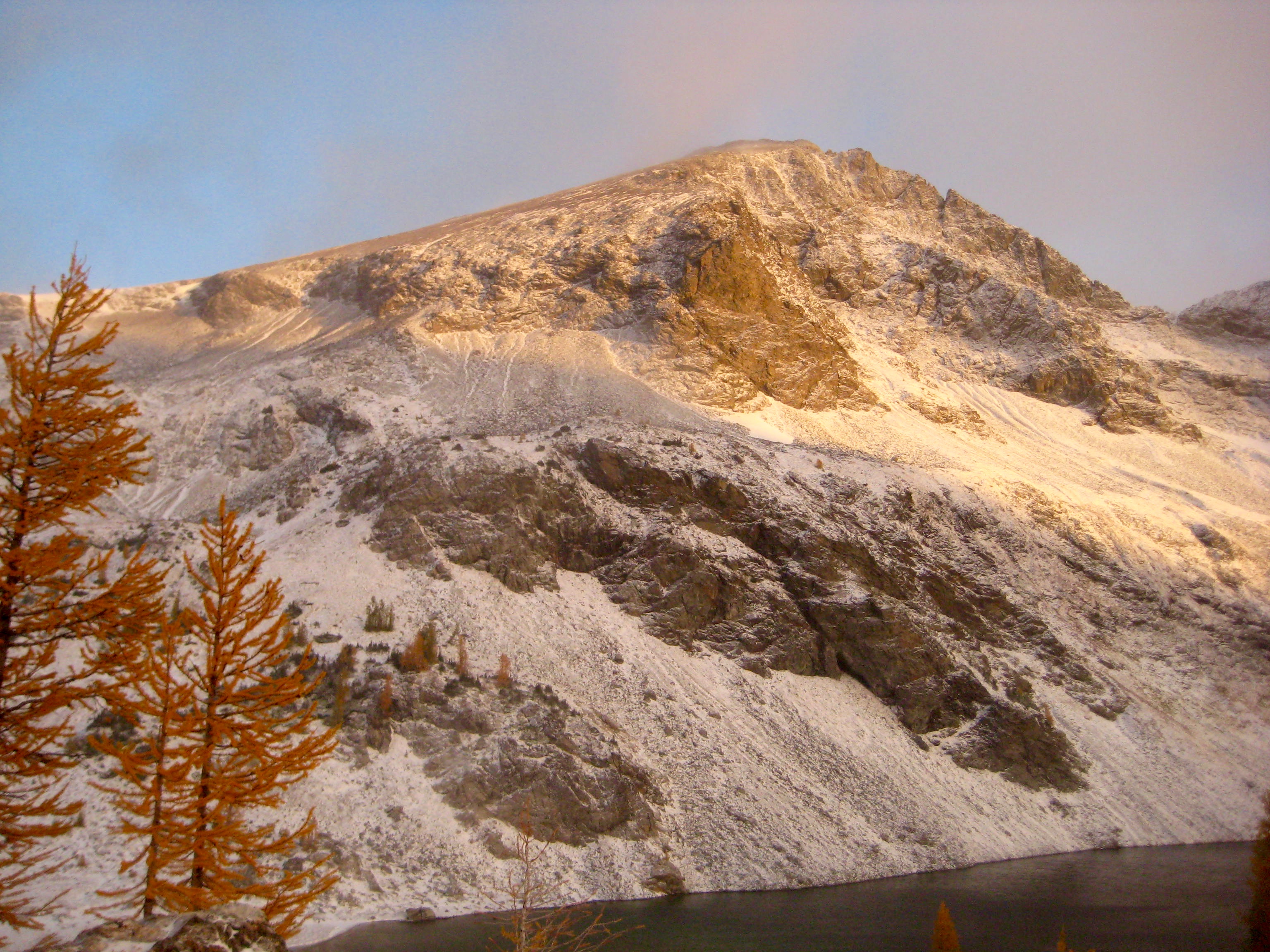 We all packed up in the still-howling wind, being careful to keep a grasp on each item lest it be whipped off to the Entiat Valley.  As we ate breakfast behind a windbreak, the eastern sky gradually lightened and began to splash dawn colors across the frozen landscape.  It was a visually stunning aftermath to a wild night.