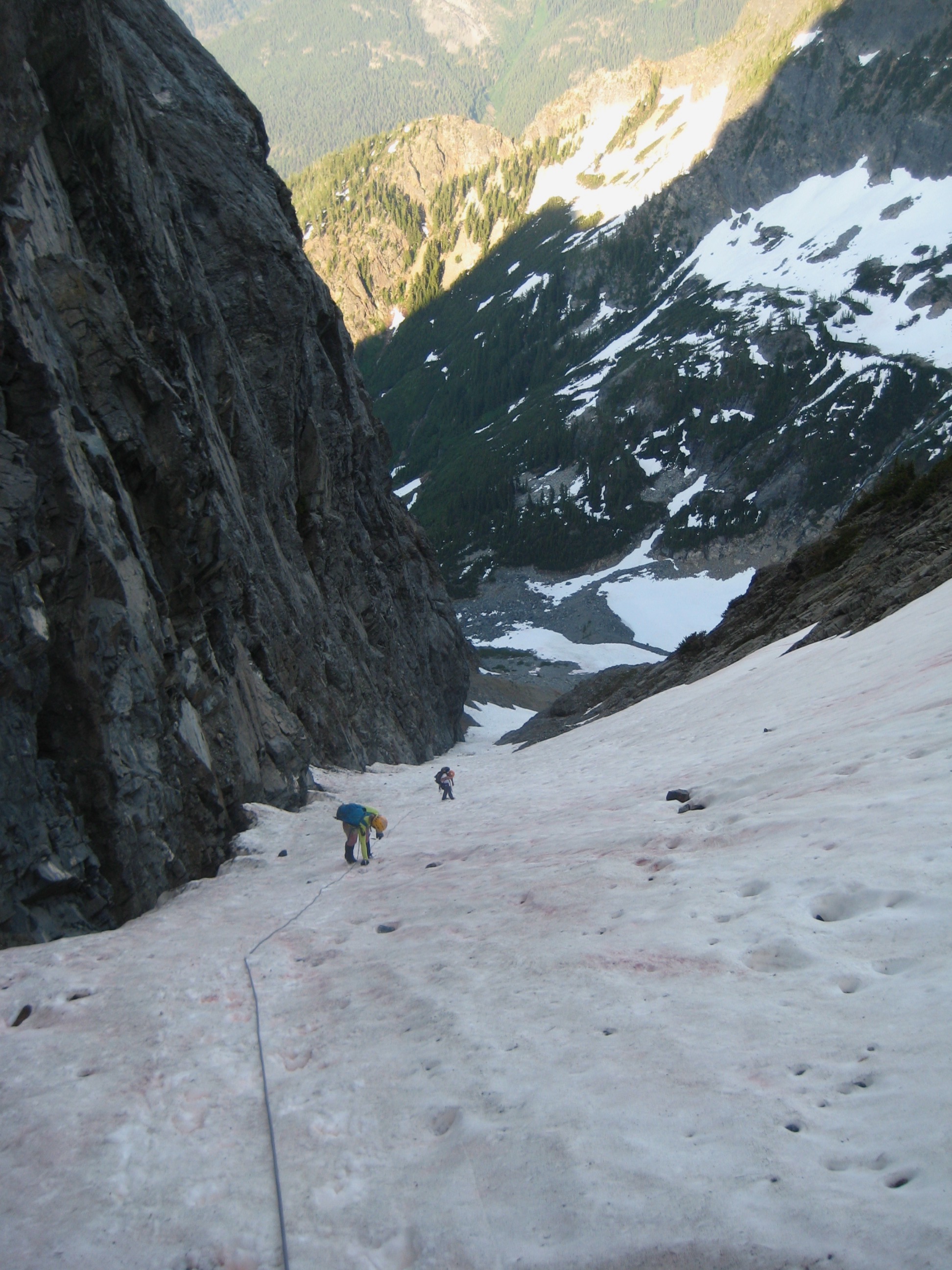 We left the summit at 5:00pm and made three rappels to reach the upper gully.  Once back at the south col, we checked out a possible descent route down an east-facing snow couloir, which Fay had recommended.  This couloir looked much faster than climbing back along the south ridge, so we descended it 1400 feet, using snow flukes and running belays for protection.