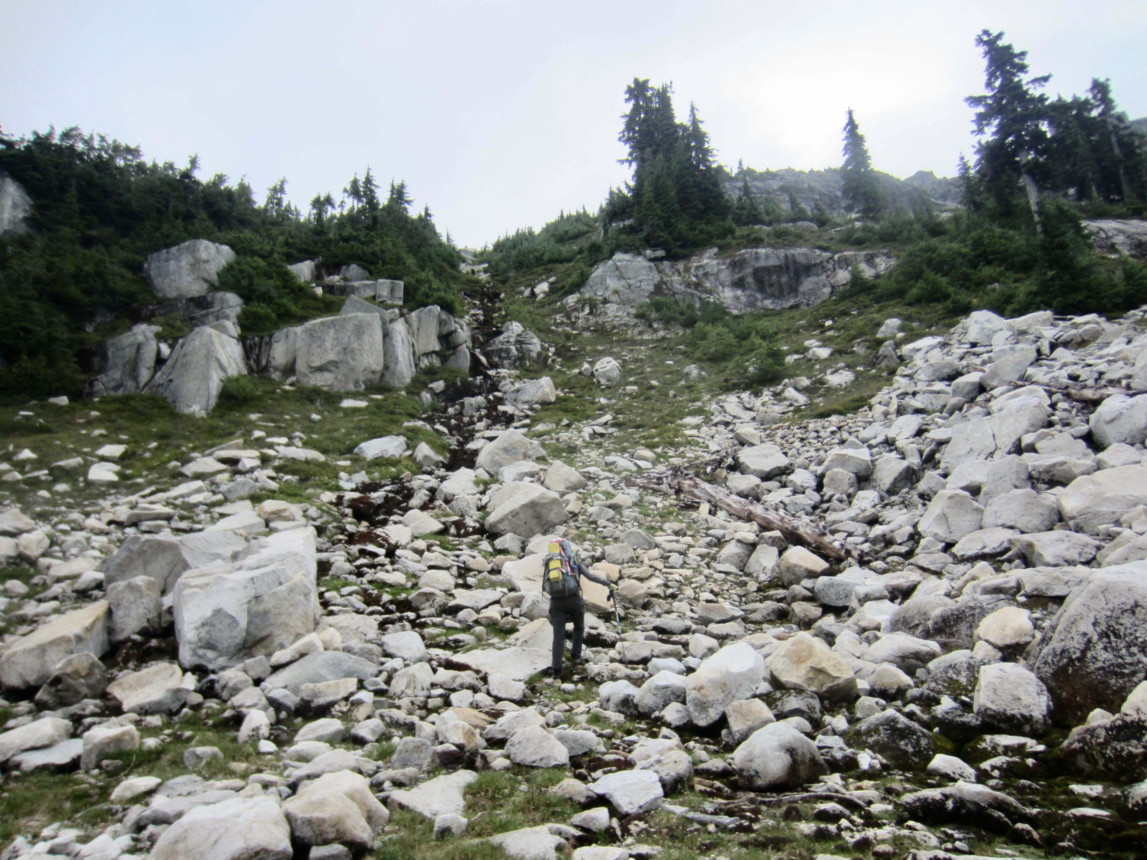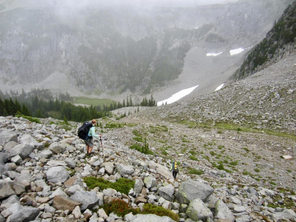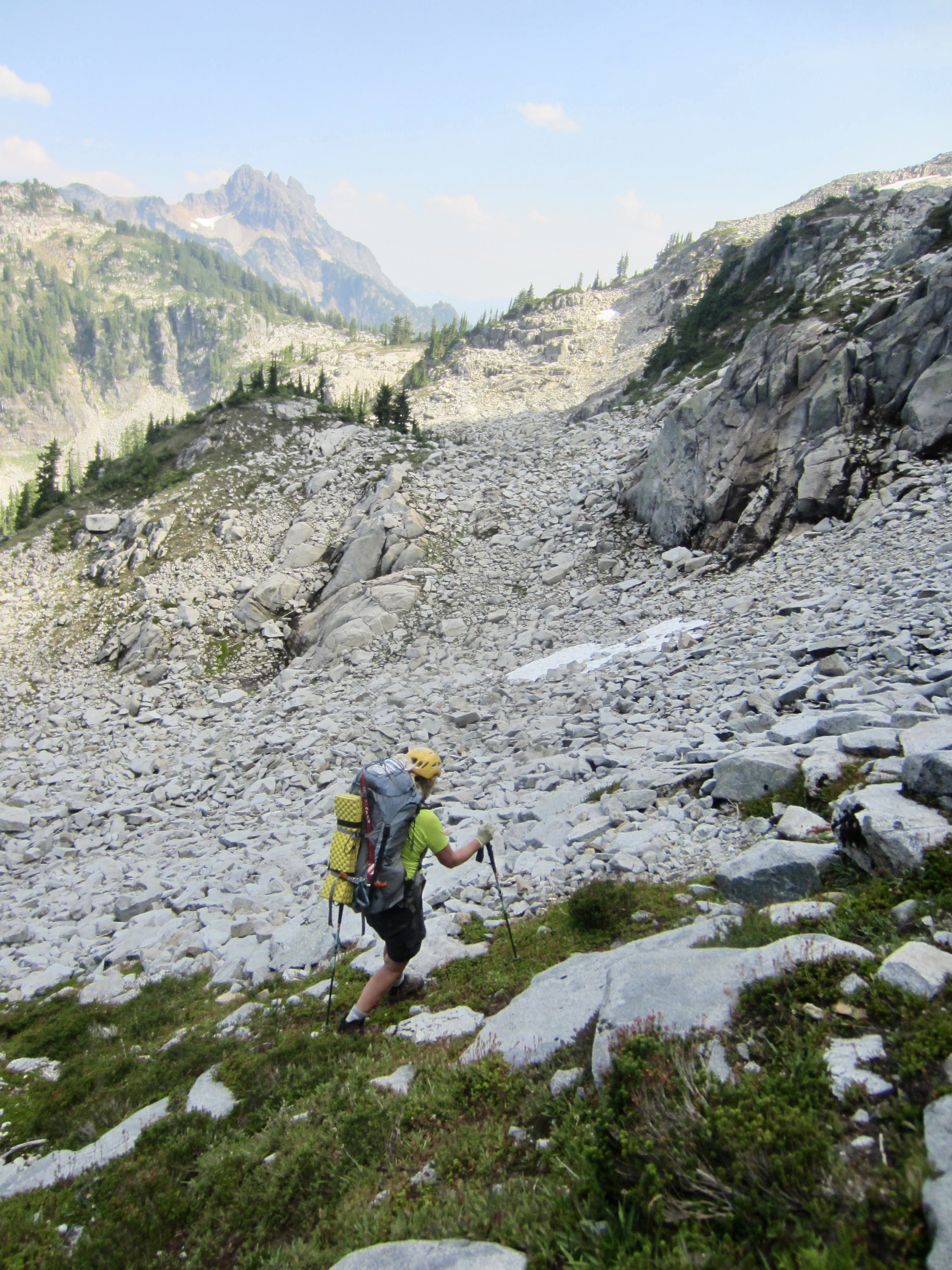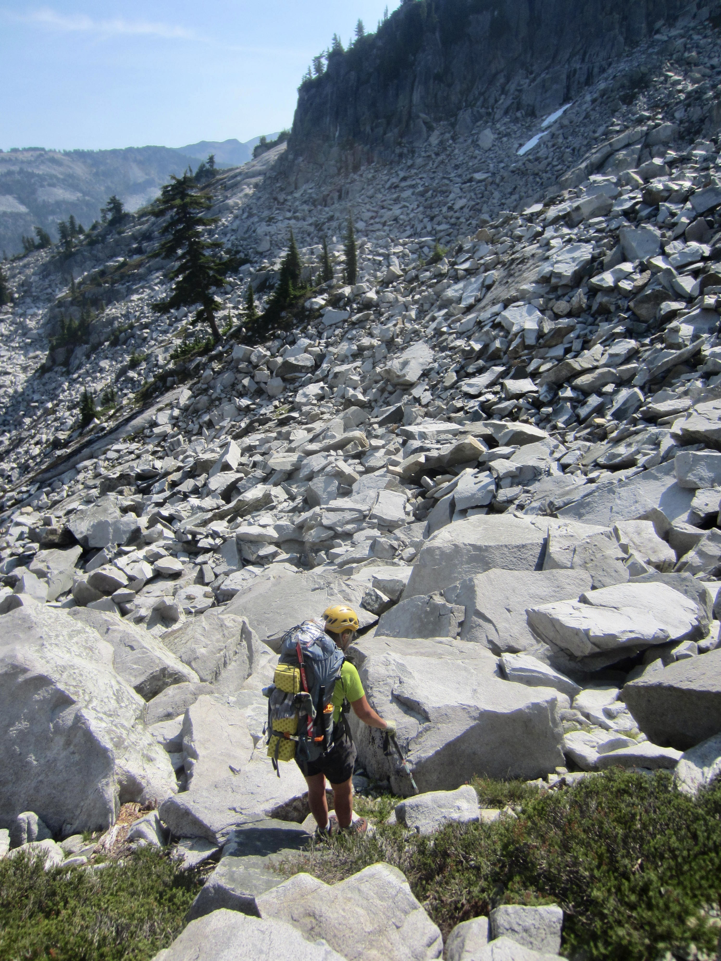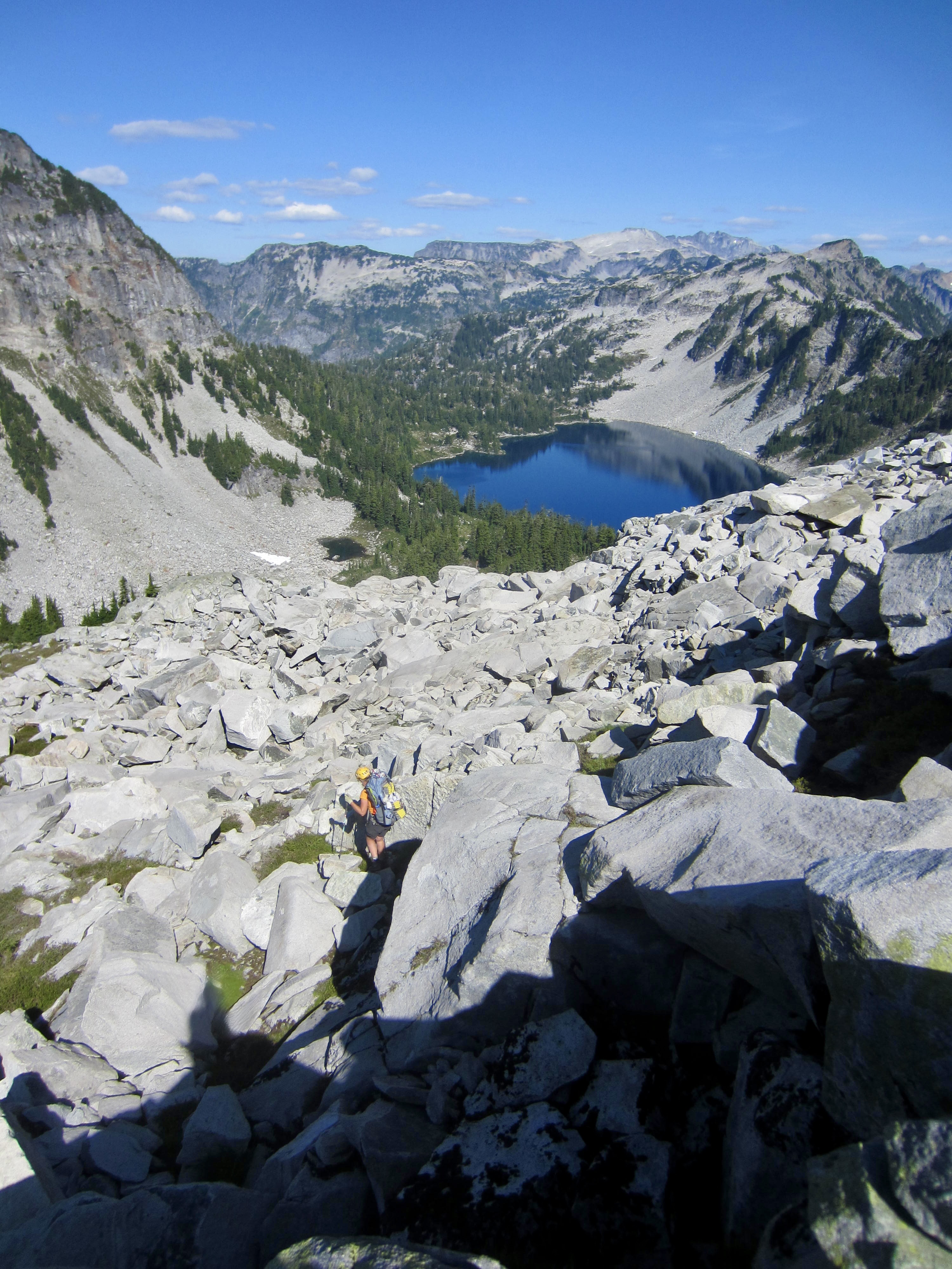 We reluctantly returned to our backpack stash and began working our way toward Chetwoot Lake. This involved lots of boulder-hopping down white talus and slithering down steep heather, all the while being tantalized by the indigo swatch of water below.