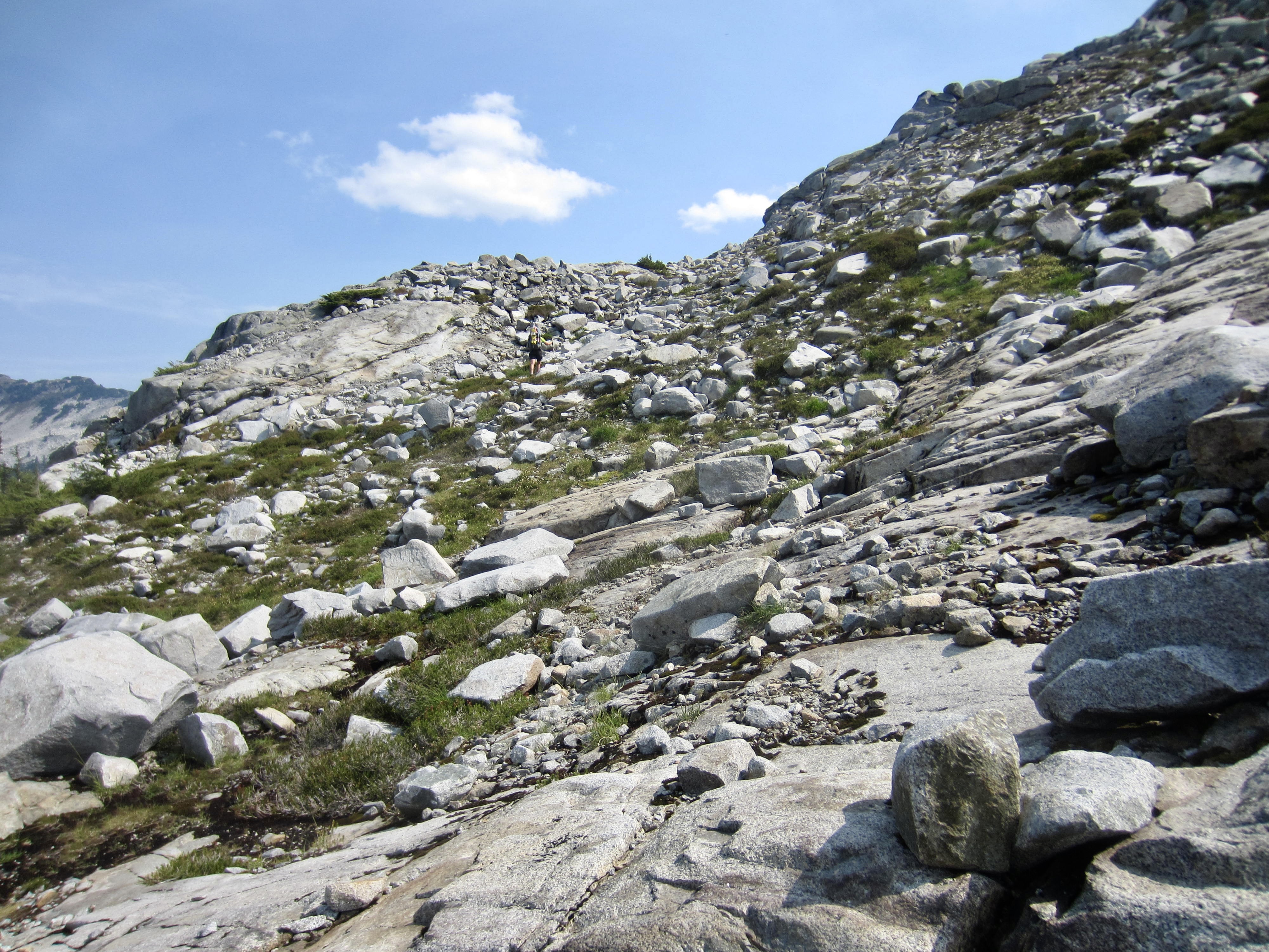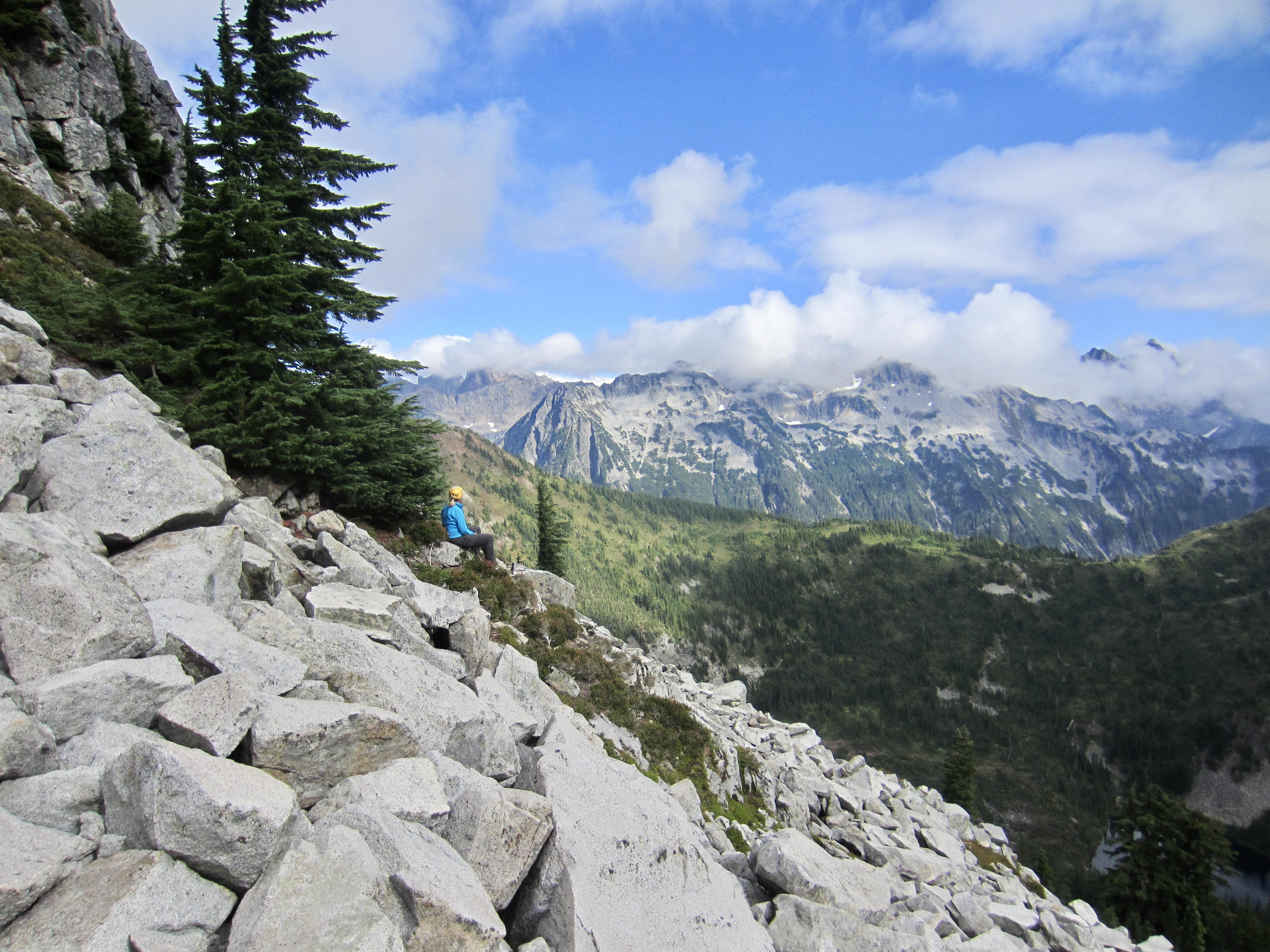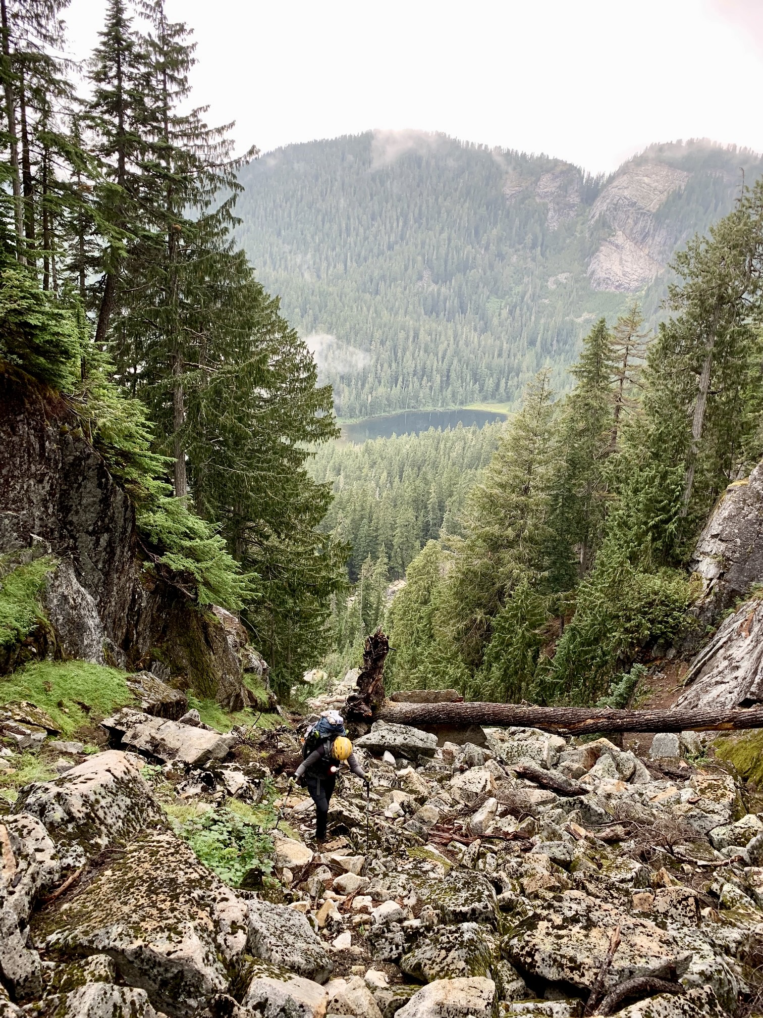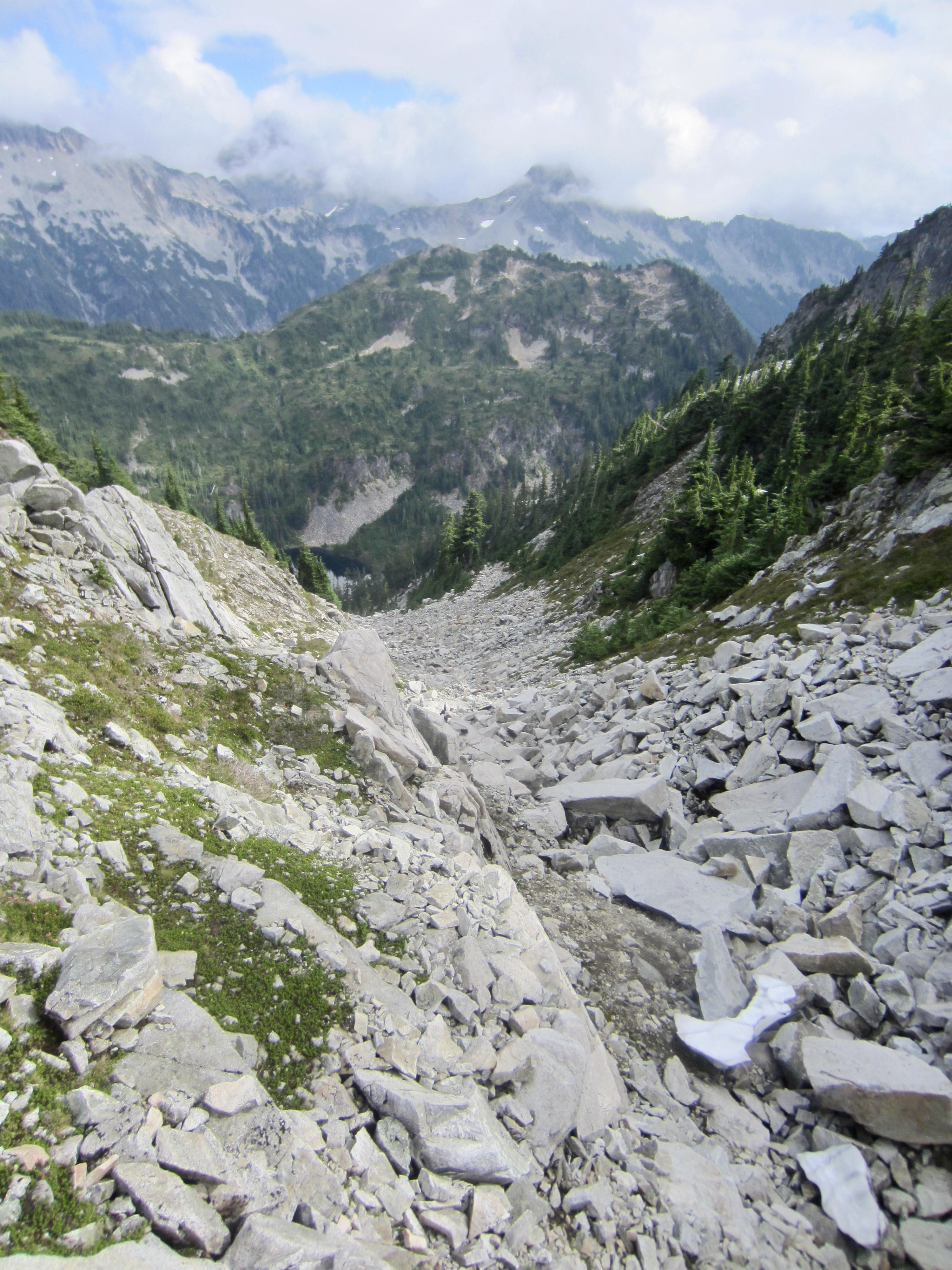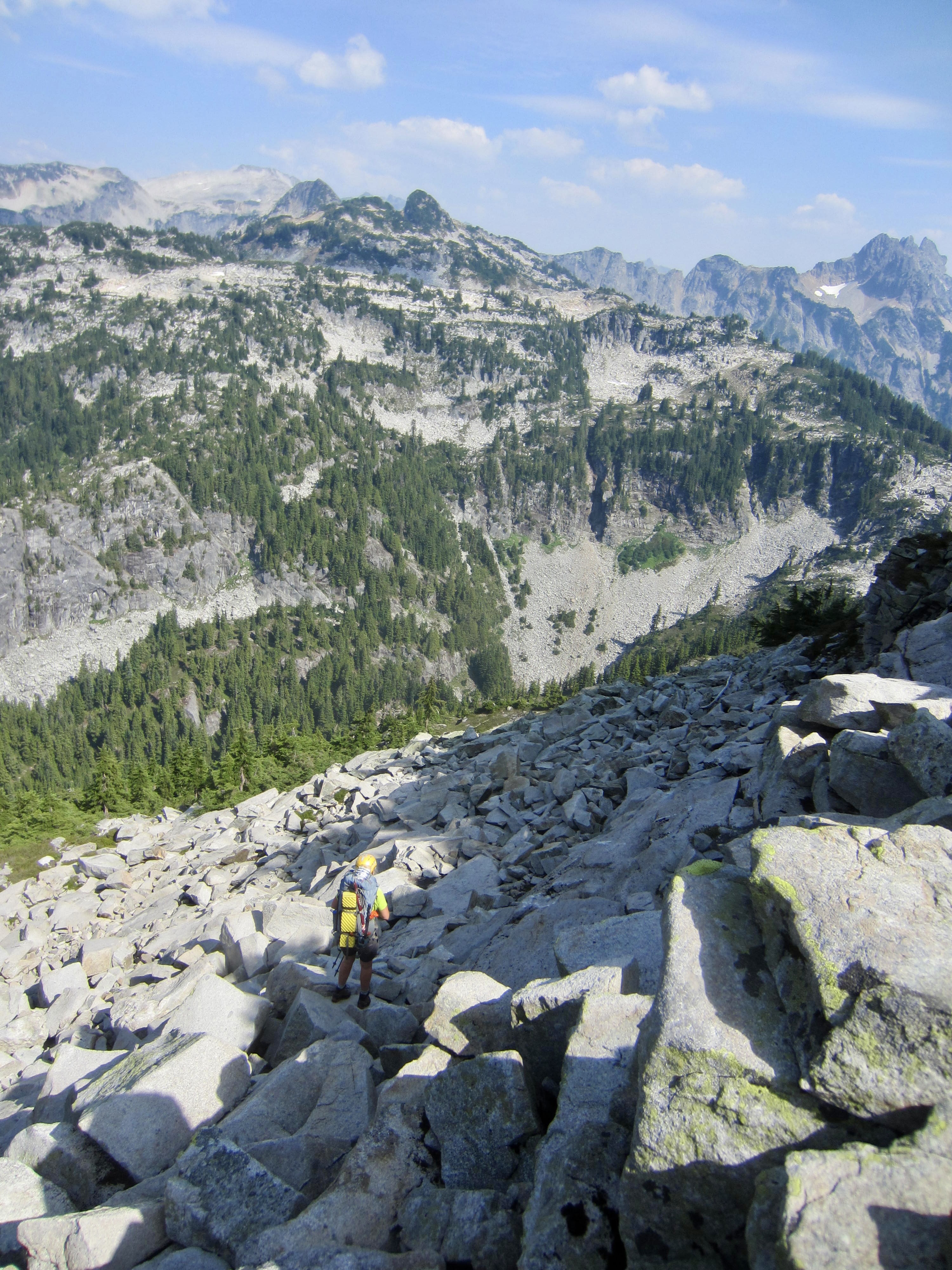 We reluctantly returned to our backpack stash and began working our way toward Chetwoot Lake. This involved lots of boulder-hopping down white talus and slithering down steep heather, all the while being tantalized by the indigo swatch of water below.