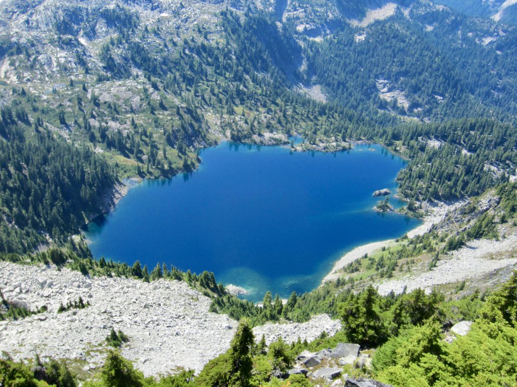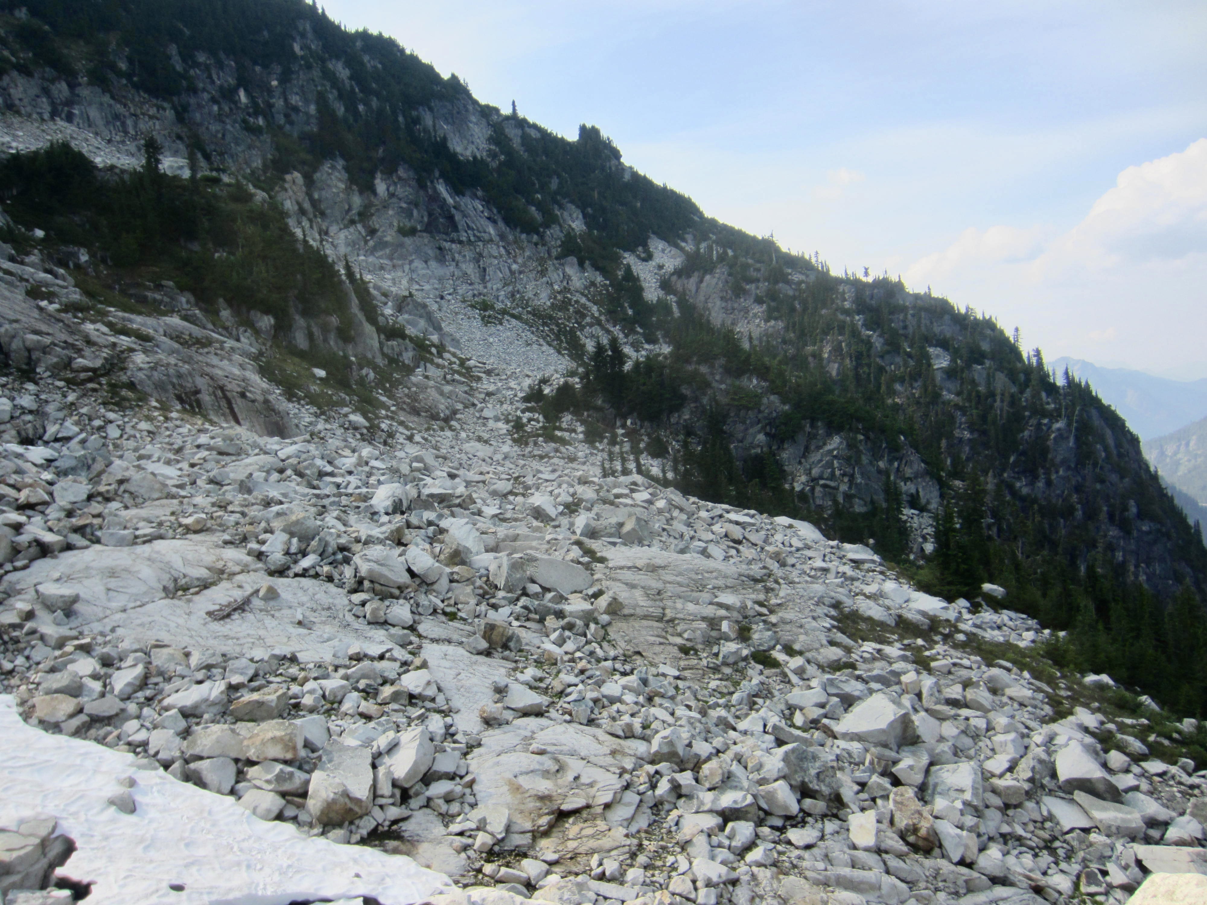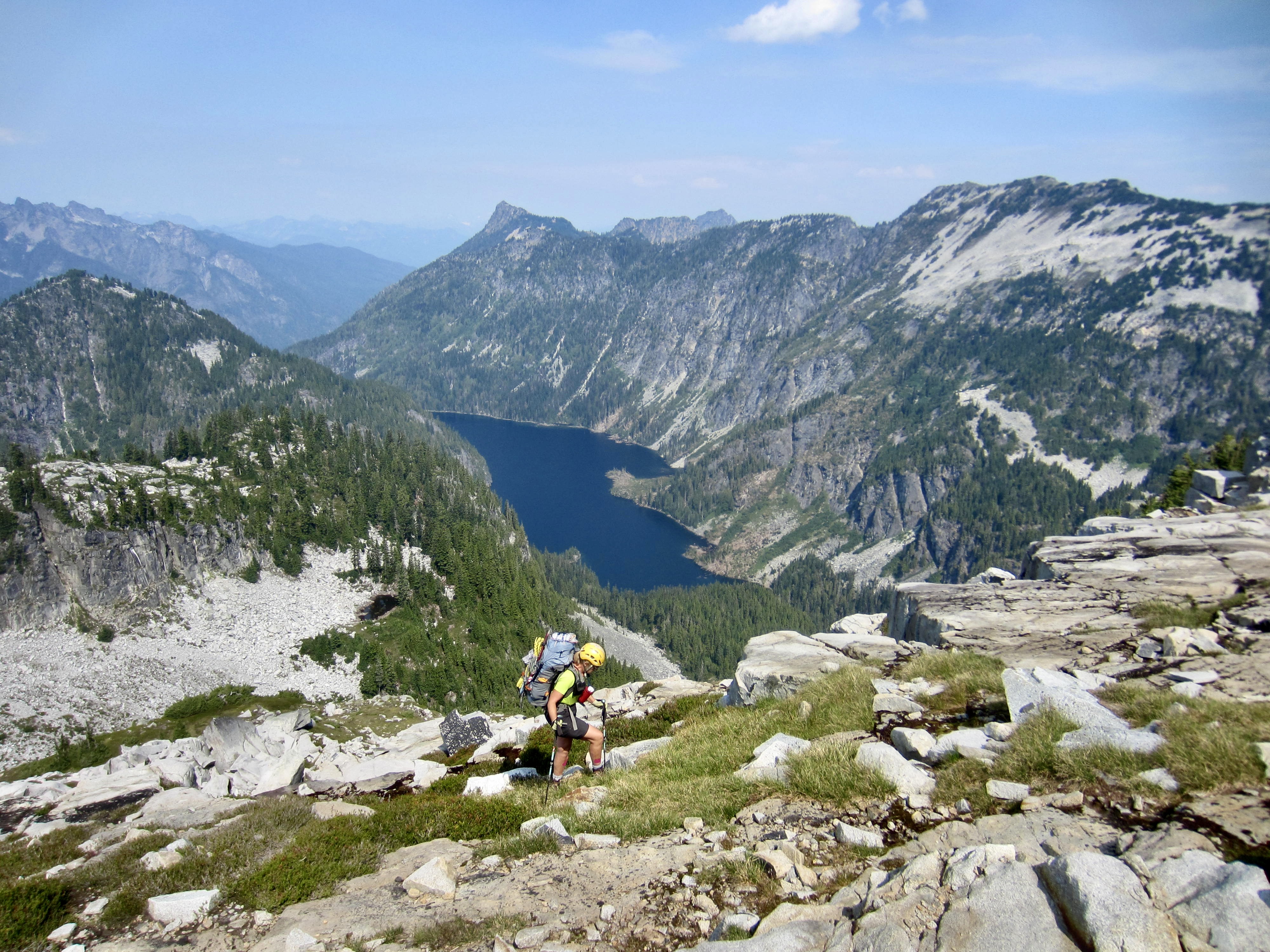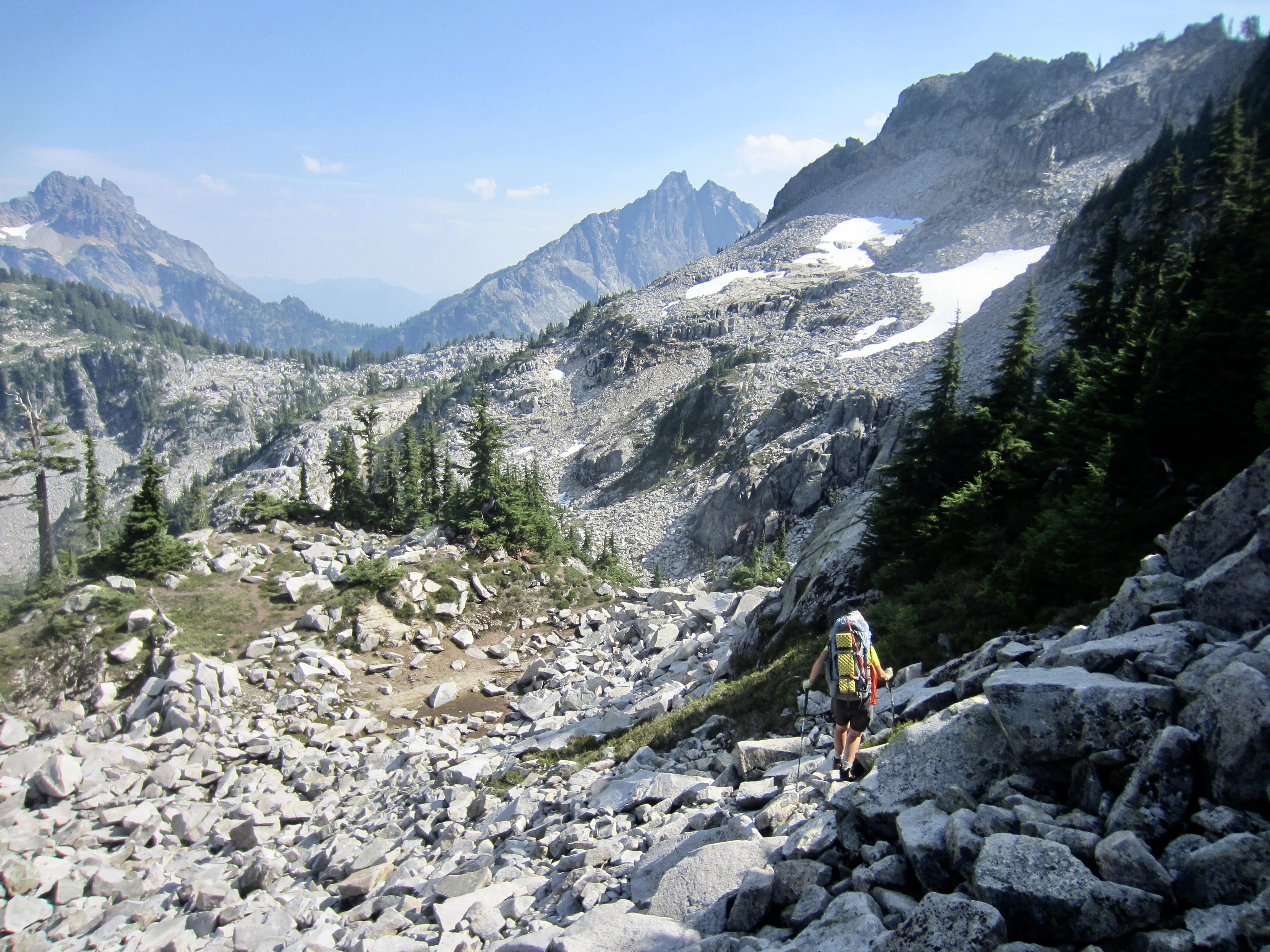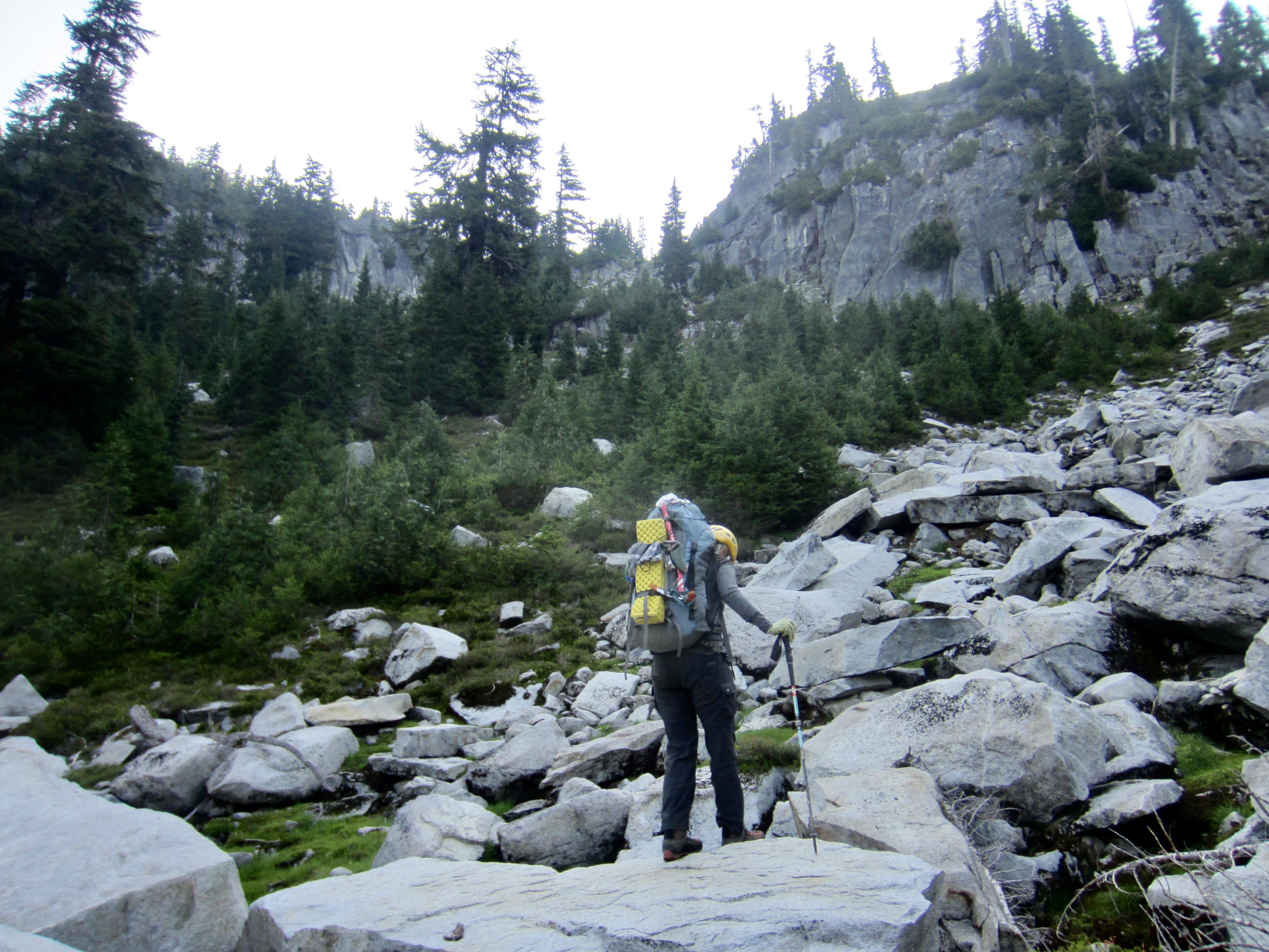 We reluctantly returned to our backpack stash and began working our way toward Chetwoot Lake. This involved lots of boulder-hopping down white talus and slithering down steep heather, all the while being tantalized by the indigo swatch of water below.