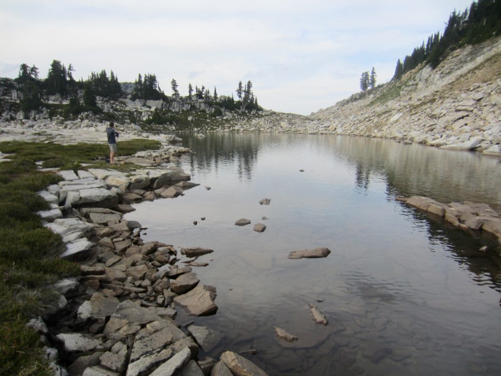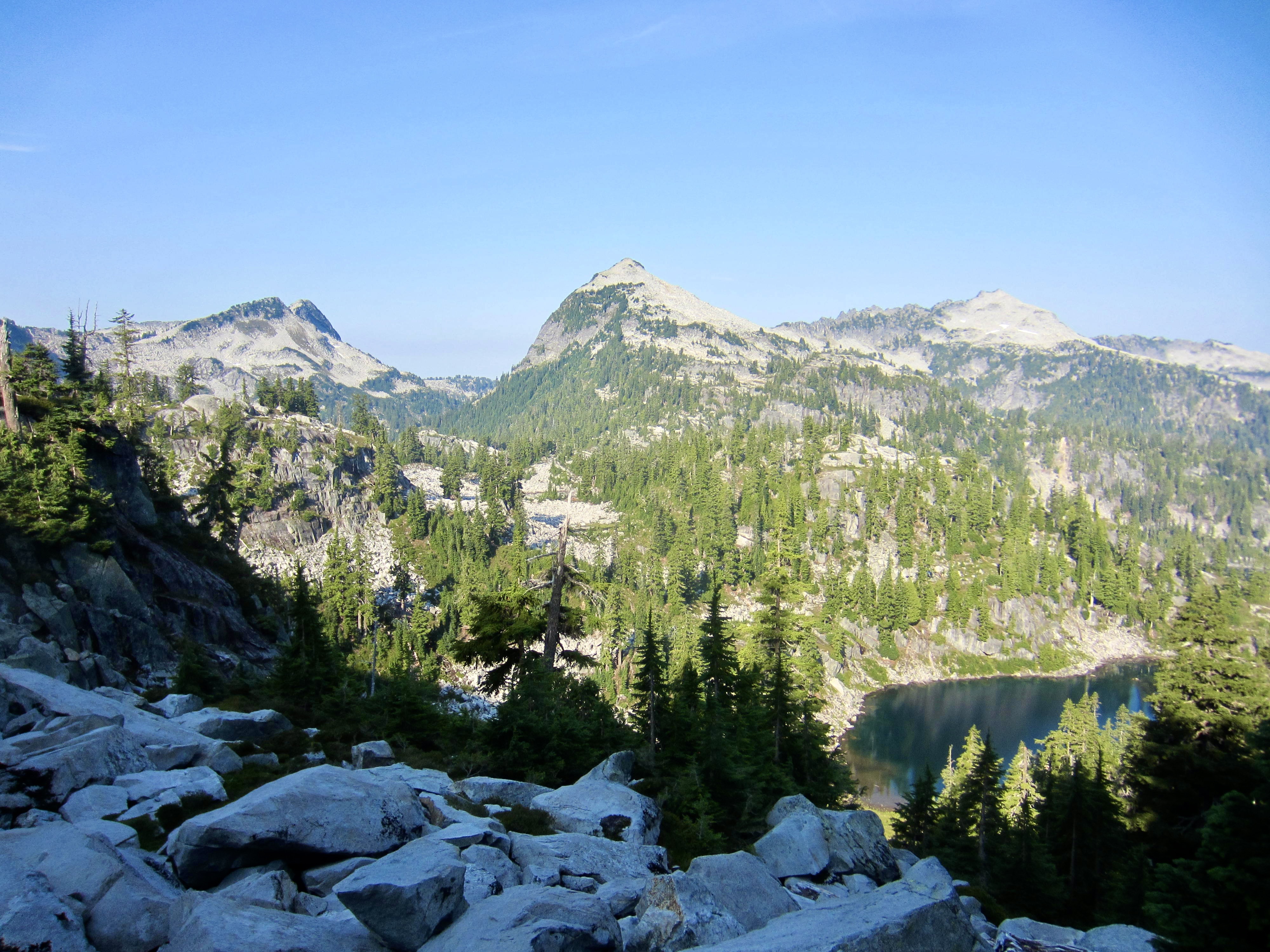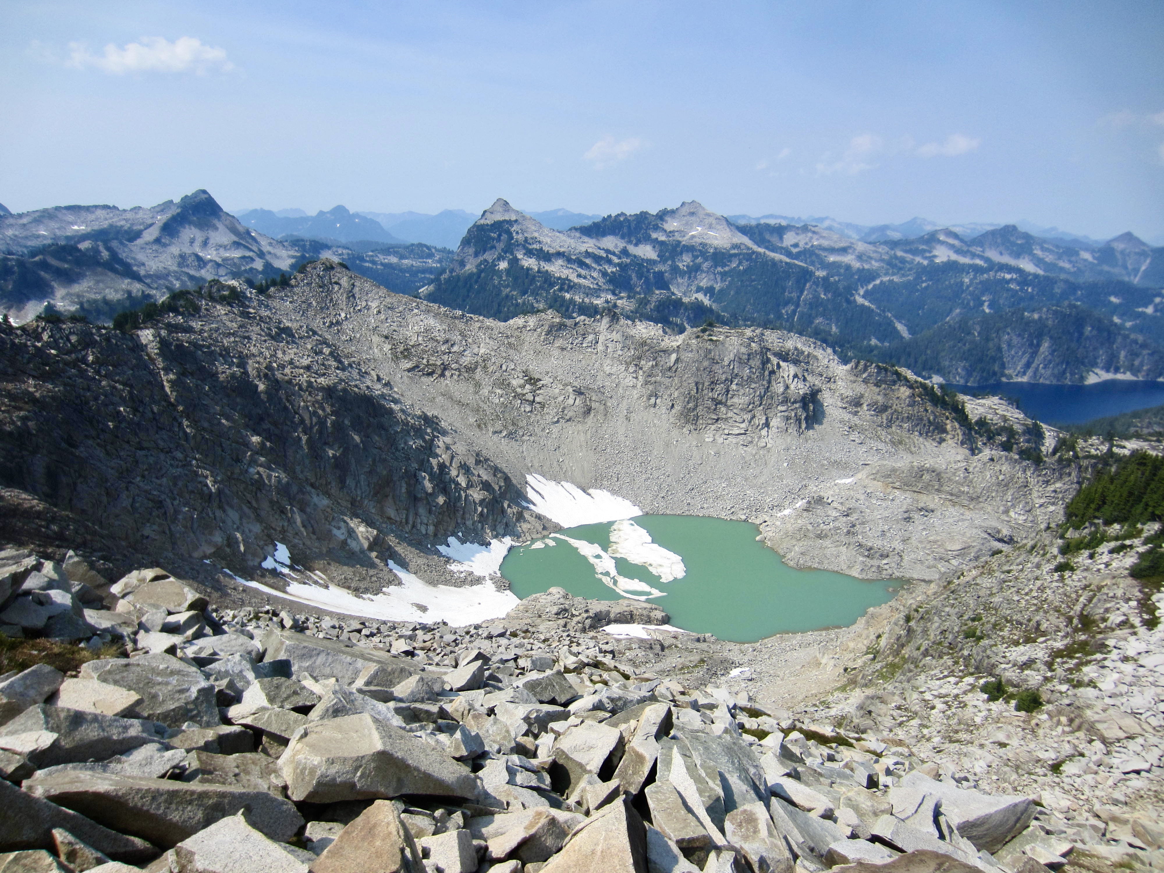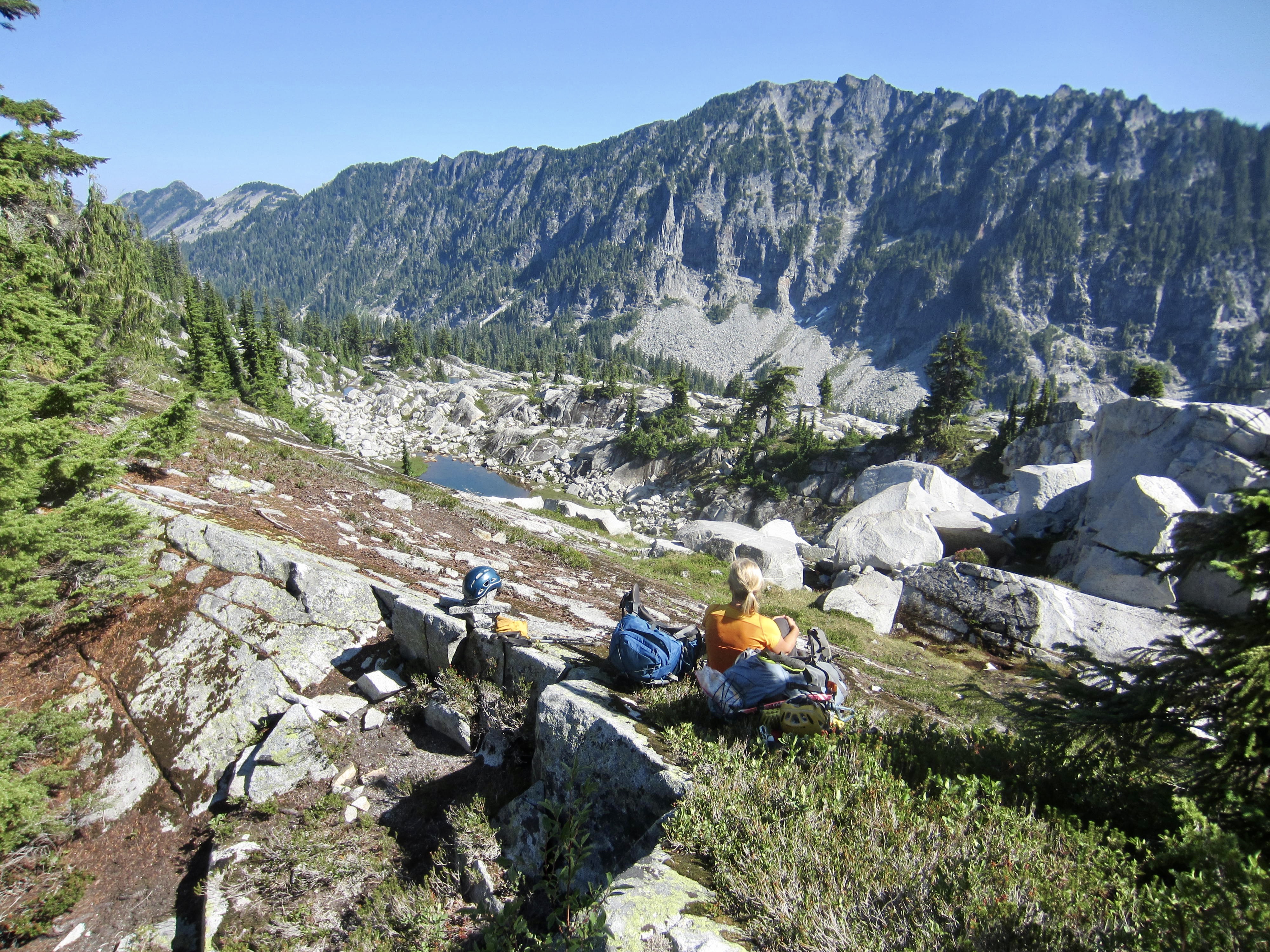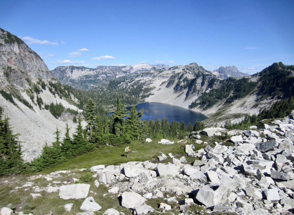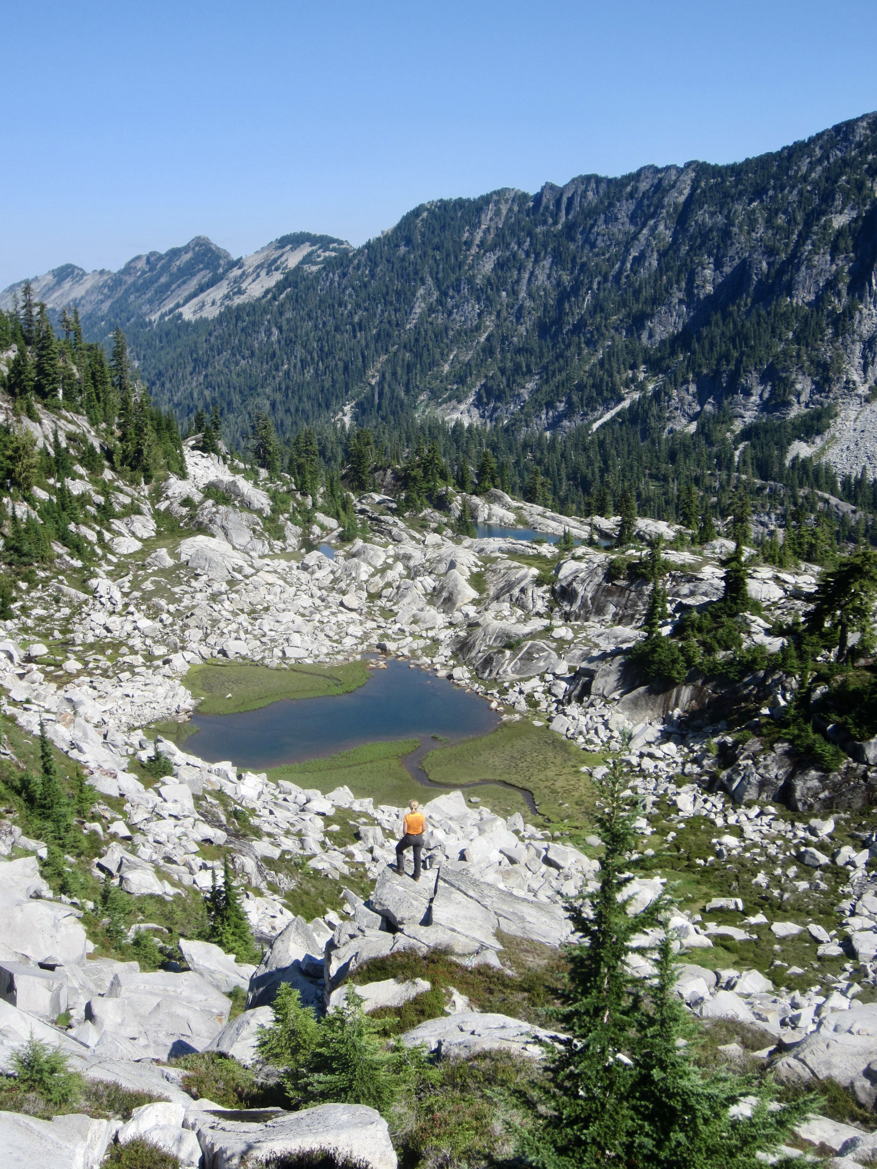 We reluctantly returned to our backpack stash and began working our way toward Chetwoot Lake. This involved lots of boulder-hopping down white talus and slithering down steep heather, all the while being tantalized by the indigo swatch of water below.