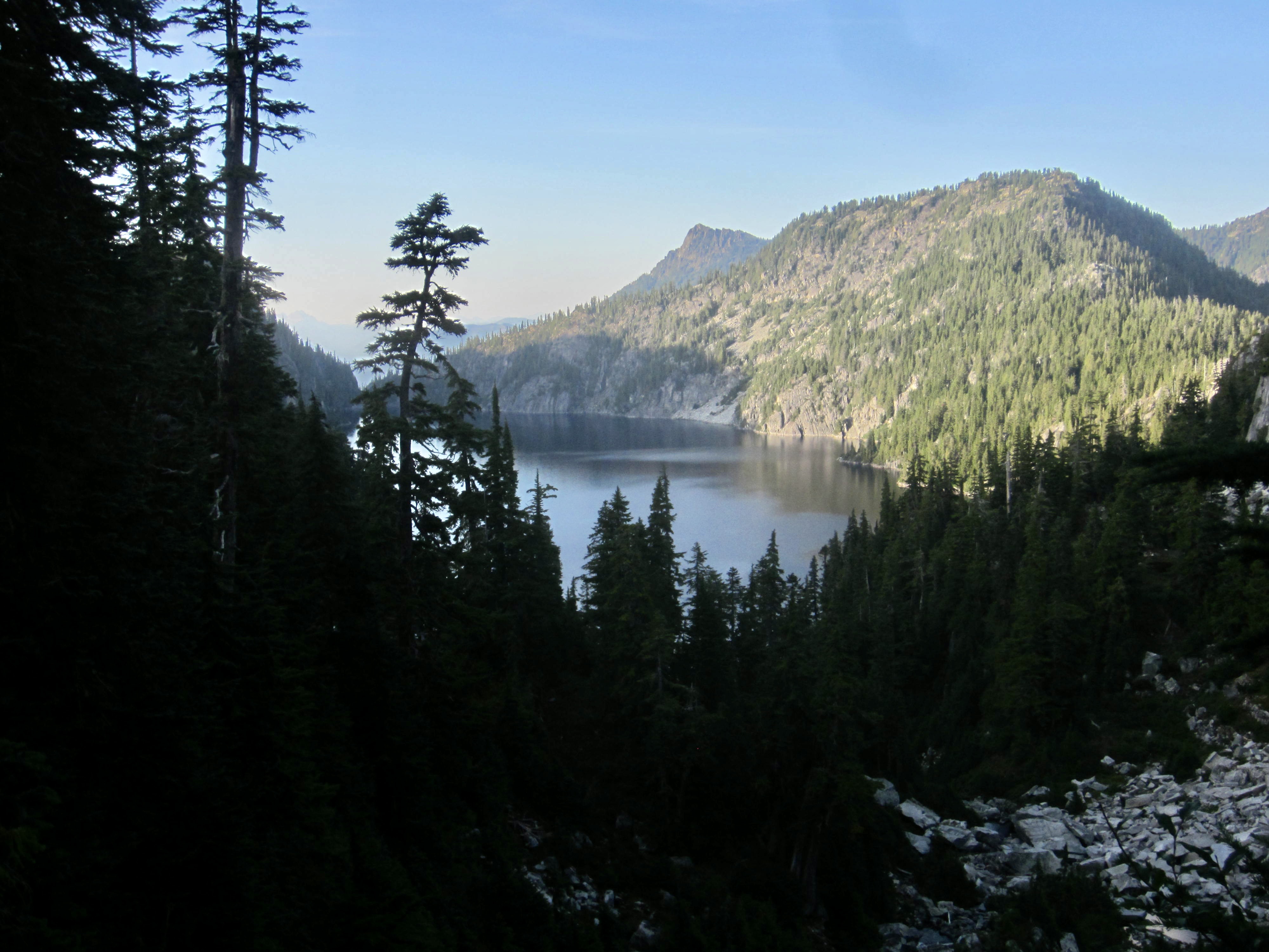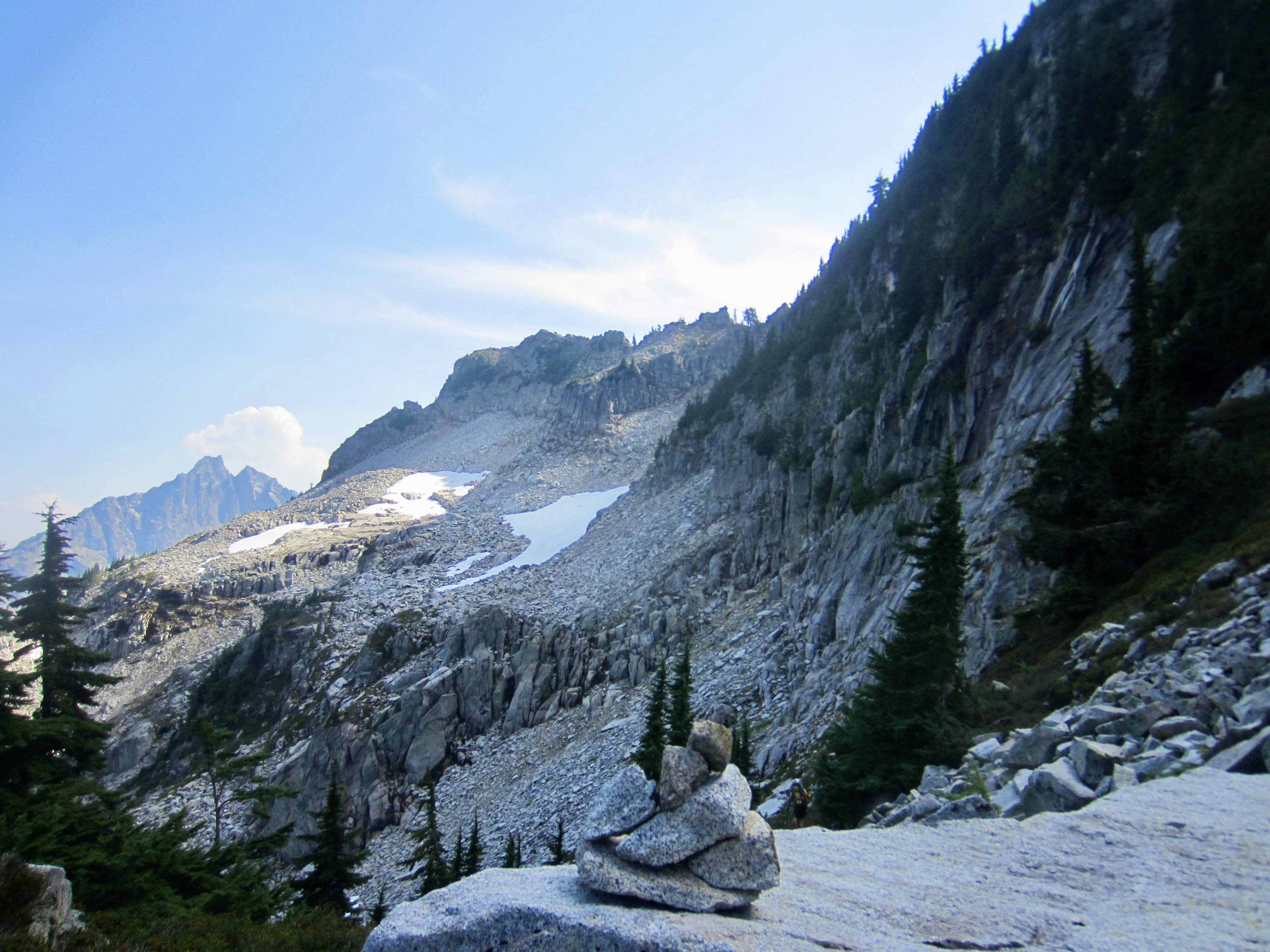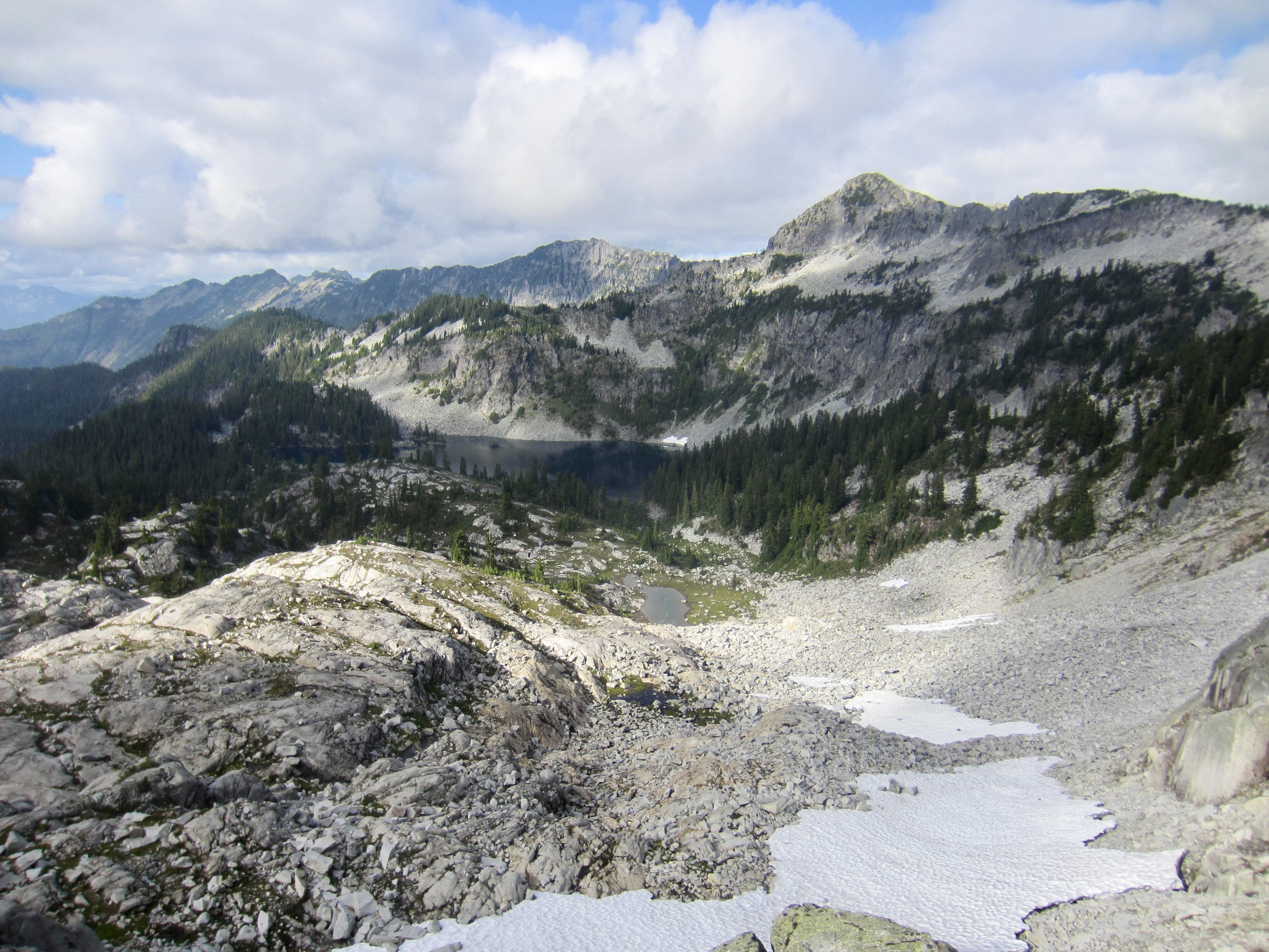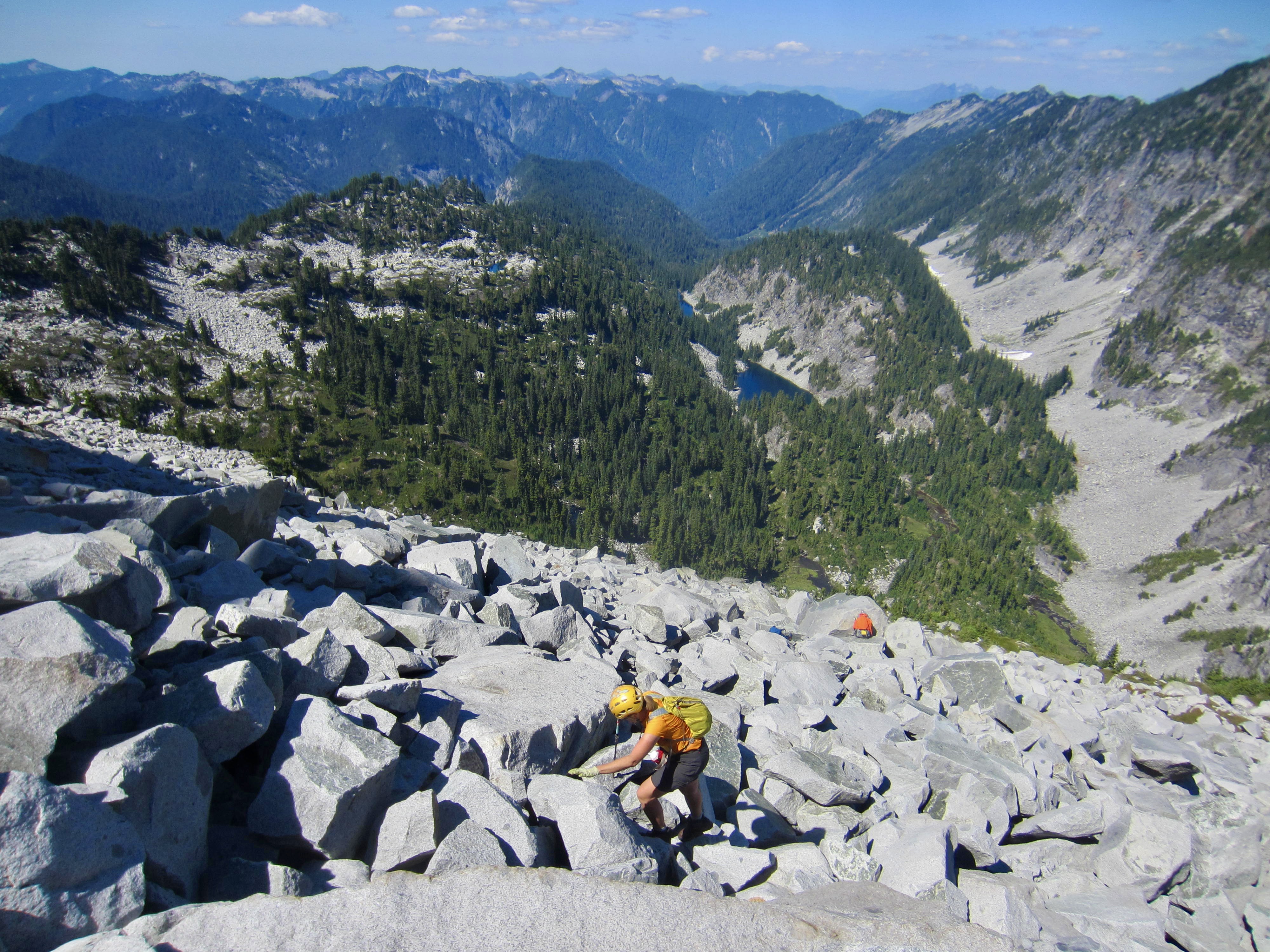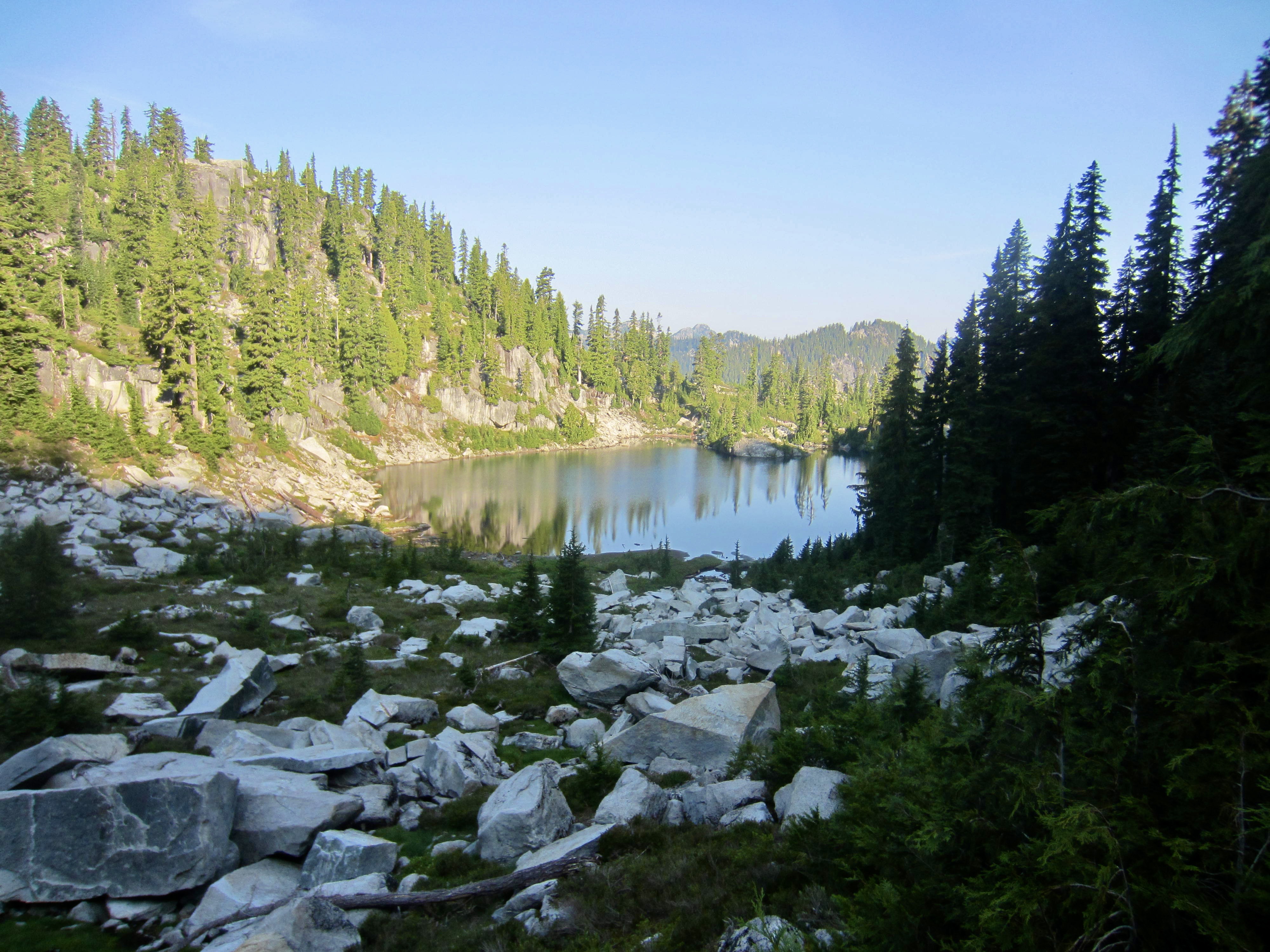 We reluctantly returned to our backpack stash and began working our way toward Chetwoot Lake. This involved lots of boulder-hopping down white talus and slithering down steep heather, all the while being tantalized by the indigo swatch of water below.