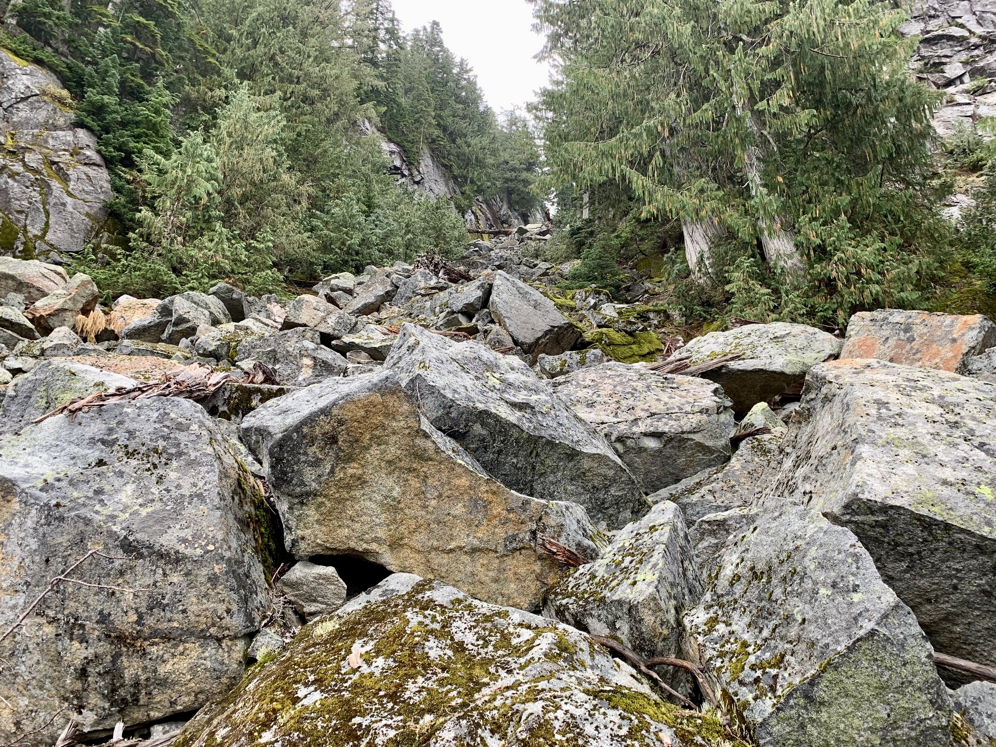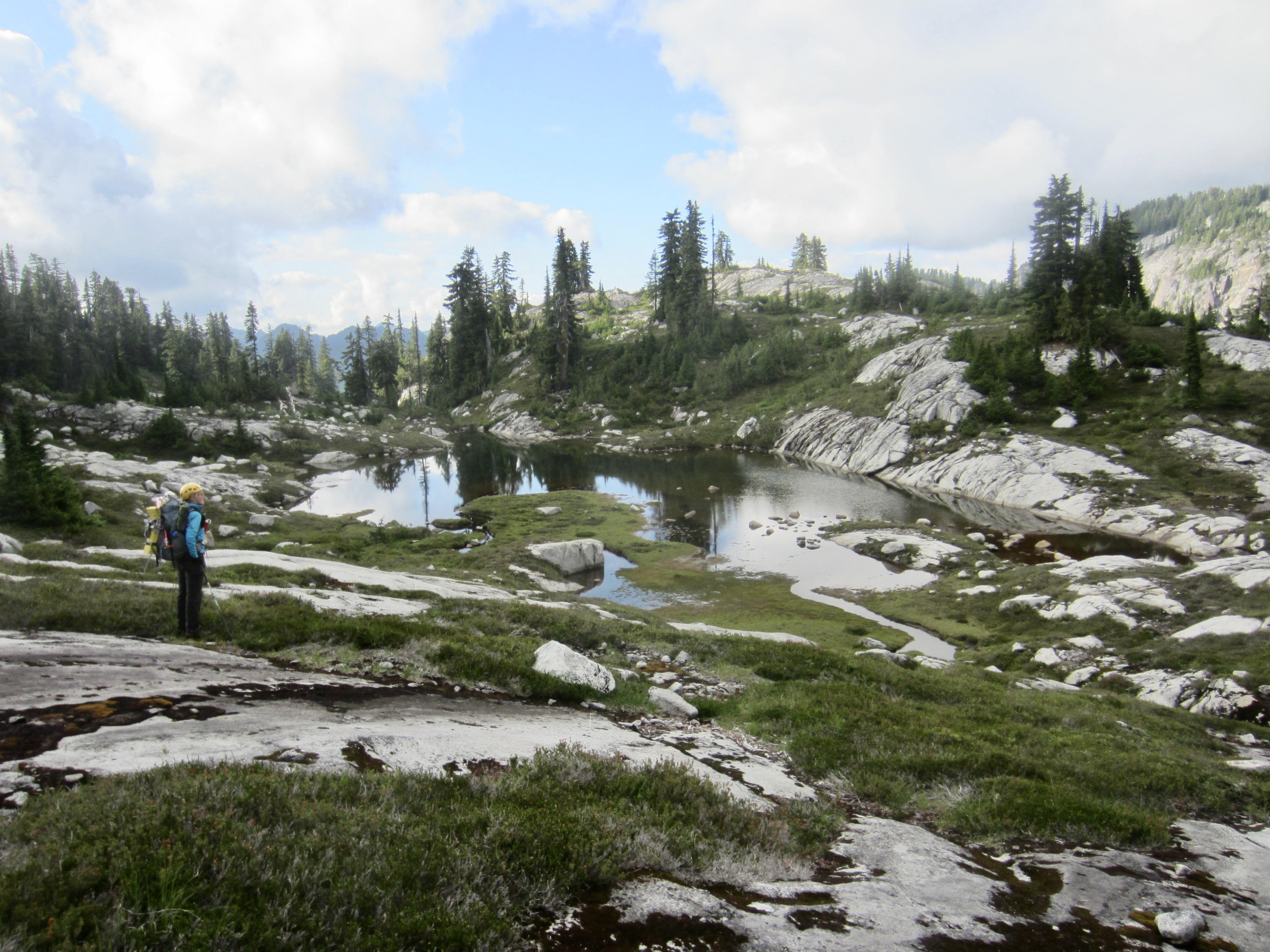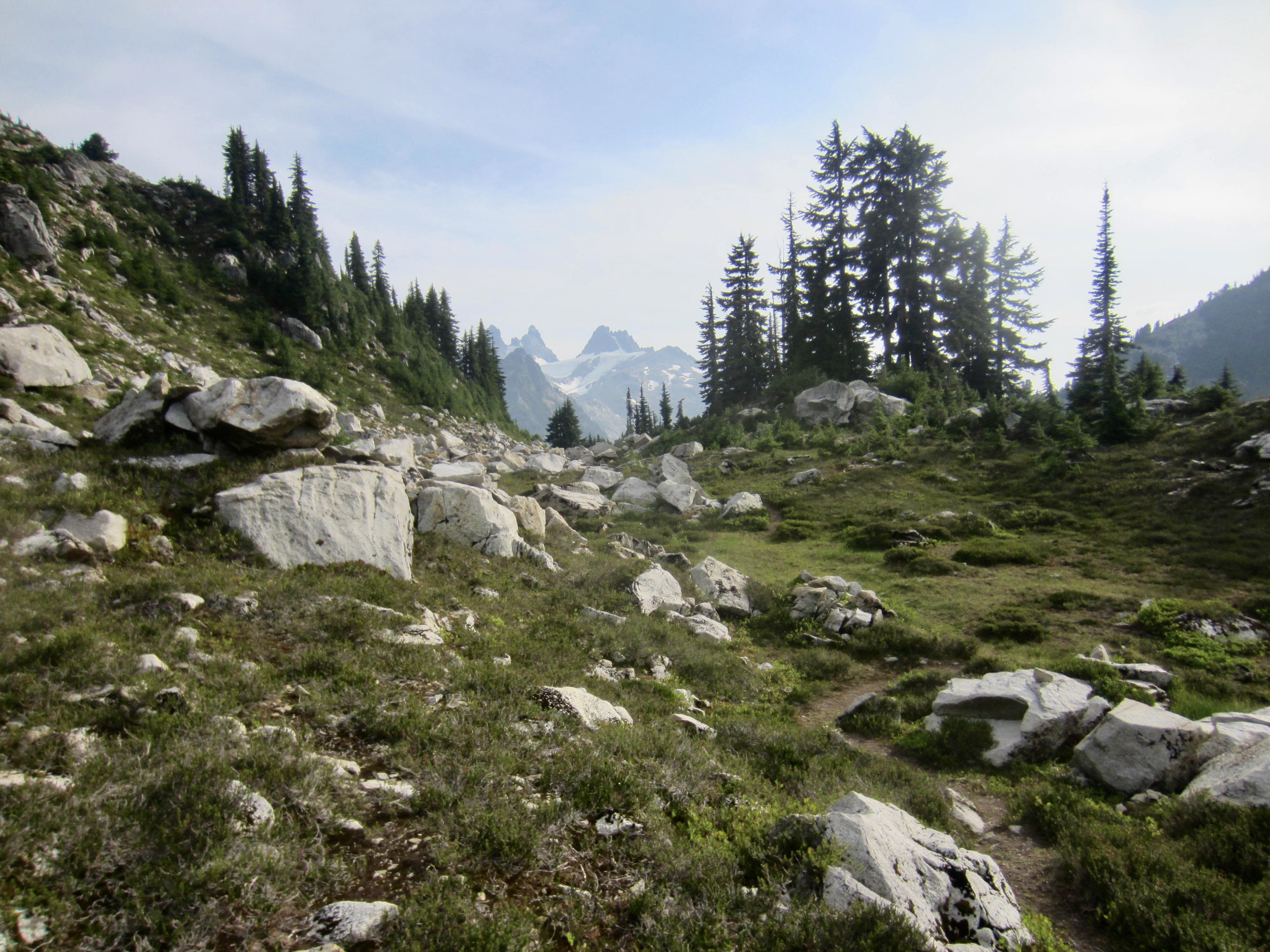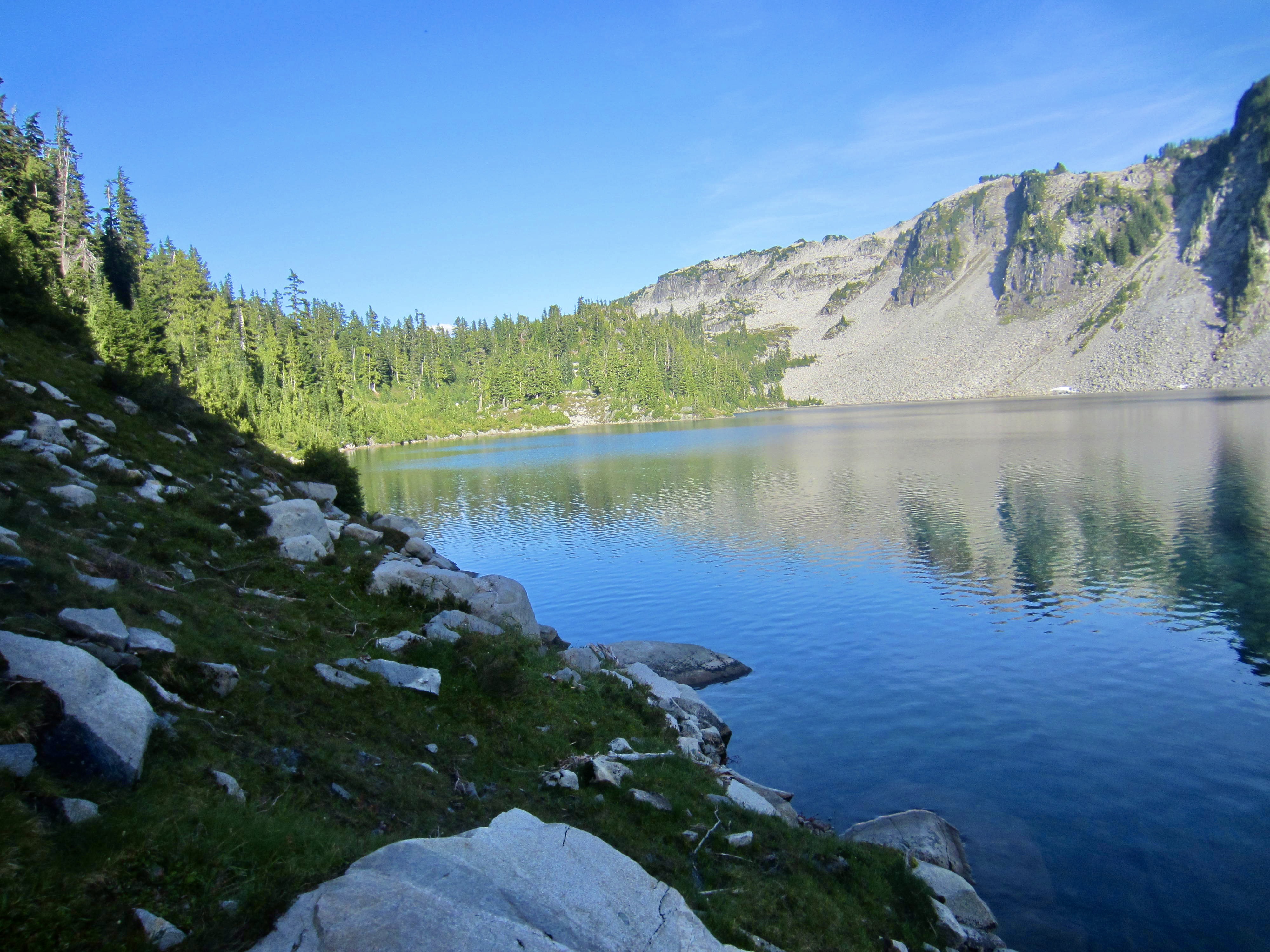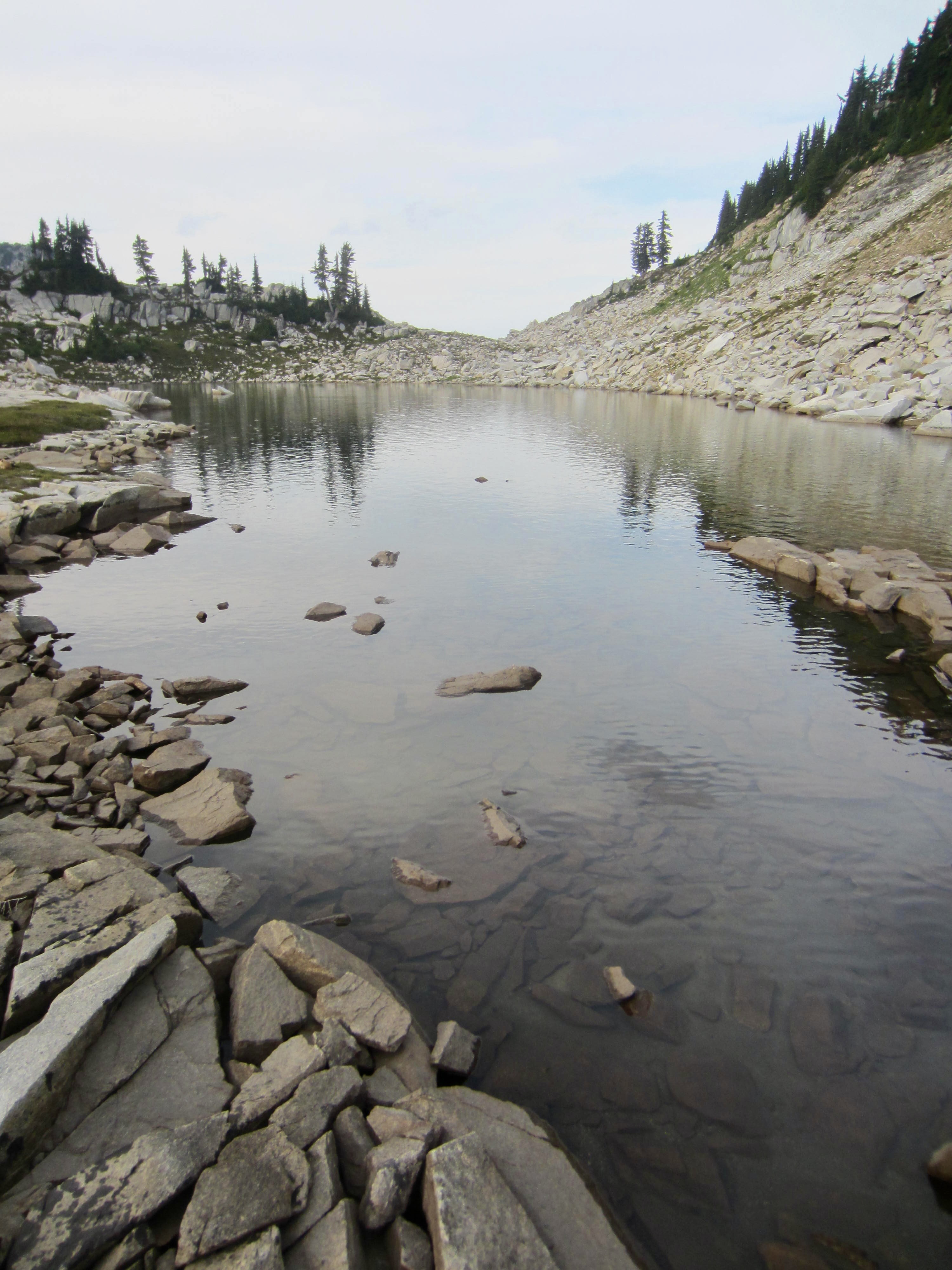 We reluctantly returned to our backpack stash and began working our way toward Chetwoot Lake. This involved lots of boulder-hopping down white talus and slithering down steep heather, all the while being tantalized by the indigo swatch of water below.