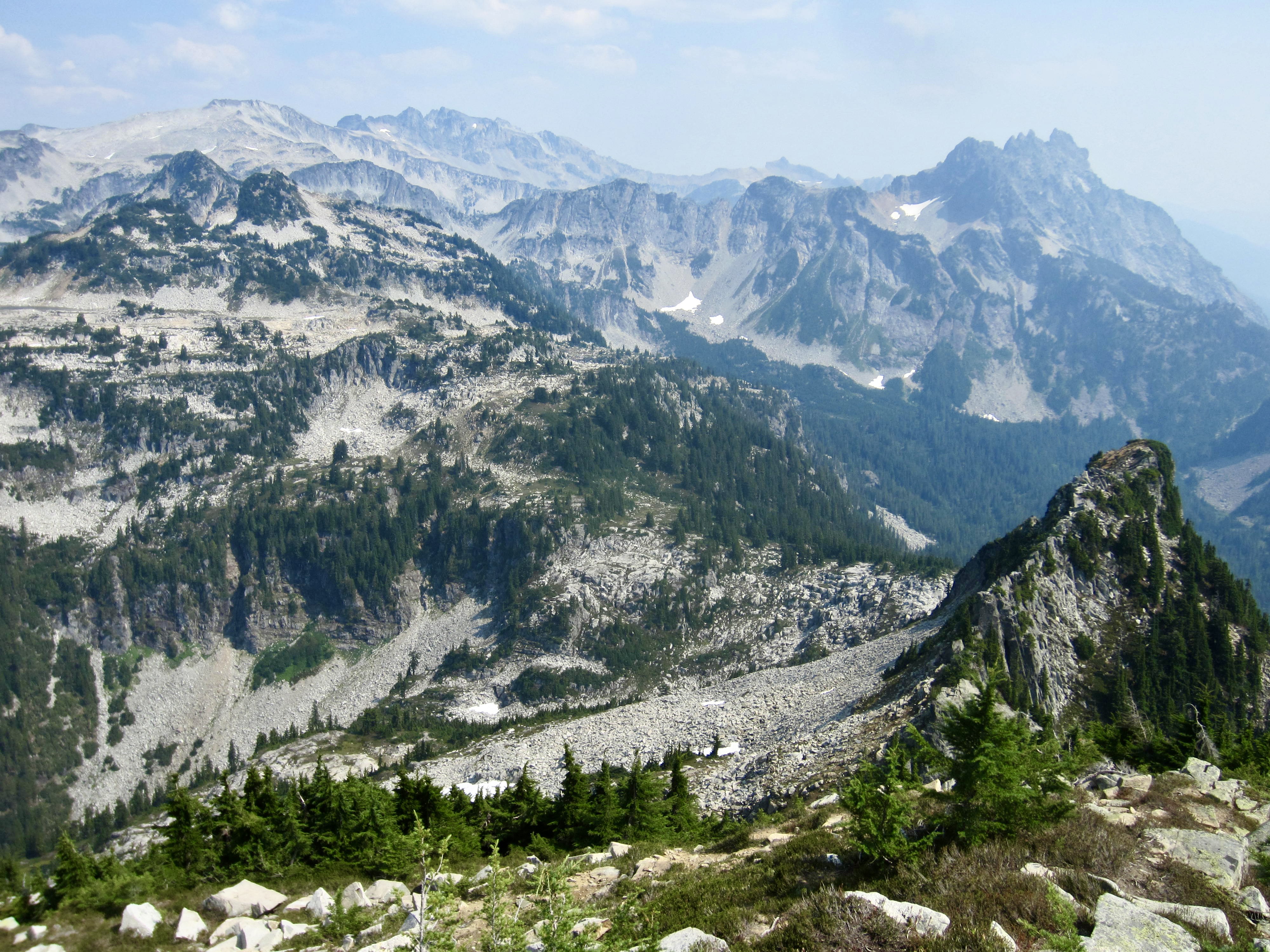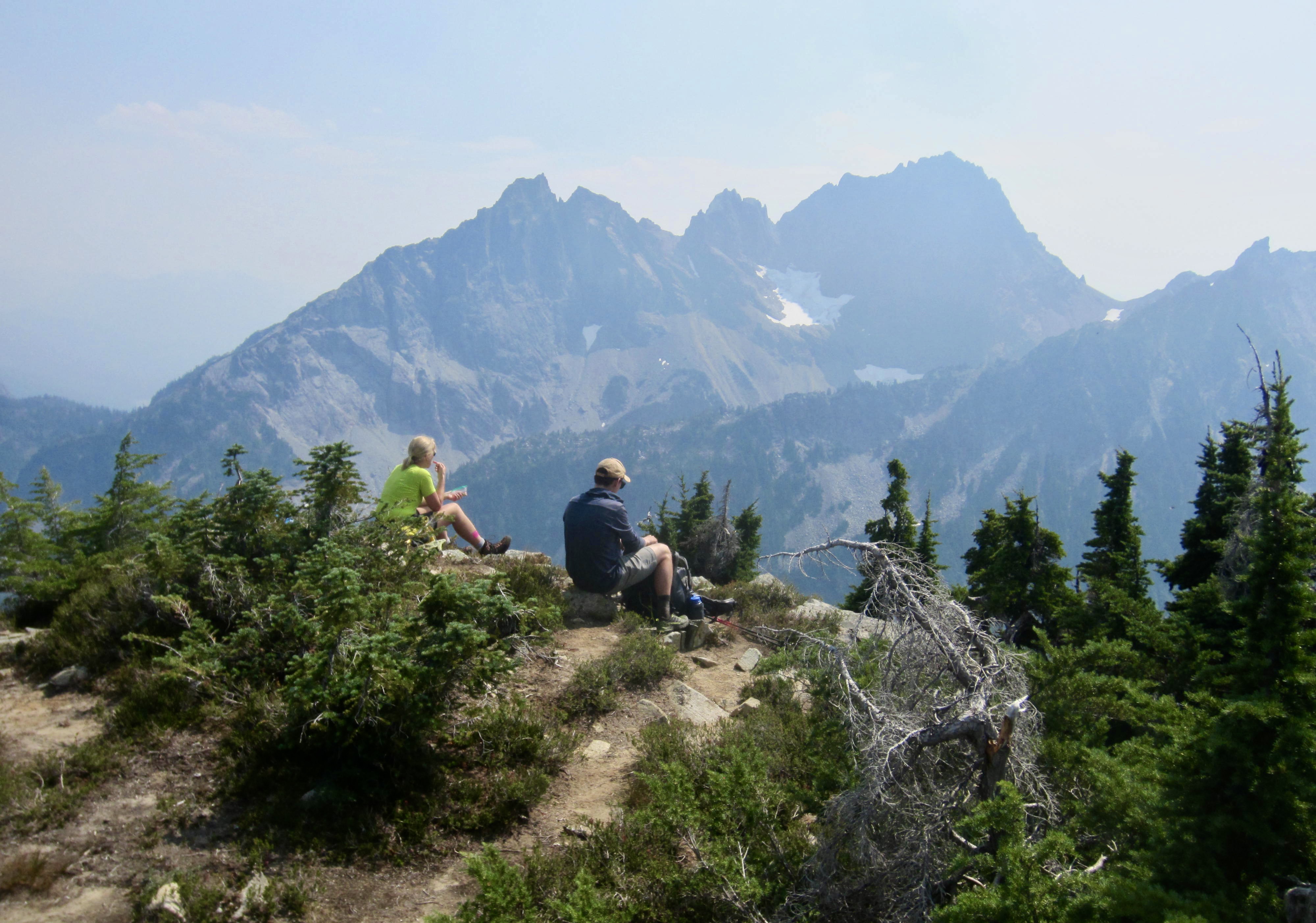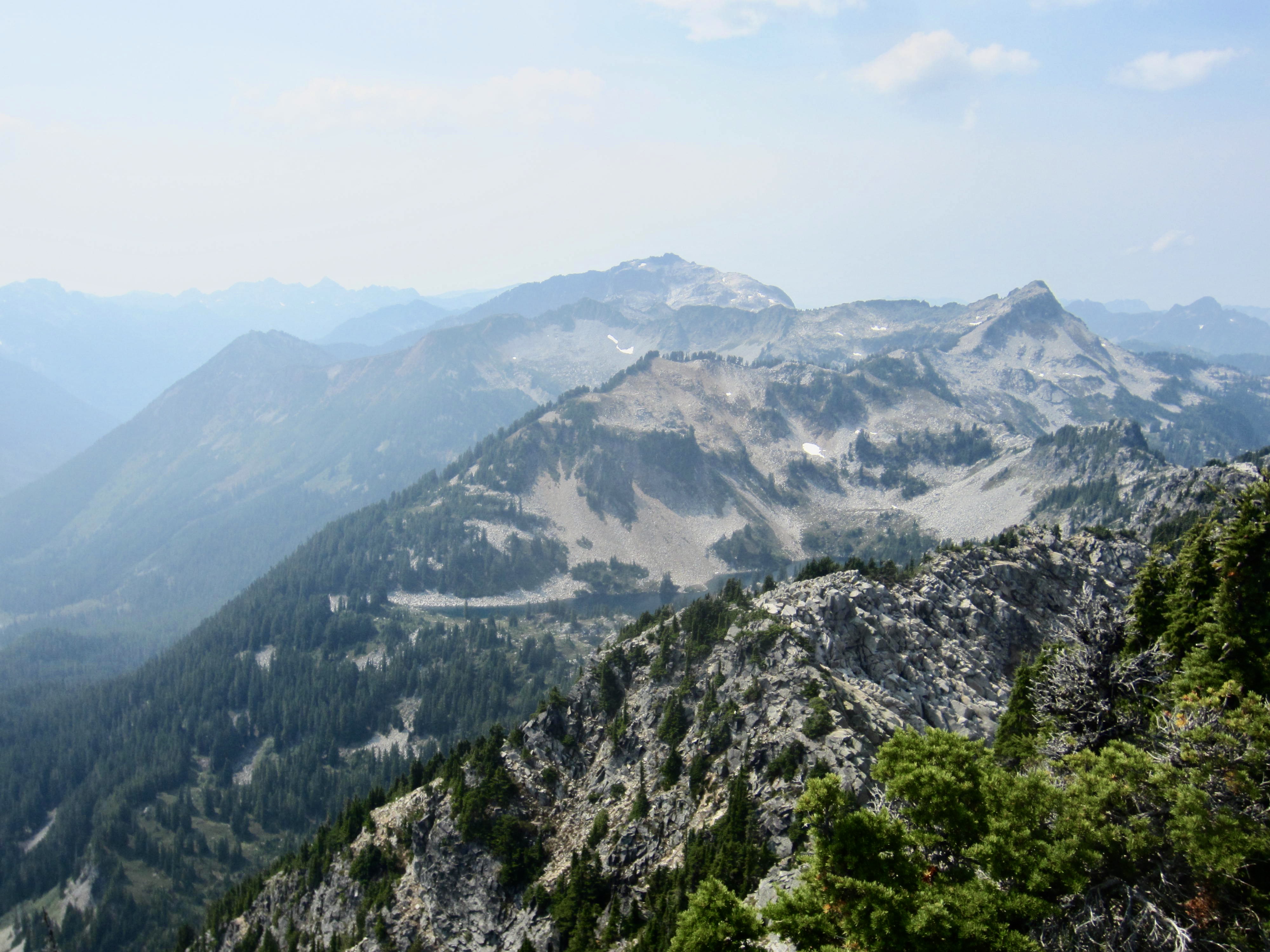 After being alone in the mountains for the last three days, we were a bit surprised to see another person on the summit. We struck up a conversation and learned that he was Andrew, a tech worker from Colorado. He had started at the West Fork Foss River Trailhead yesterday and was doing the shorter, more popular version of the Alpine Lakes Traverse. Unfortunately for all of us, wildfire smoke had now greatly diminished the long-range visibility from this splendid viewpoint.