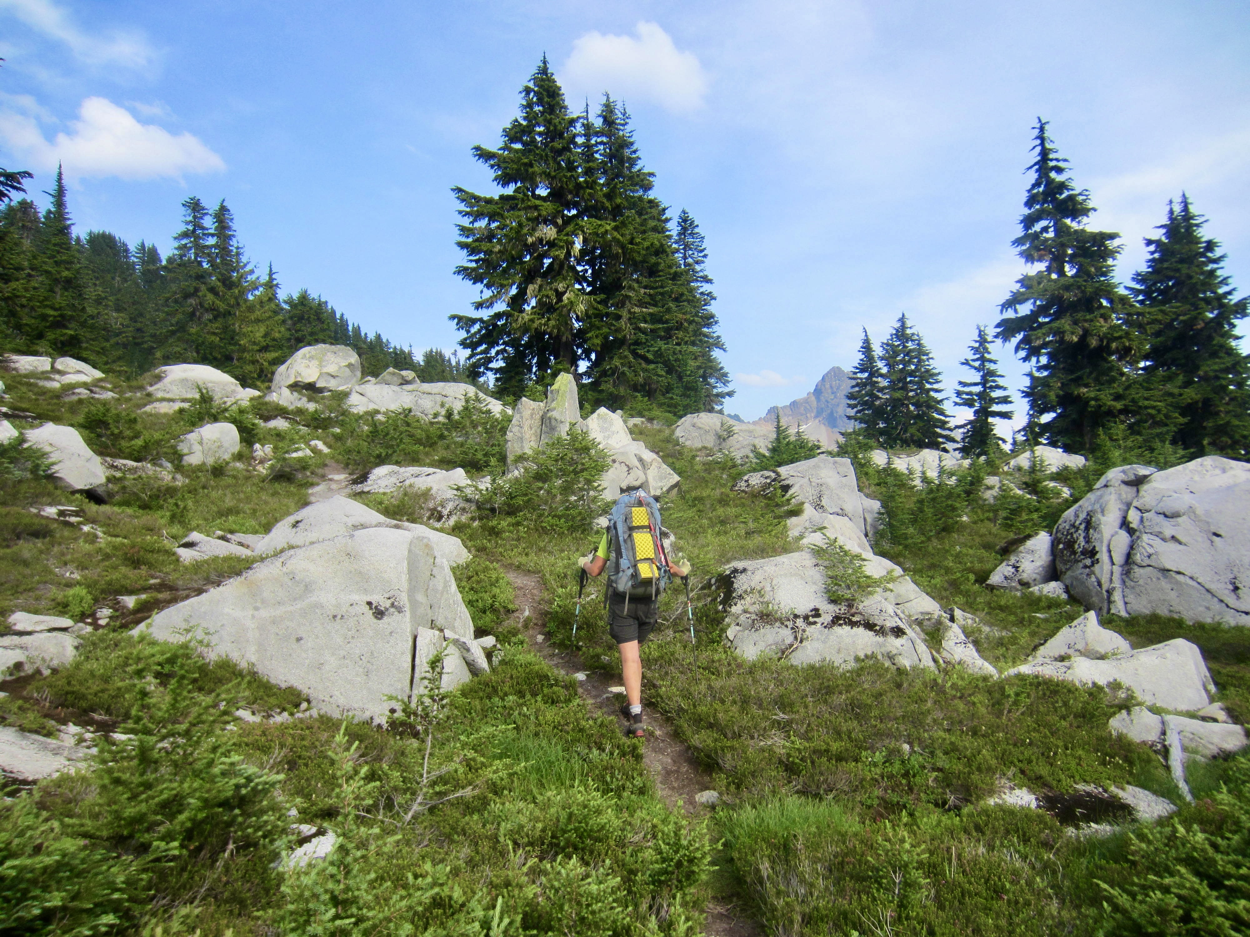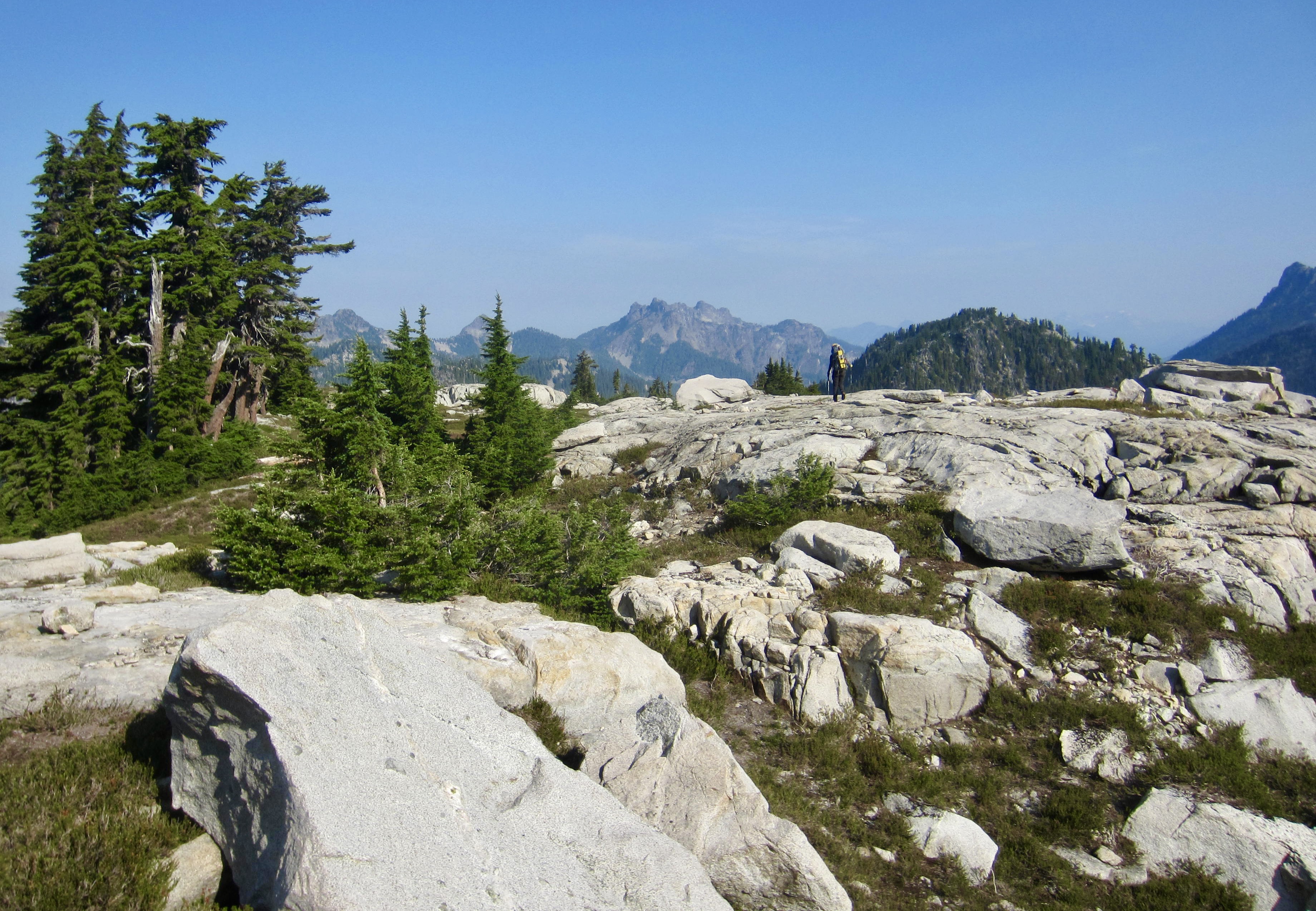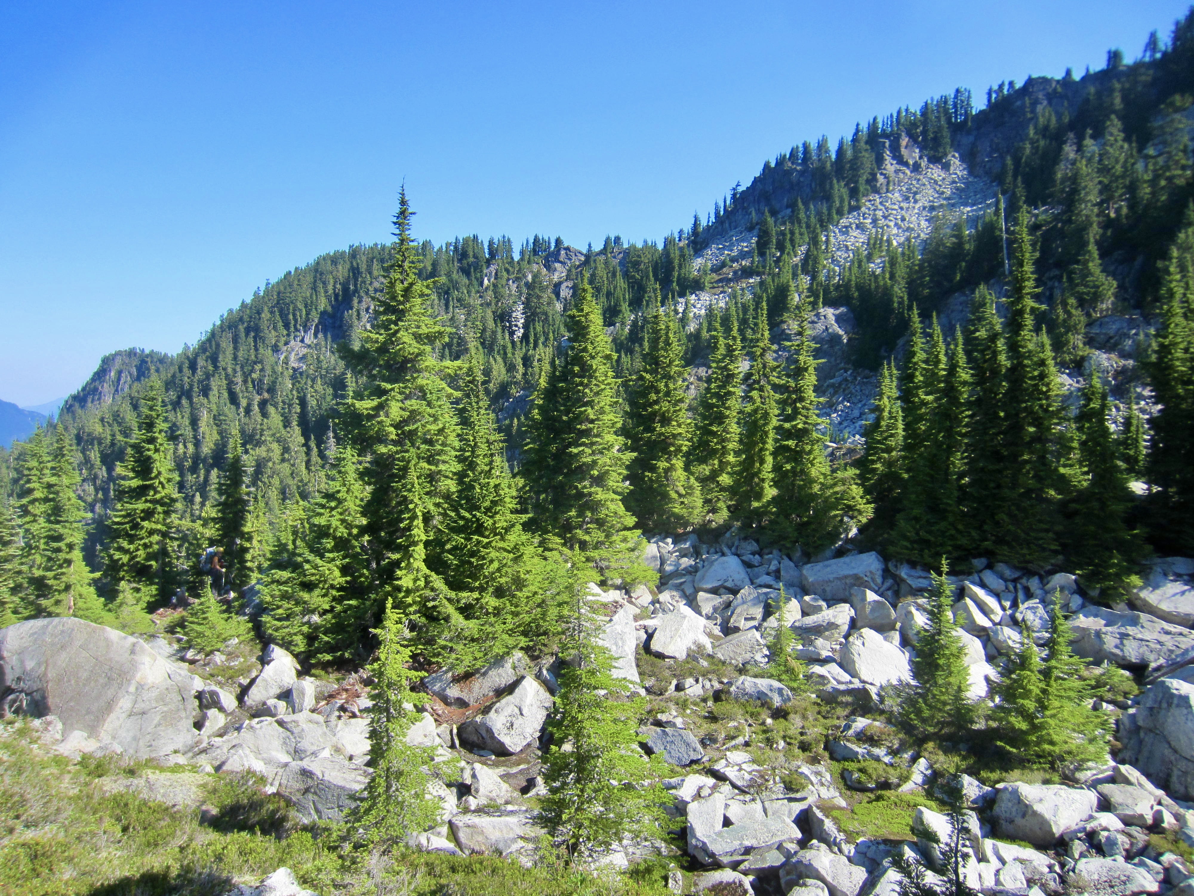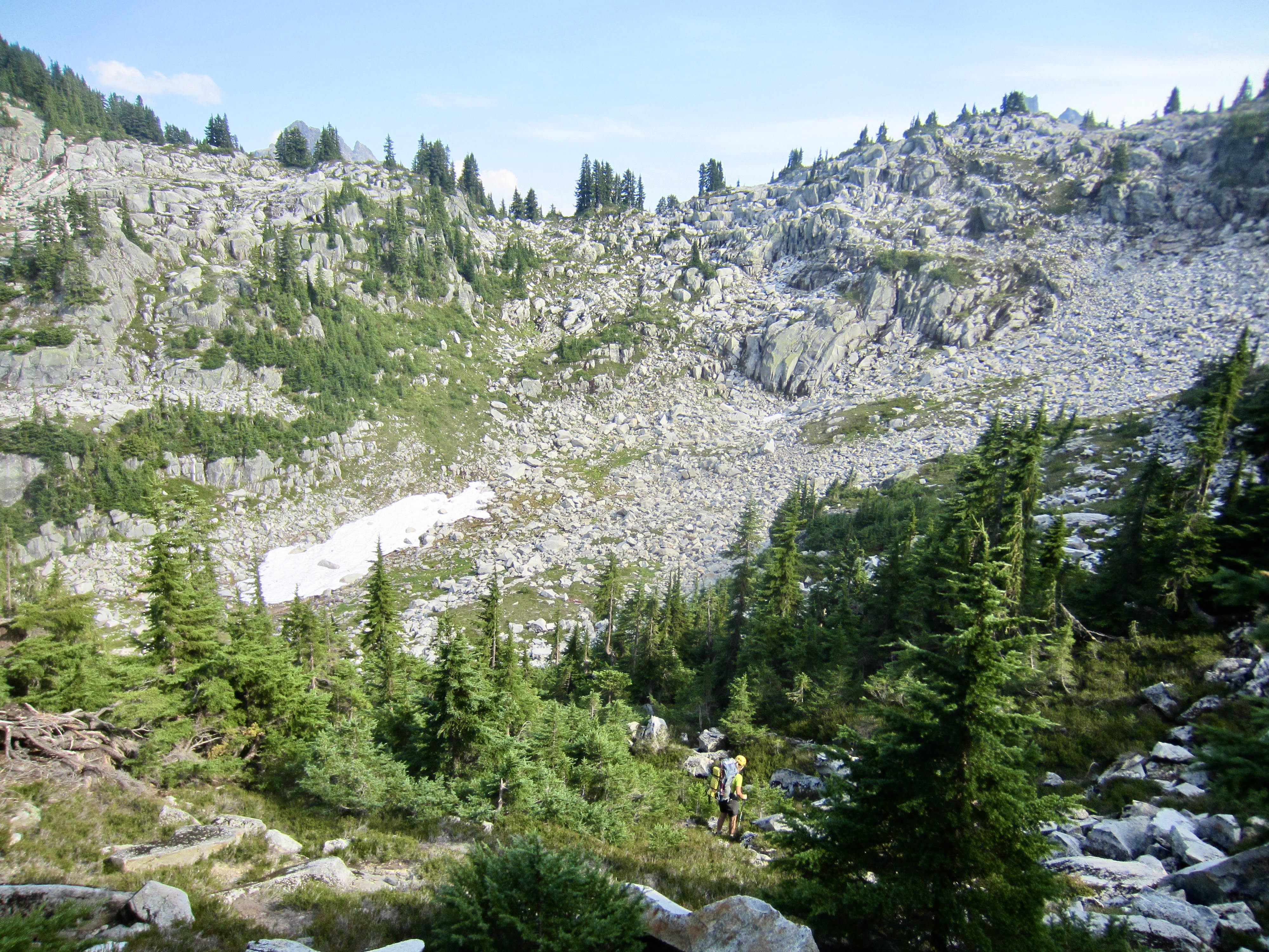 Because we were all heading to Tank Lakes today, Andrew, Eileen, and I left the summit together. Almost immediately, we encountered a pair of trekkers also heading to Tank Lakes, so we temporarily joined forces with them to solve the trickiest part of the entire traverse: getting off Iron Cap Mountain’s eastern flank. The terrain here gets quite steep, and there are multiple possibilities heading in various directions. We soon divided into three groups again and tried three different routes, all of which ultimately worked out. Eileen and I chose a route that went straight down the northeastern nose and then veered to the right, following boot tracks and marker ducks through alternating patches of dense fir trees and white boulders.