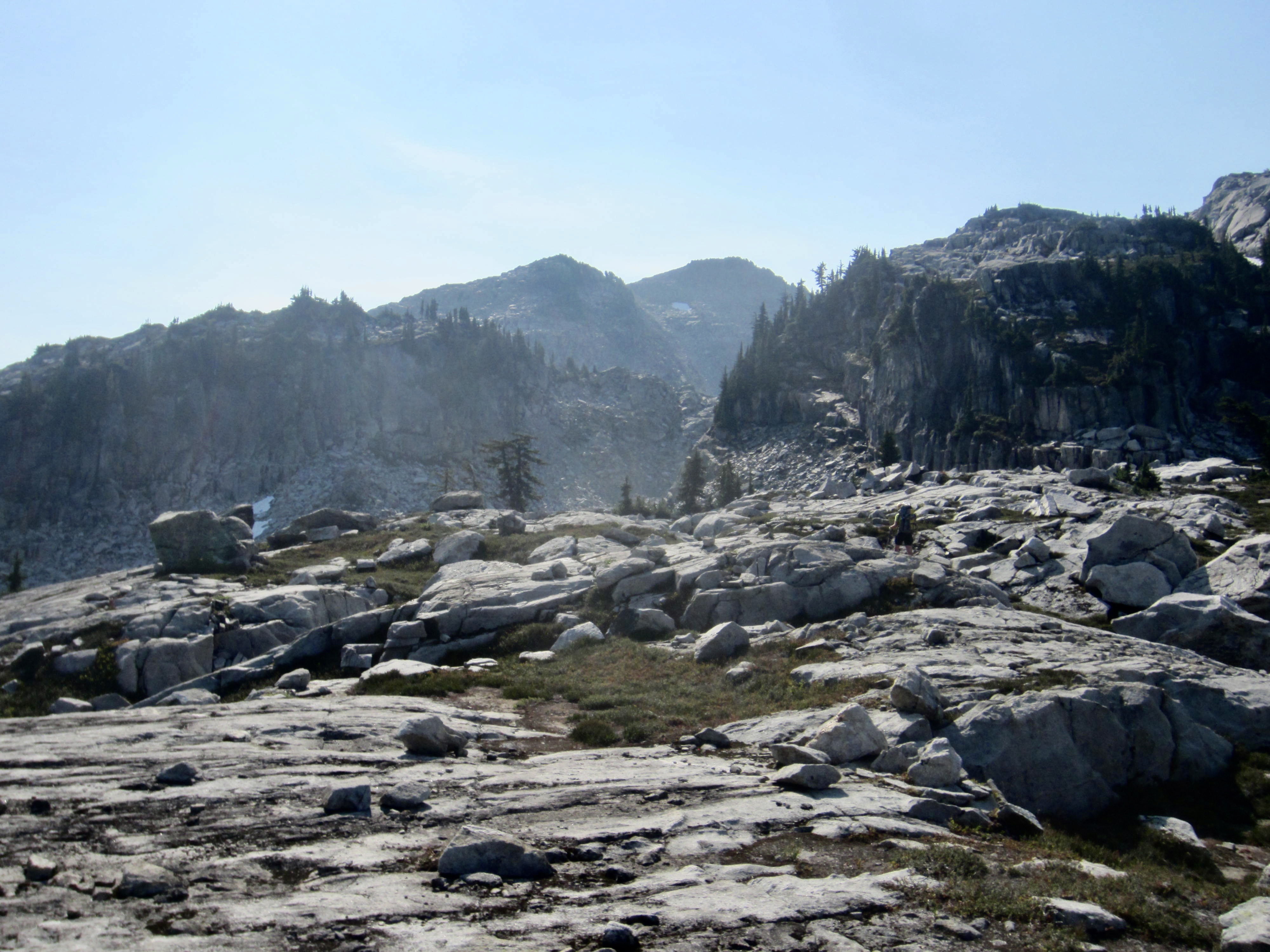 Under hazy skies, we left Azure Lake at 8:45am and headed eastward up to a slight saddle in the ridge above. This saddle gave access to a large bench of slabby rock that overlooks Azurite Lake and Otter Lake—two seldom-visited gems in the Alpine Lakes Wilderness. The Miller-Foss trio of Wild Goat Peak, Tourmaline Peak, and Camp Robber Peak stood out to the west.