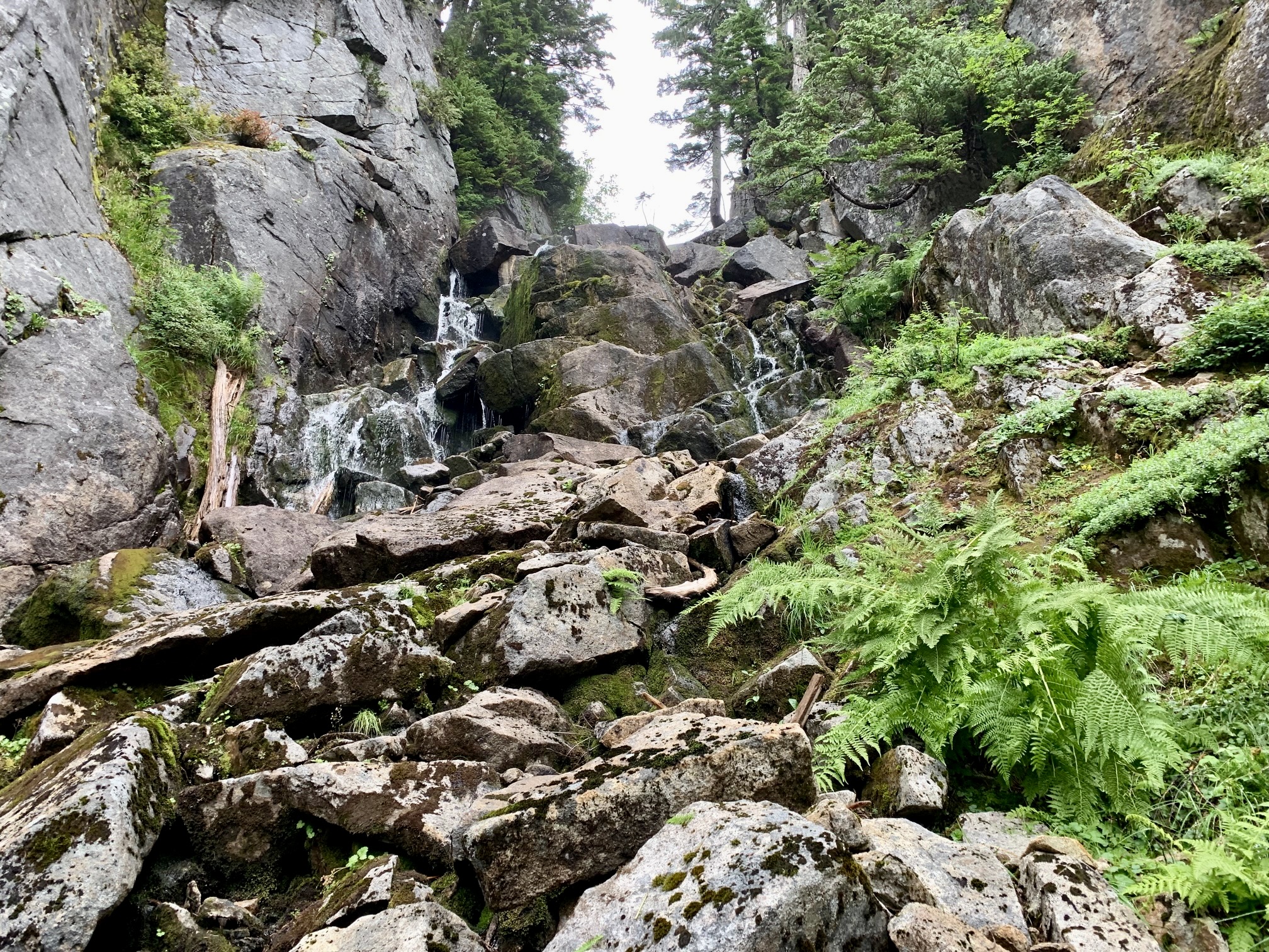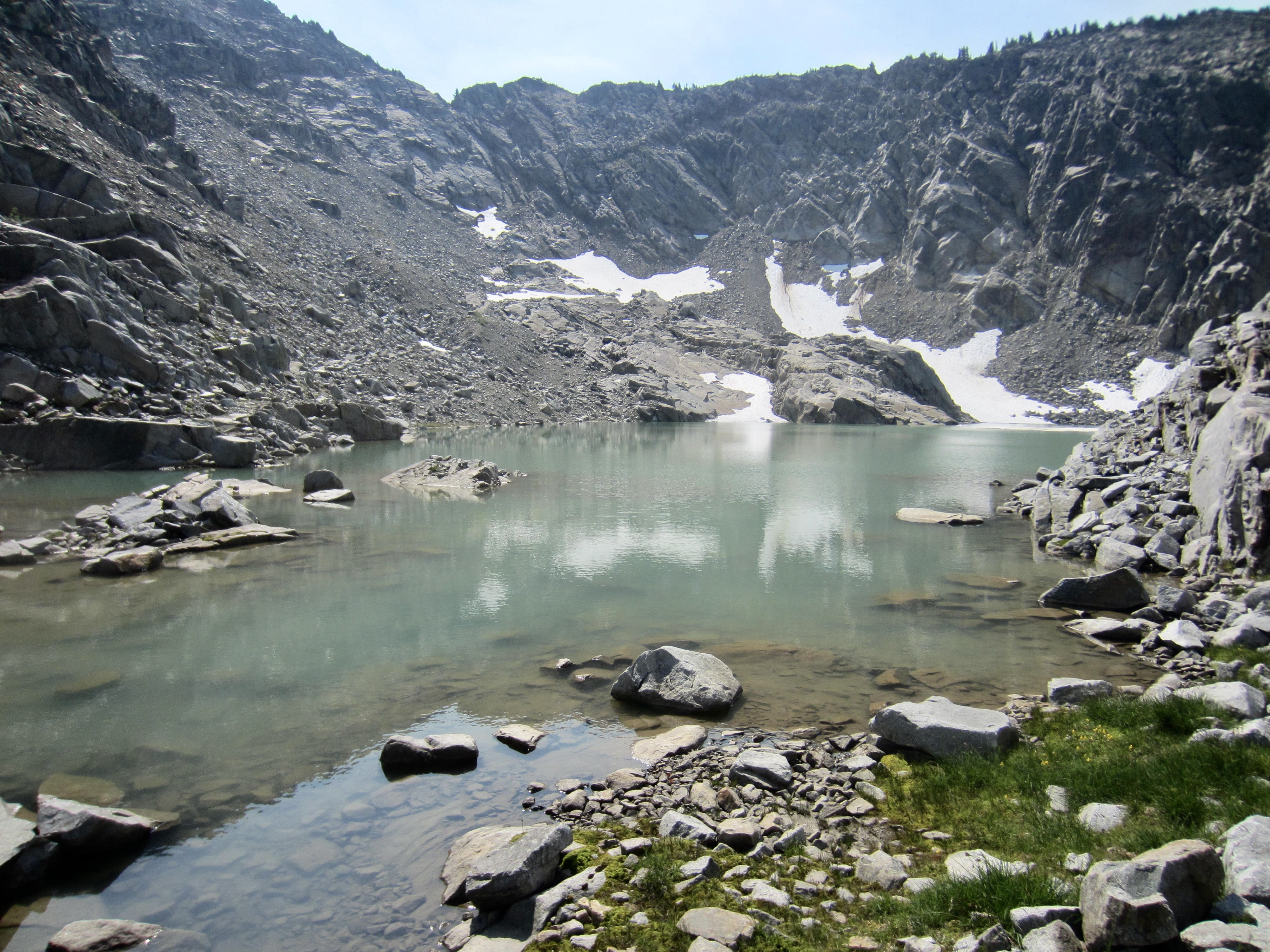 After gaining 400 feet through the vegetative car-wash, we happily broke out onto an open field of large boulders. This boulderfield funneled us into a gully (fondly known as “Snowflake Lane”) that carries Big Snow Creek. Another 700 feet of hiking and easy scrambling, as well as a few tricky Class 3 moves at the top, took us to Big Snow Lake—the first of many beautiful alpine lakes encountered during our traverse.