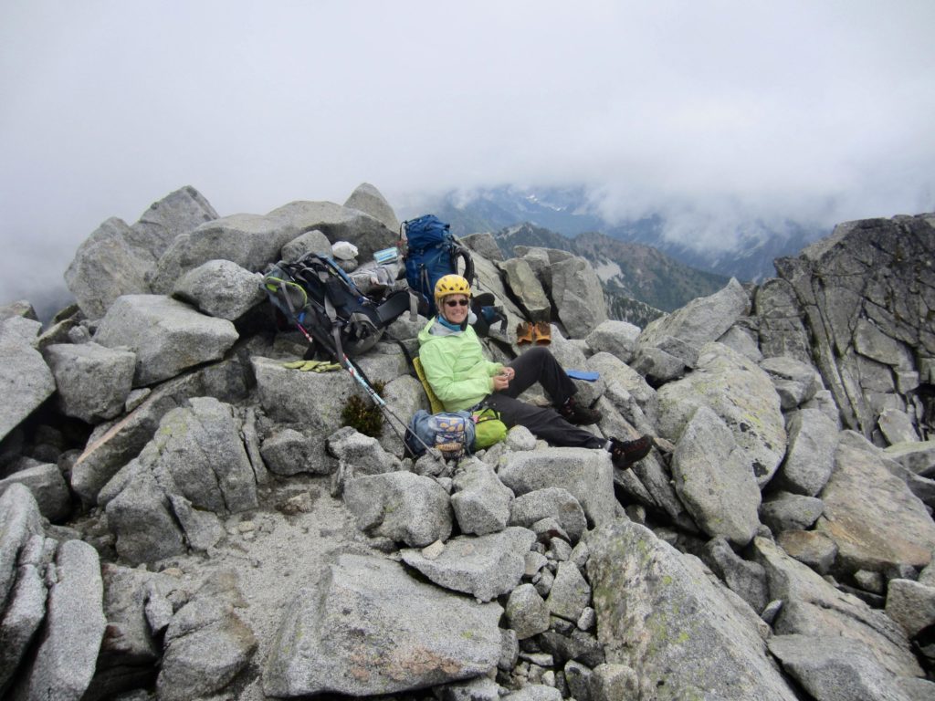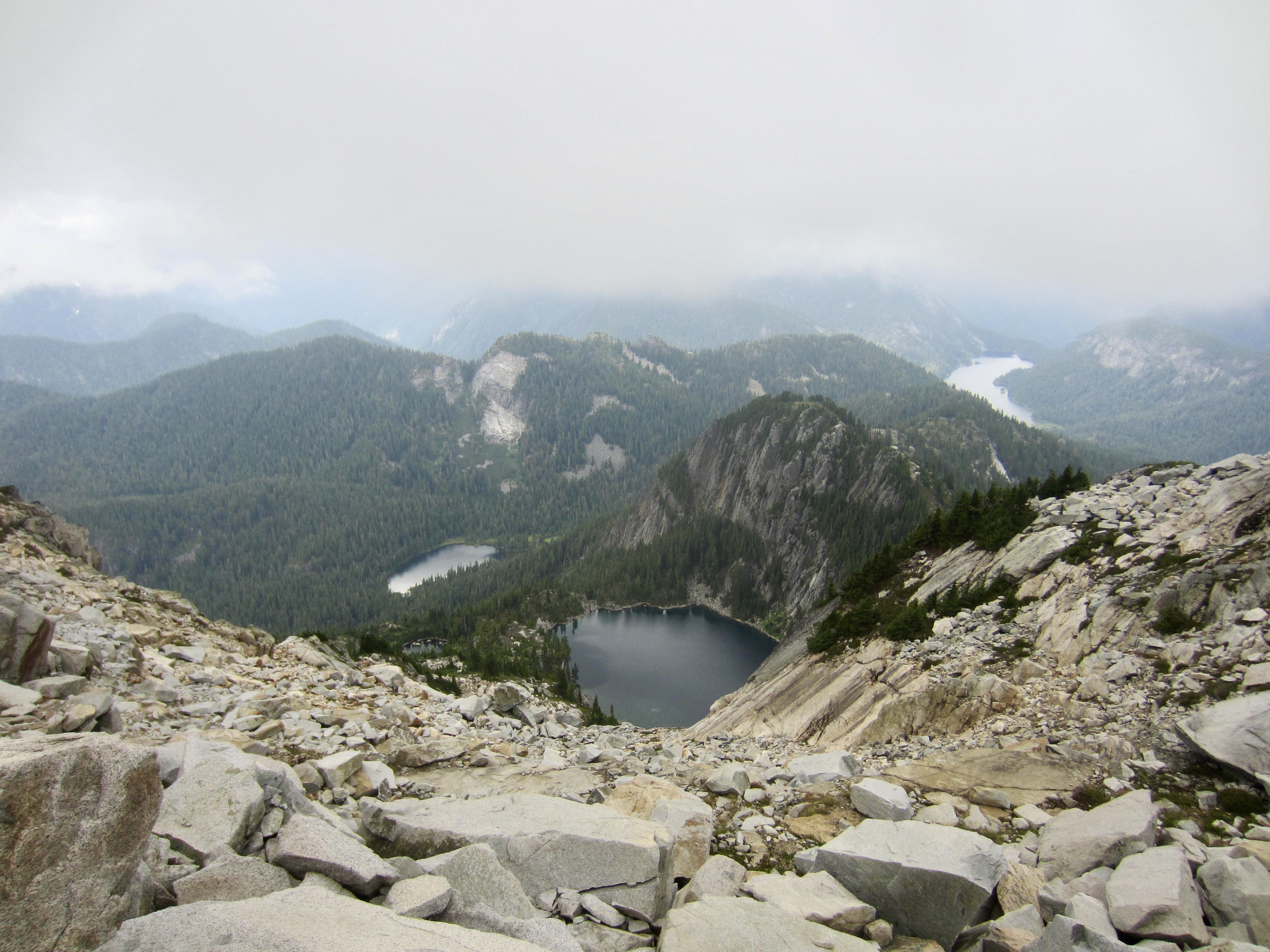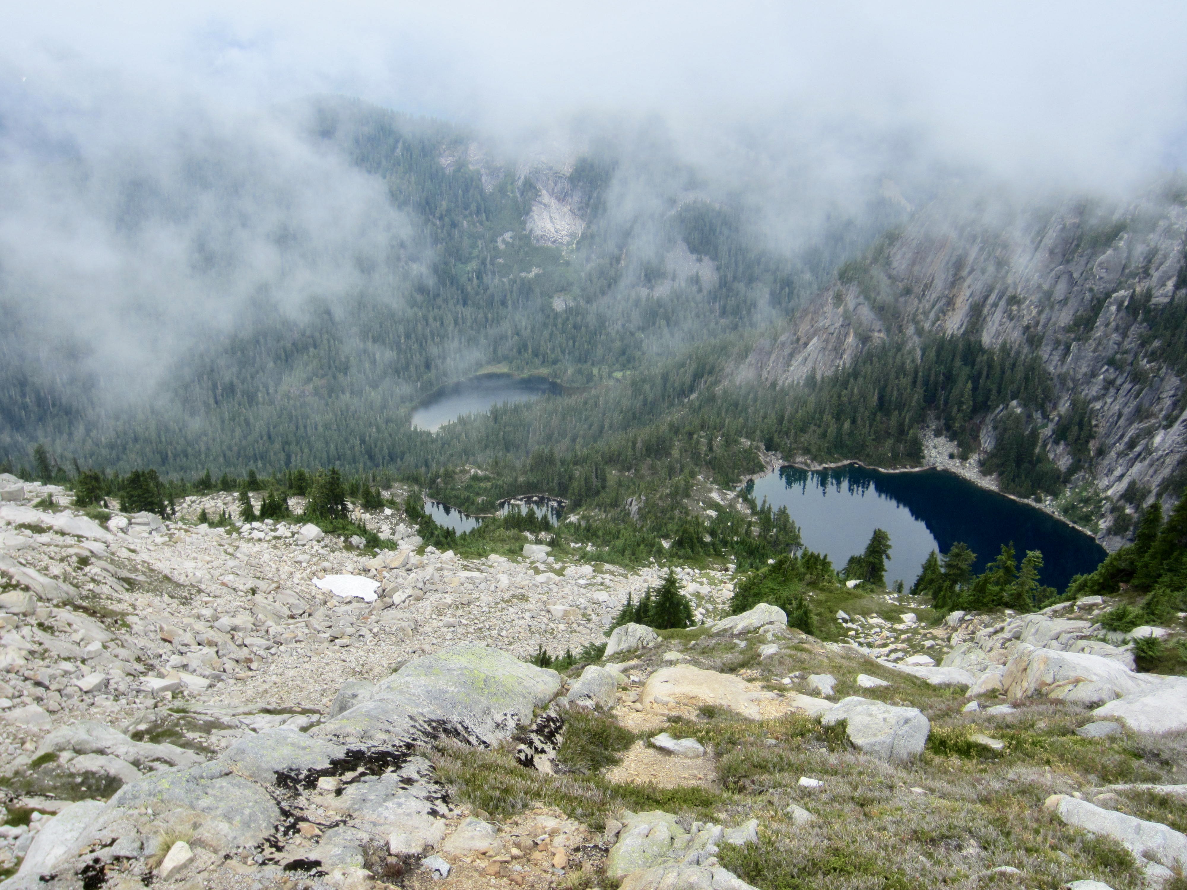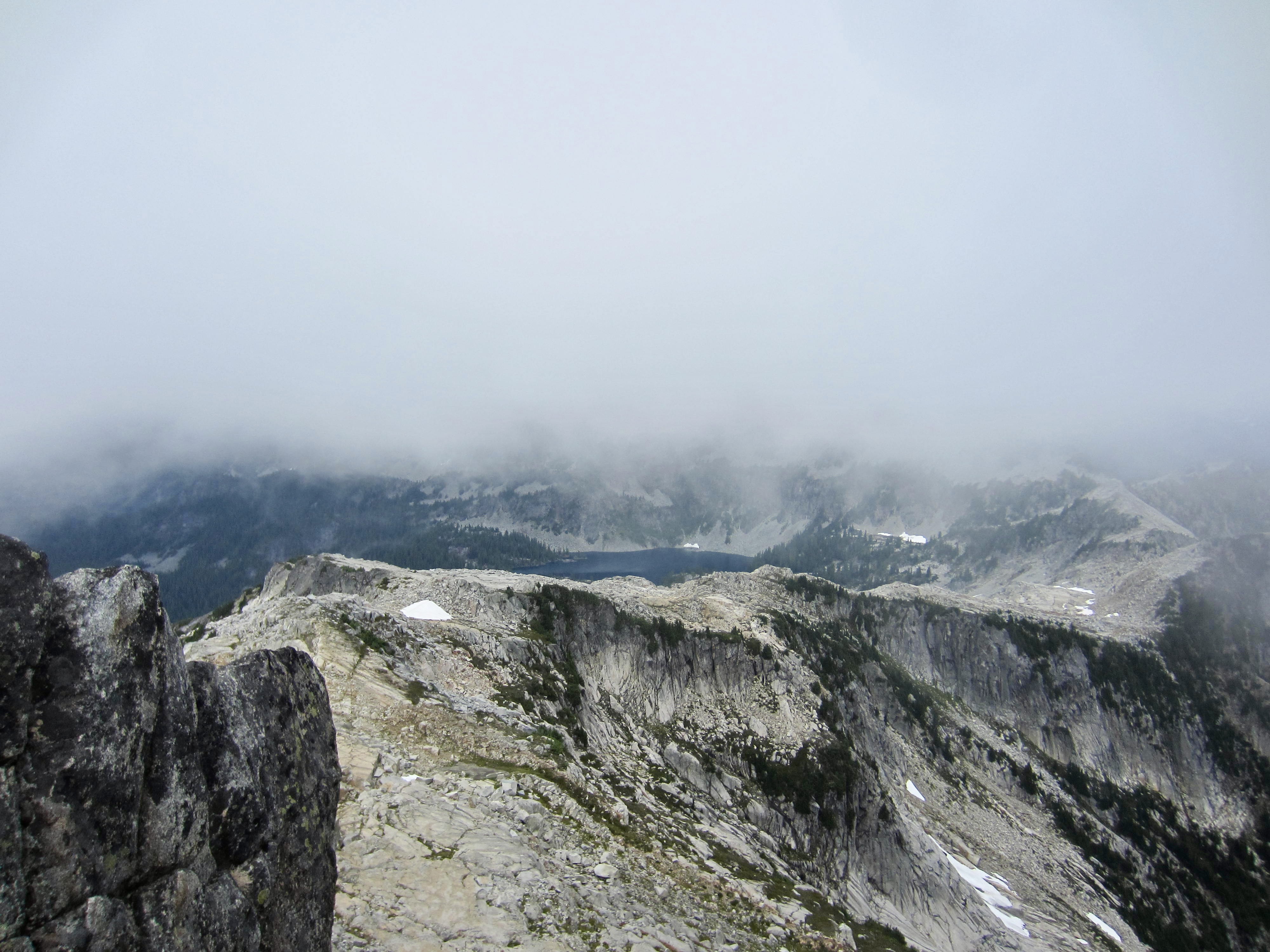 Upon reaching the ridge crest, we turned right and made a short scramble to the summit (2.7 hours + 1600 feet from Camp 1). It was now early afternoon but there was no evidence of improving weather; low clouds still shrouded all of the surrounding peaks. At least the valley fog had cleared enough to allow views down to Gold, Dorothy, Big Snow, and Myrtle Lakes.