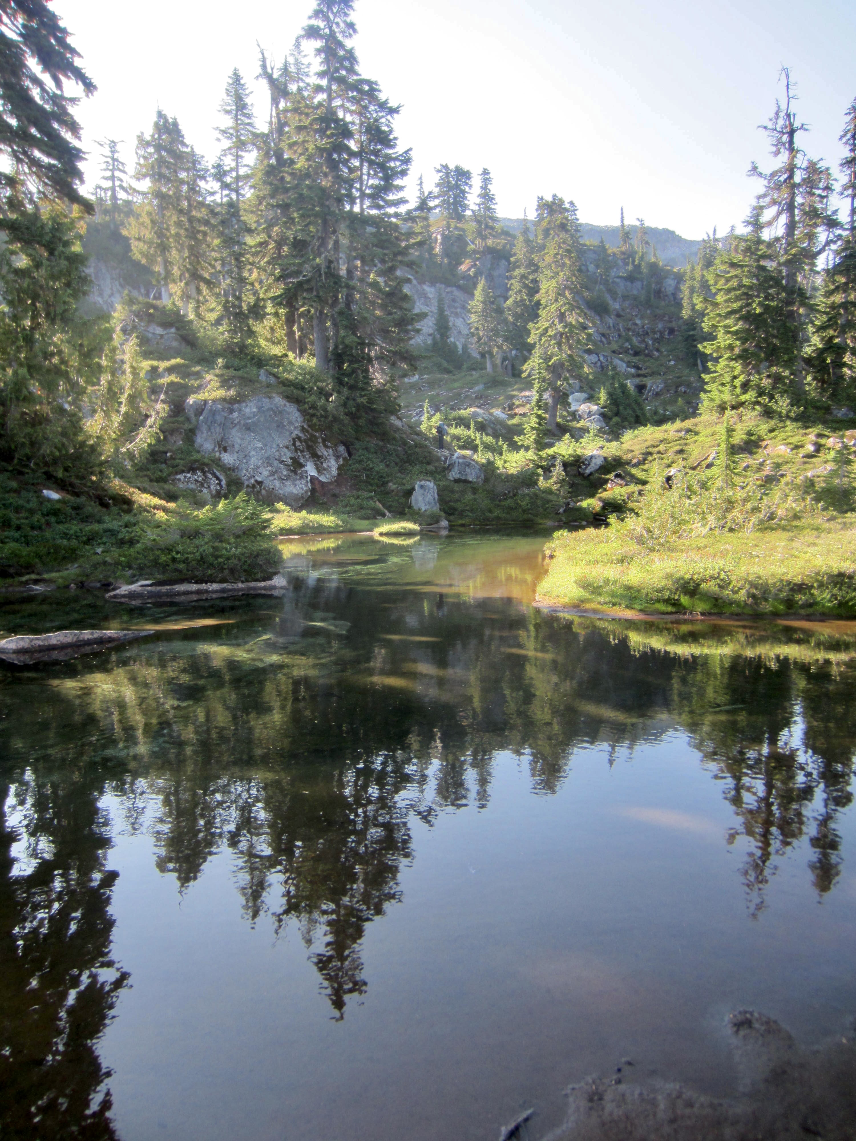 A faint bootpath in the meadow took us over a woodsy knoll to an intersection with a well-defined path, which in turn led us down to Little Chetwoot Lake, across a stream, and northeasterly over a ridge. We passed above Angeline Lake and between a pair of large tarns before descending to Azure Lake in late evening (11.2 hours + 4.6 miles + 2300 feet from Camp 2). Eileen and I used our last few minutes of twilight to hop in the lake and wash off the cedar grime. It was a soothing end to a long day with many emotional ups and downs.