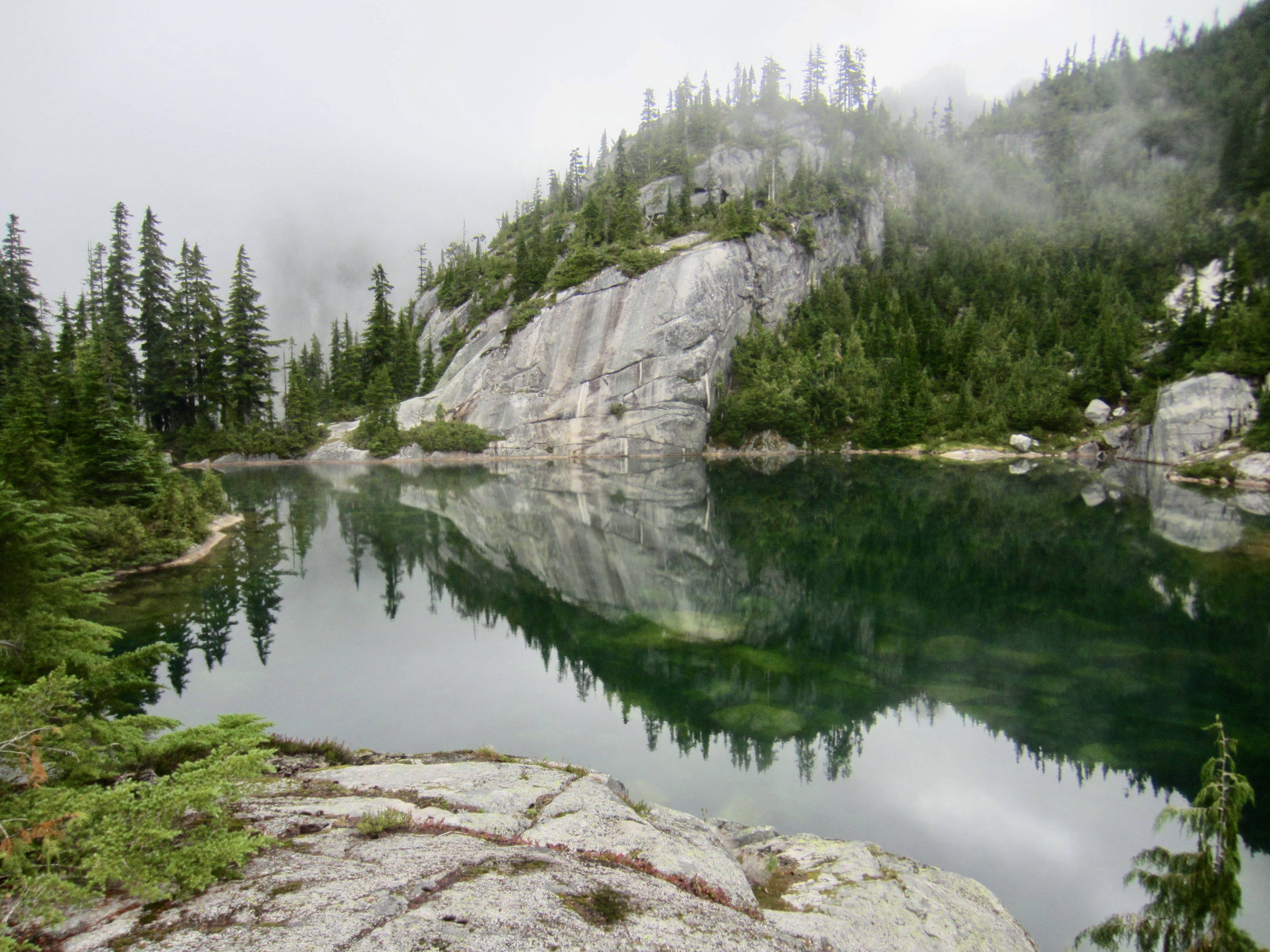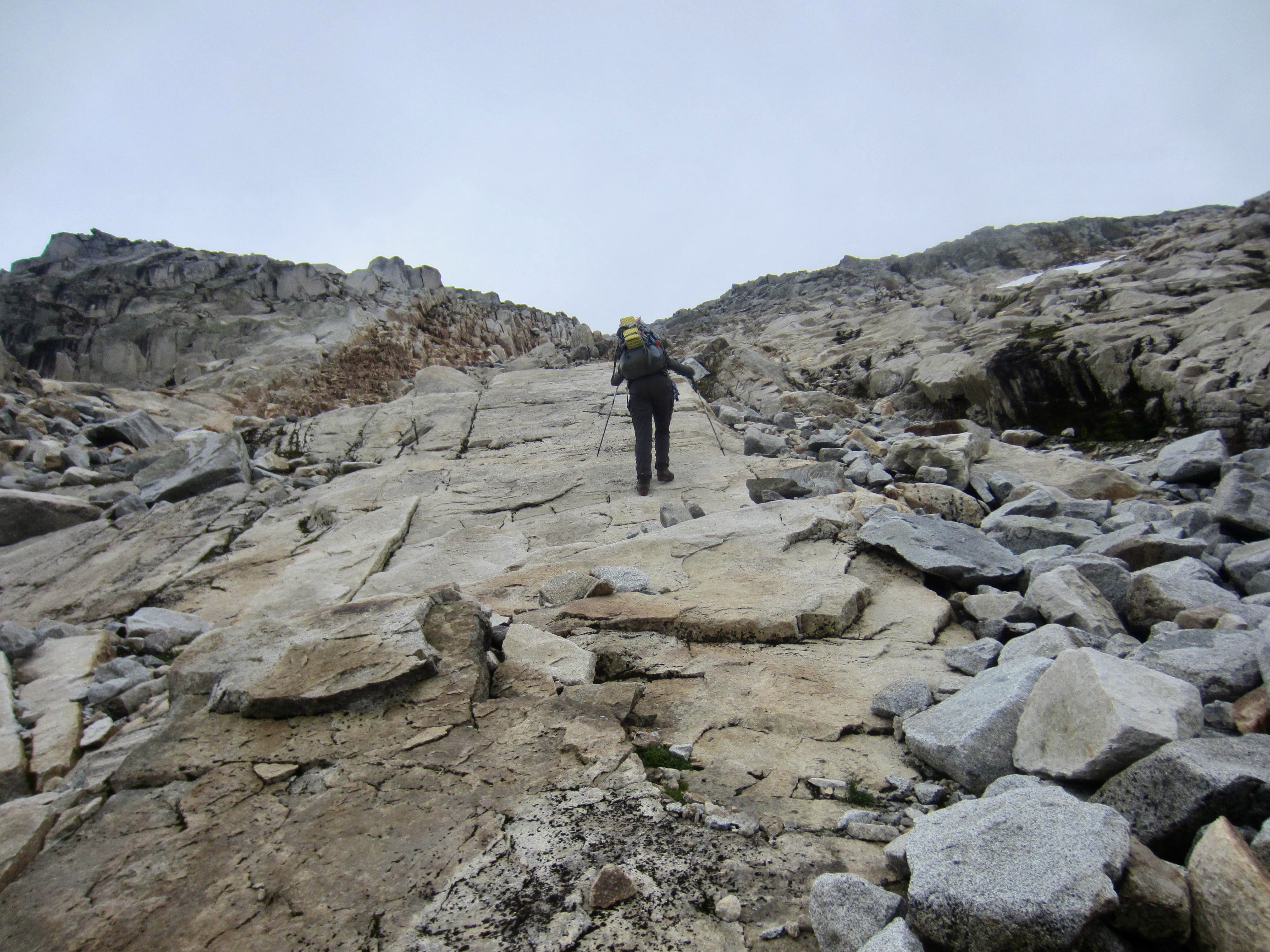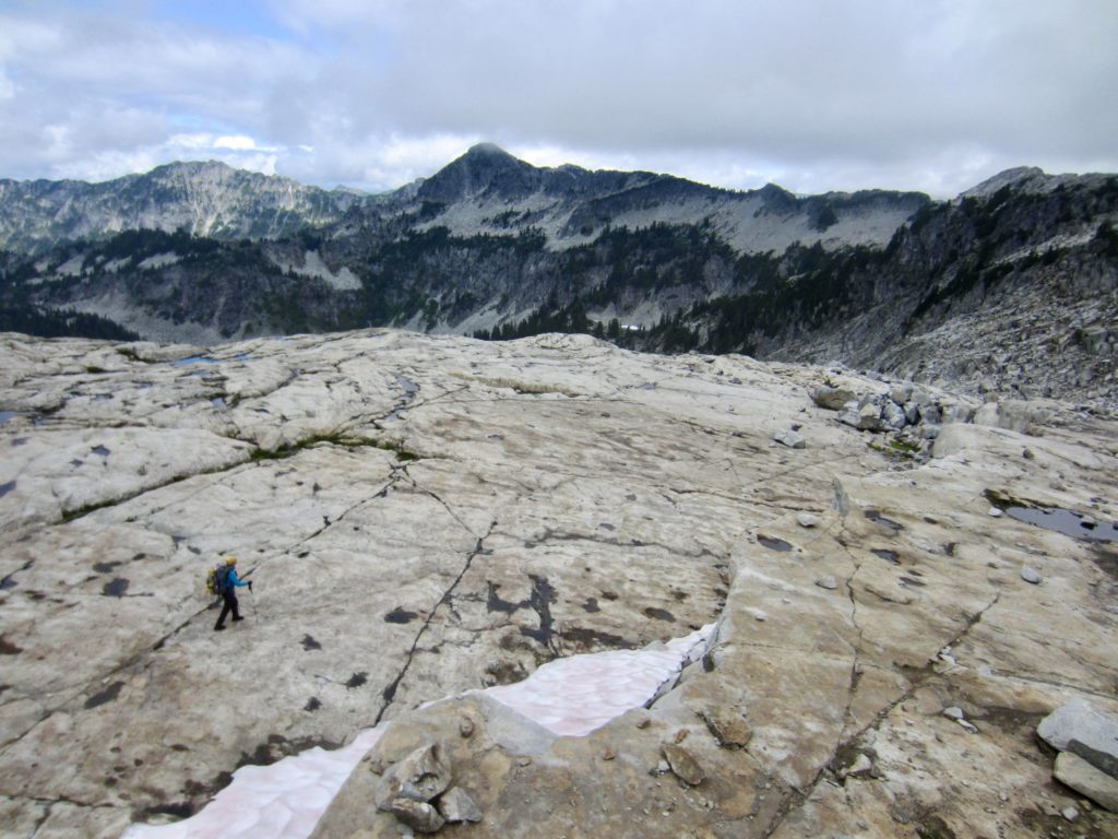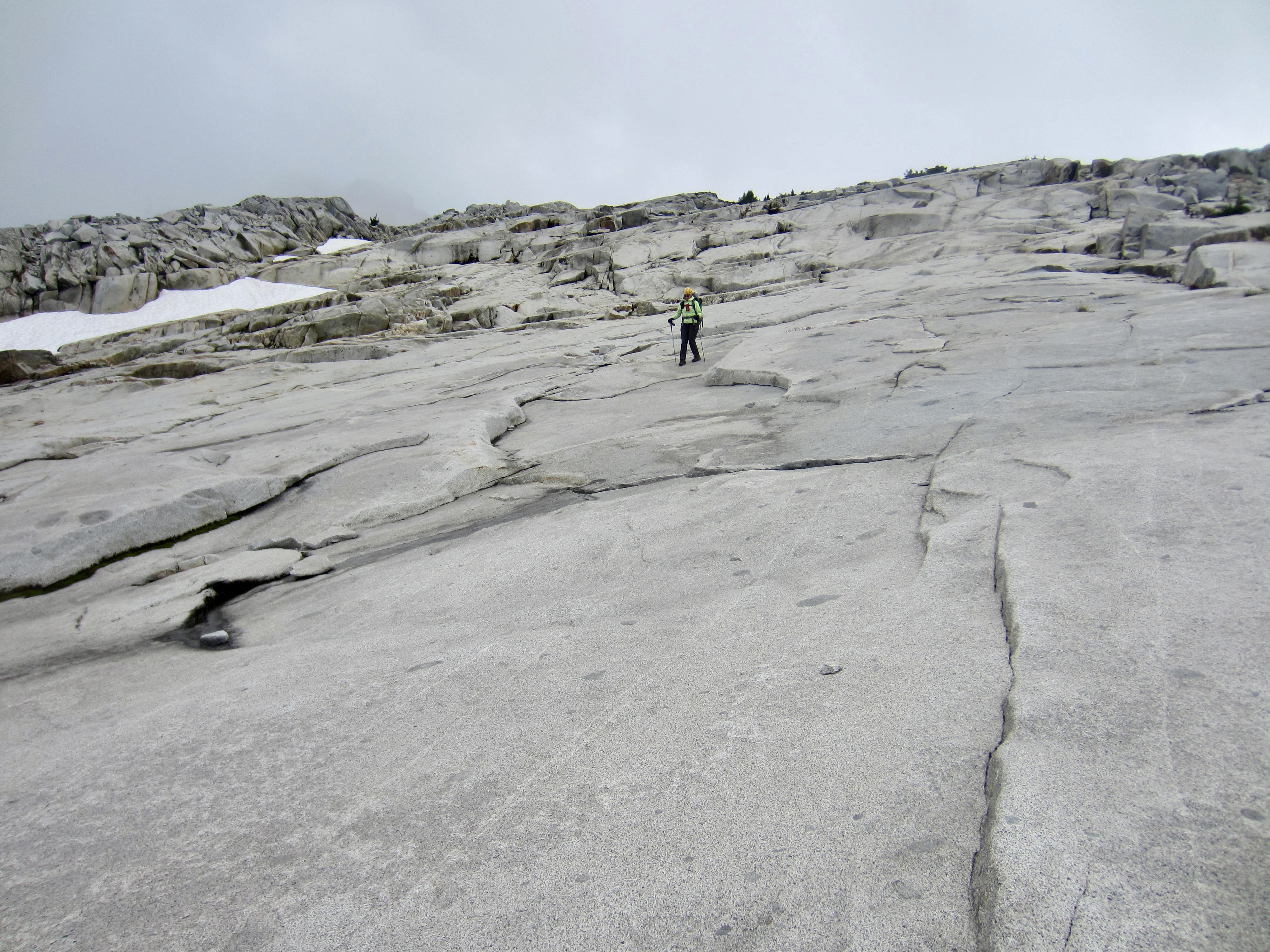 Today’s destination was Gold Lake, so we began descending in a northeasterly direction, first scrambling down a narrow ridge and then walking down a broad shoulder. This shoulder features a series of huge, low-angle granite slabs and nearly level granite shelves—the largest I’ve ever encountered in the Cascades. The simple pleasure of strolling down these remarkable slabs and shelves was adequately entertaining to overshadow the gloomy weather!