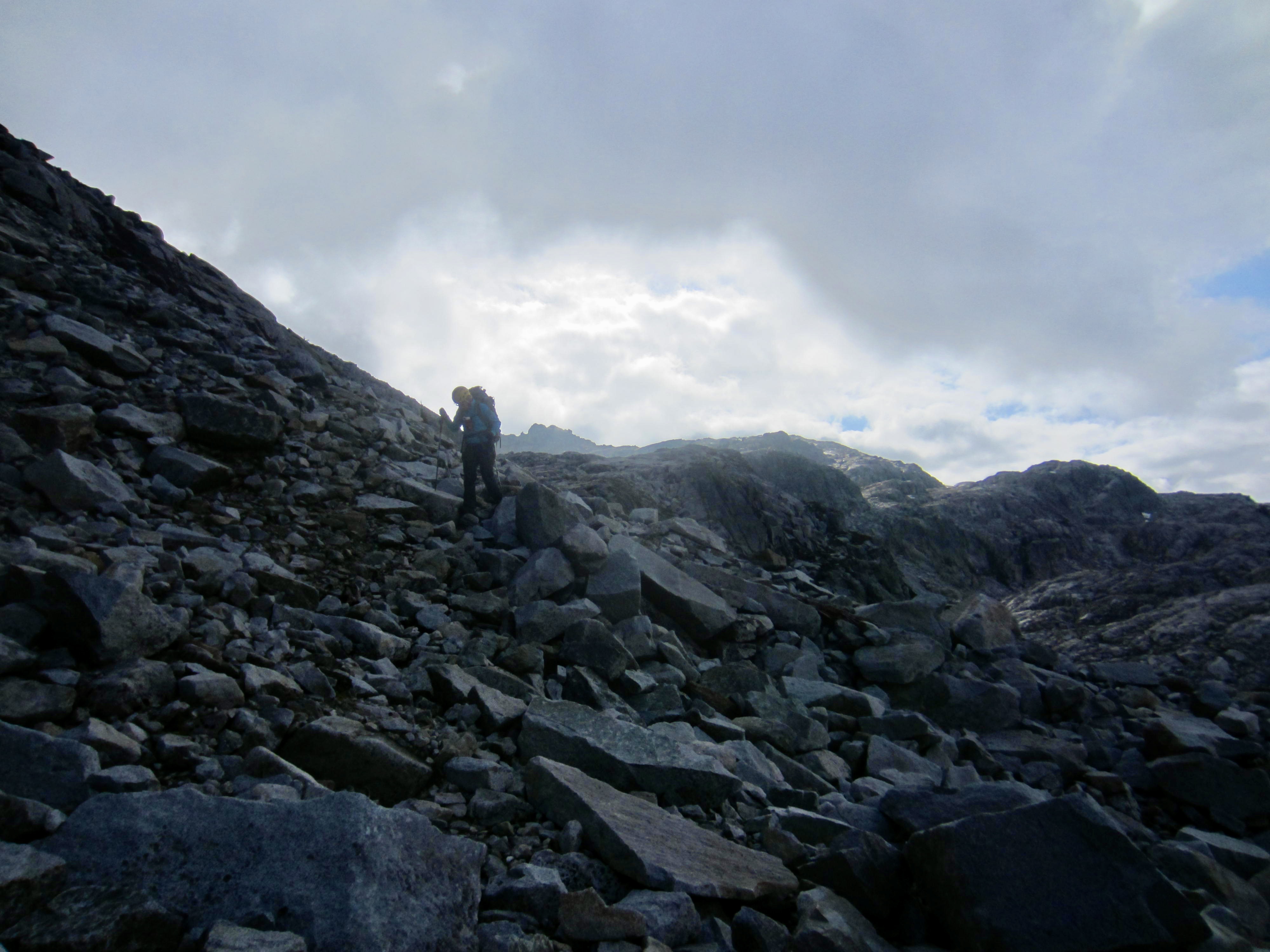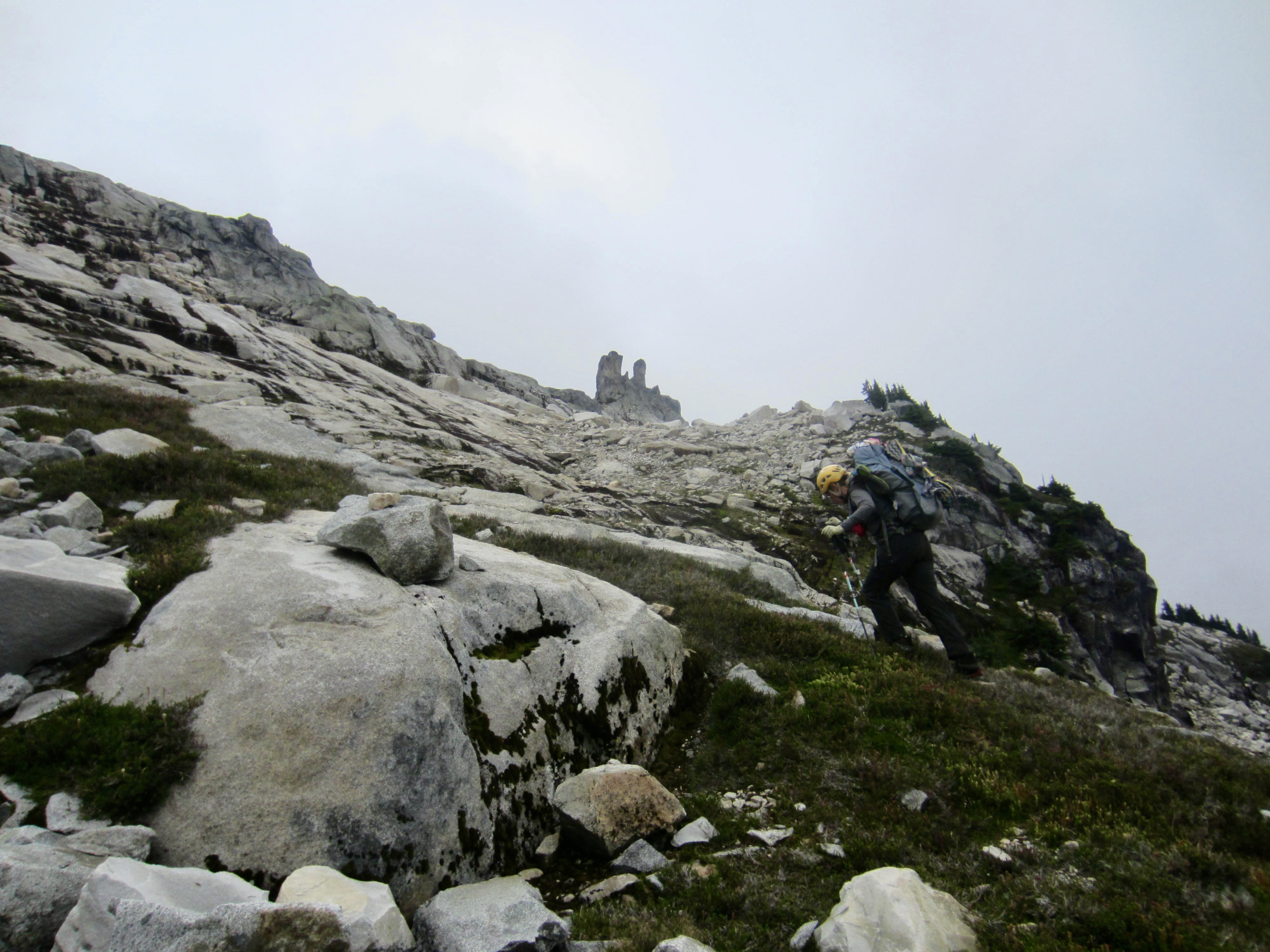From Snowflake Lake, we followed a vague bootpath up to a heather bench overlooking the lake, then scrambled up a green gully that cuts through a large cliff band. Broad slopes of heather, boulders, and slabs allowed for a relatively easy ascent to Big Snow’s northeastern ridge. Along the way, we passed by “The Raptor,” a distinctive rock pinnacle perched on the mountain’s northwest rib.