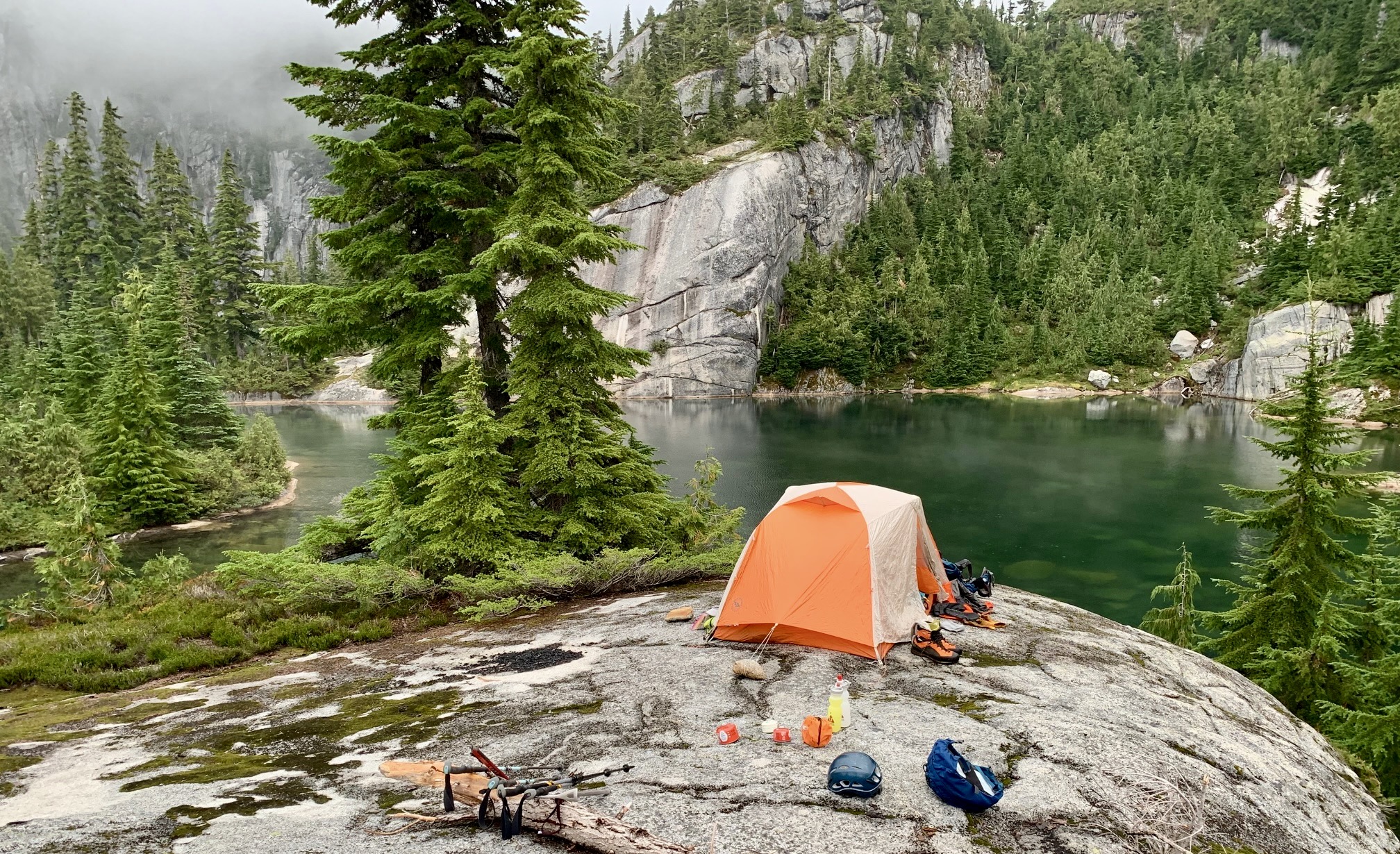 A short path led us over to Snowflake Lake (7.4 hours + 6.3 miles + 3600 feet from TH), where we made camp on a rock outcrop. Dismal weather and wet clothing was not how we envisioned the start of this five-day trek, but the forecast did call for sunshine by noon tomorrow.
