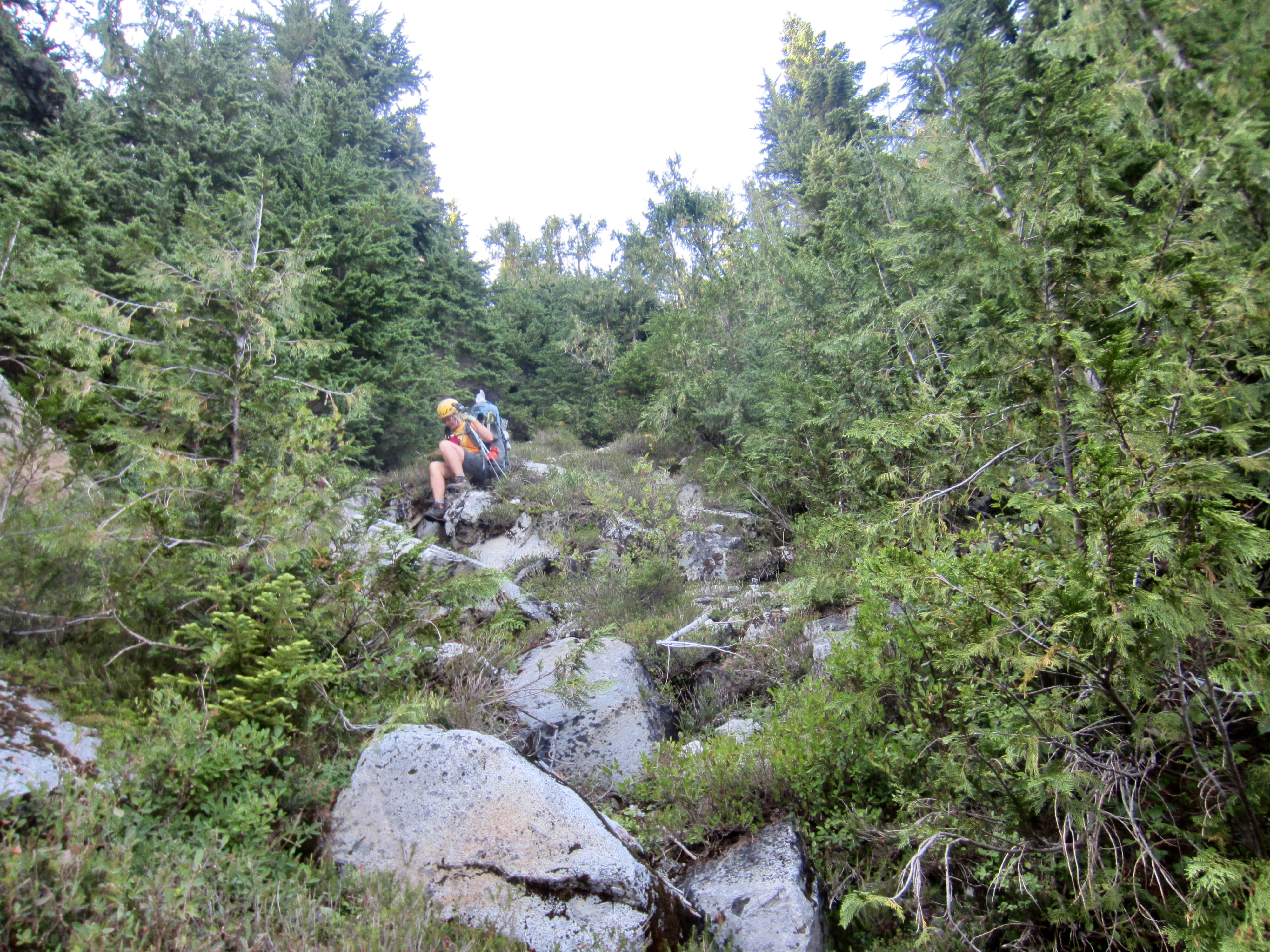 Upon approaching Chetwoot Lake, we had the option of contouring around the north shore or south shore. We chose the north shore because that’s what the CAG sketch shows, and things initially went well. Before long, however, we found ourselves mired in thickets of scrub cedar (scientific name: Thuja gawdawfulus) on a steep sideslope about 50 feet above lake level. It became an ugly battle, and our progress slowed to a crawl; we gained barely more than 100 yards in an hour. Thinking that the lakeshore must surely be easier, we dropped down an open corridor to the water’s edge and began hiking along the shoreline. This actually worked nicely…for about 50 yards…then we encountered a stretch of low cliffs and were forced back uphill to the scrub-cedar purgatory. Oh, what we would have given for a pack-raft at this moment!