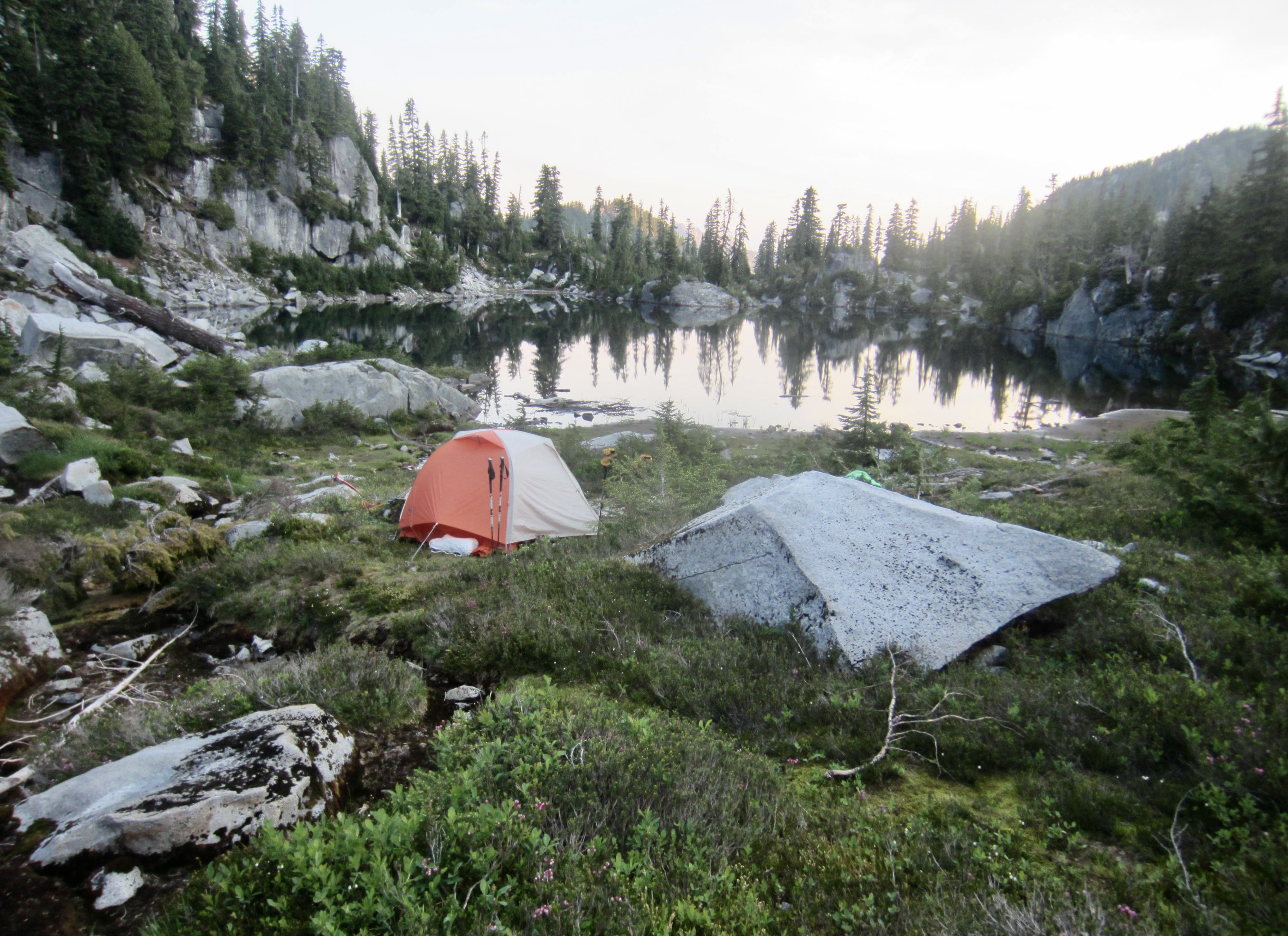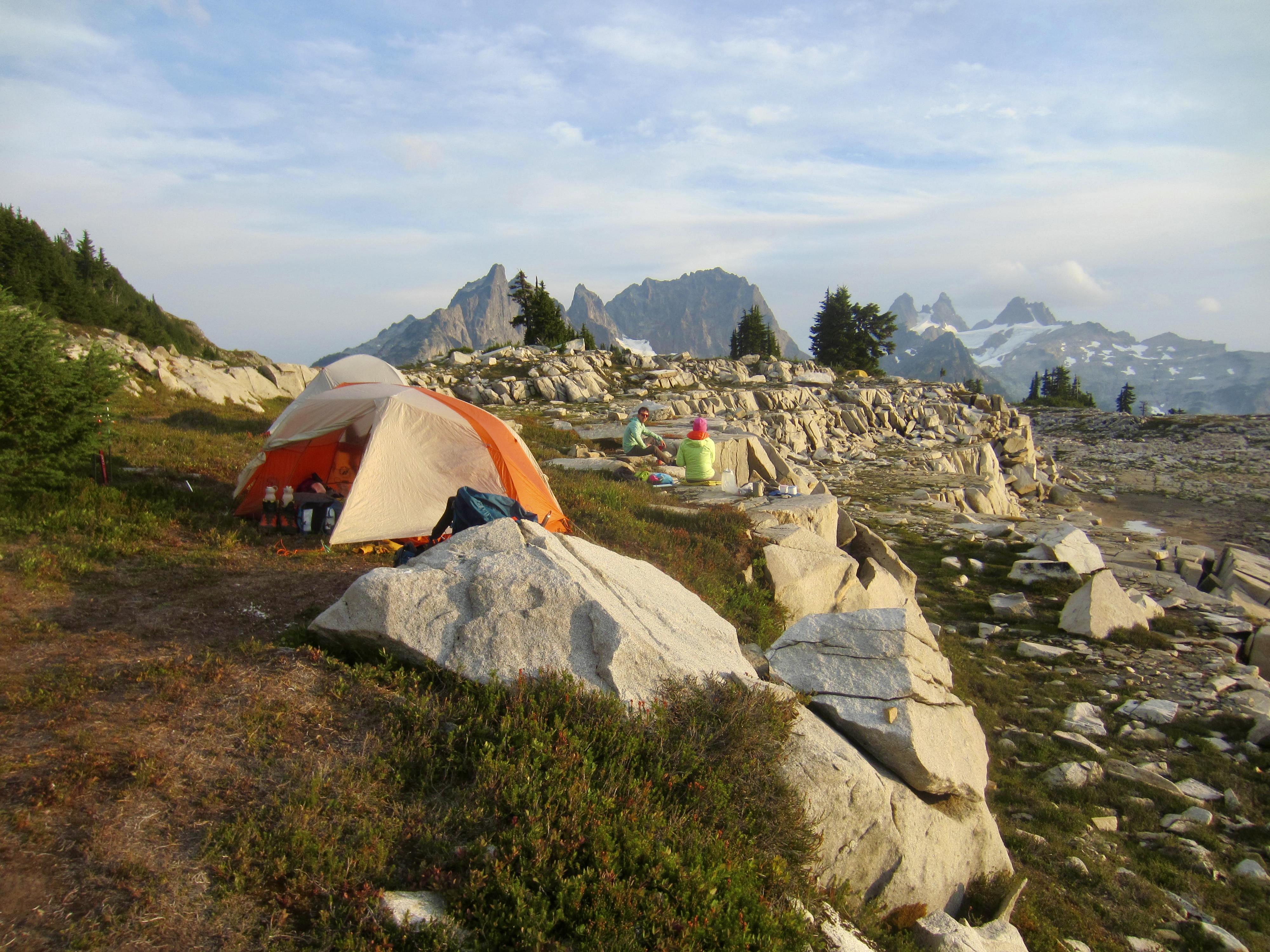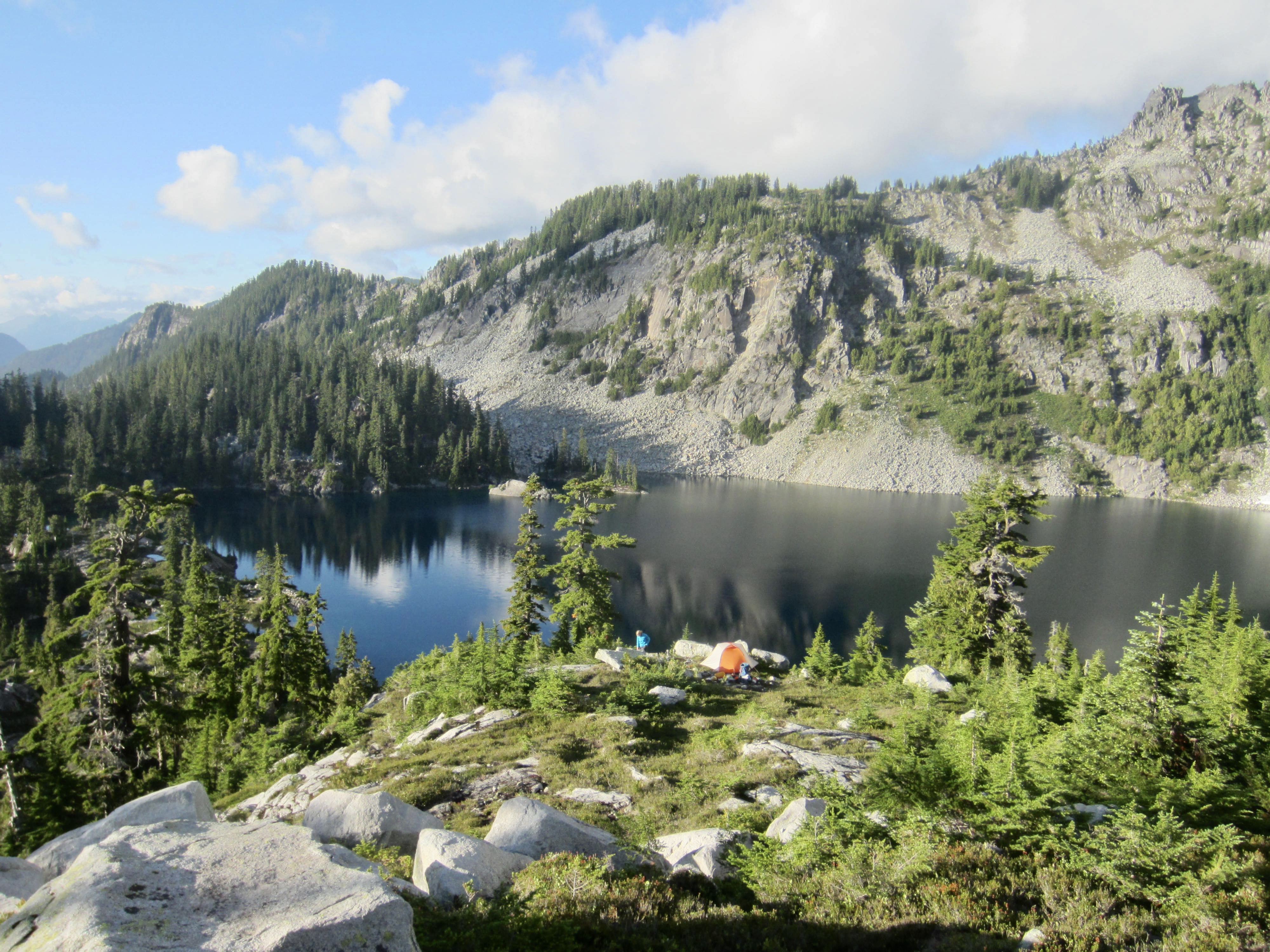 The weather continually improved as we progressed down a broad, white talus gully toward Gold Lake. Gradually, talus boulders gave way to heather meadows and a delightful collection of tarns. Just before reaching the lake, we angled up to a small knoll and established Camp 2 overlooking the water. After many years of waiting, we were now camped at one of the most coveted lakes in the Alpine Lakes Wilderness on a perfect summer evening—and it was worth the wait!