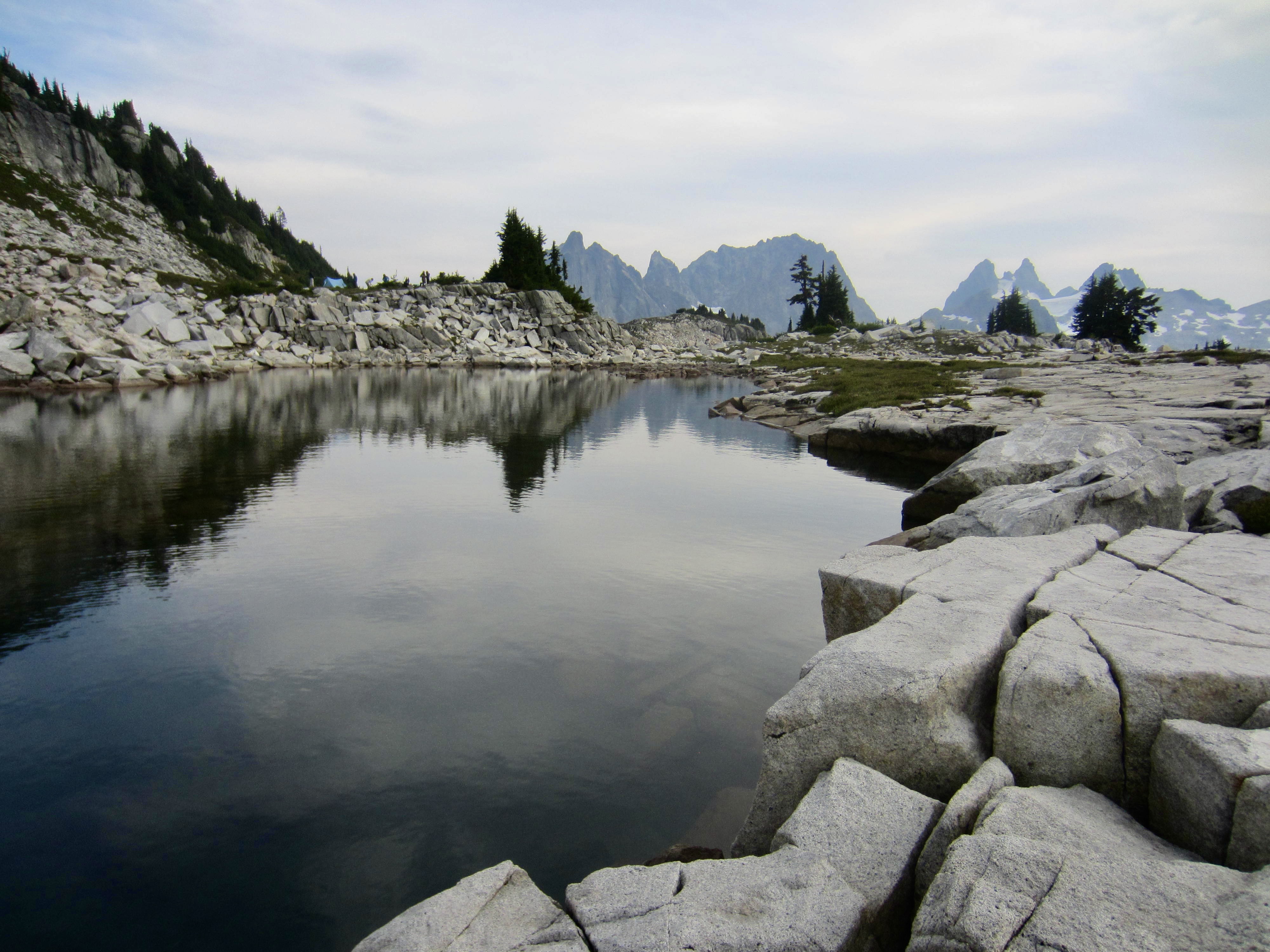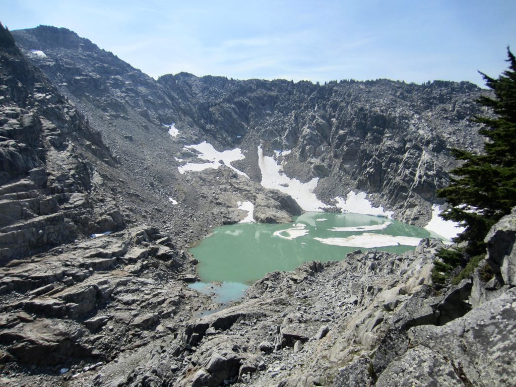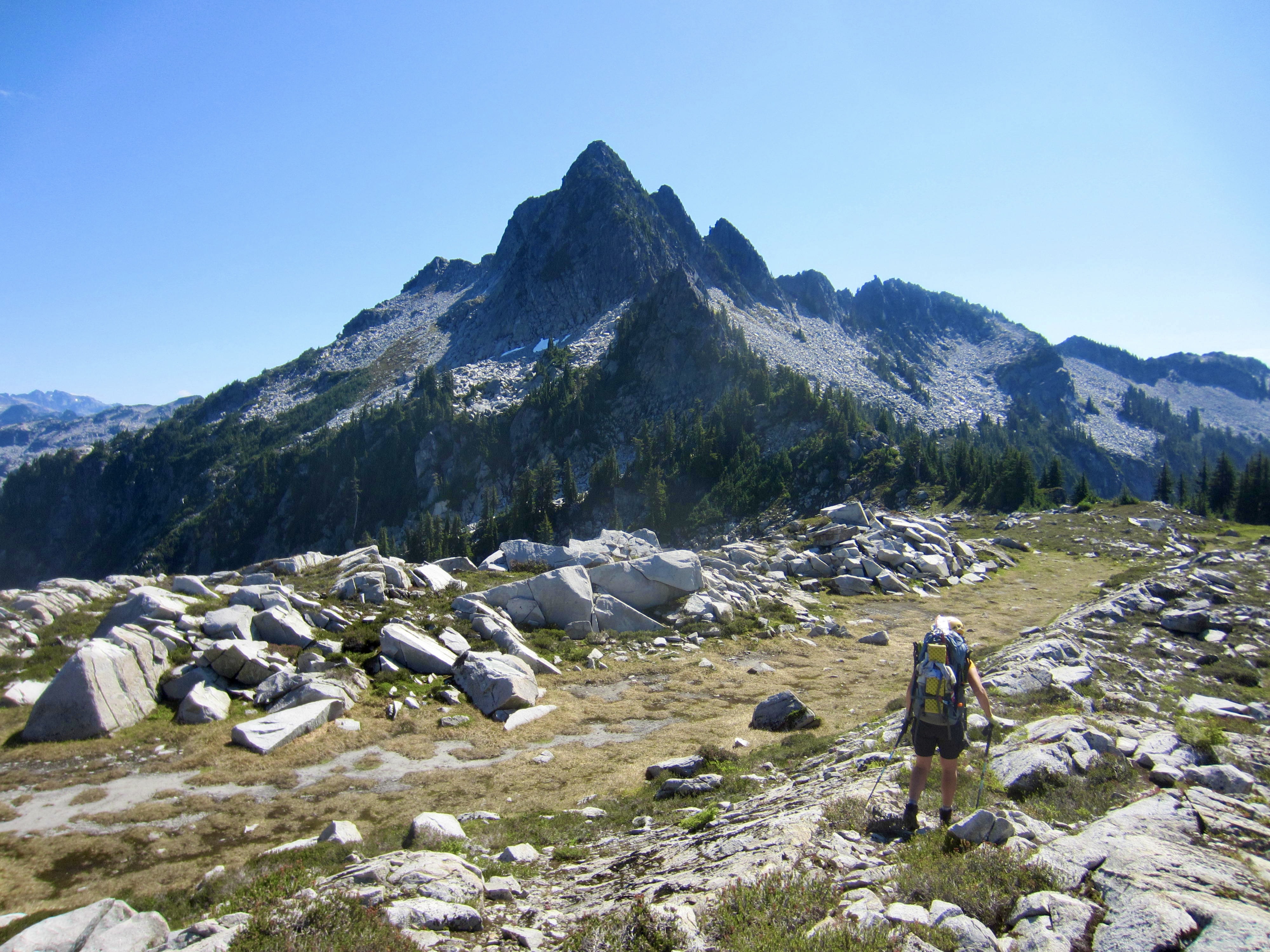 The weather continually improved as we progressed down a broad, white talus gully toward Gold Lake. Gradually, talus boulders gave way to heather meadows and a delightful collection of tarns. Just before reaching the lake, we angled up to a small knoll and established Camp 2 overlooking the water. After many years of waiting, we were now camped at one of the most coveted lakes in the Alpine Lakes Wilderness on a perfect summer evening—and it was worth the wait!