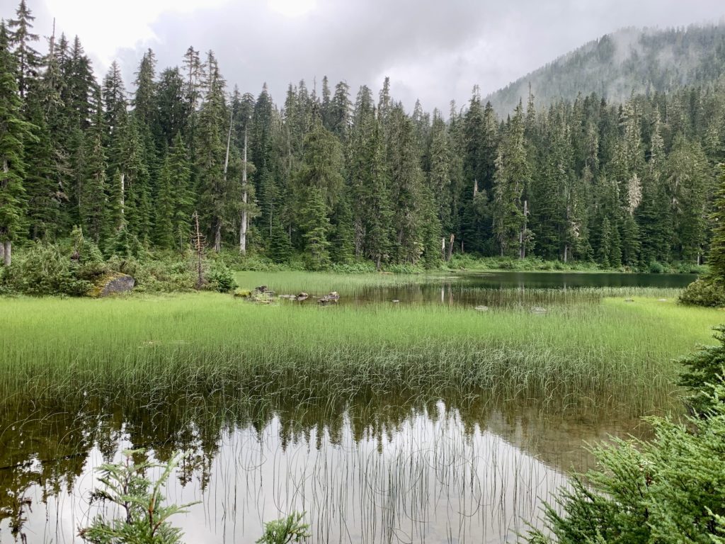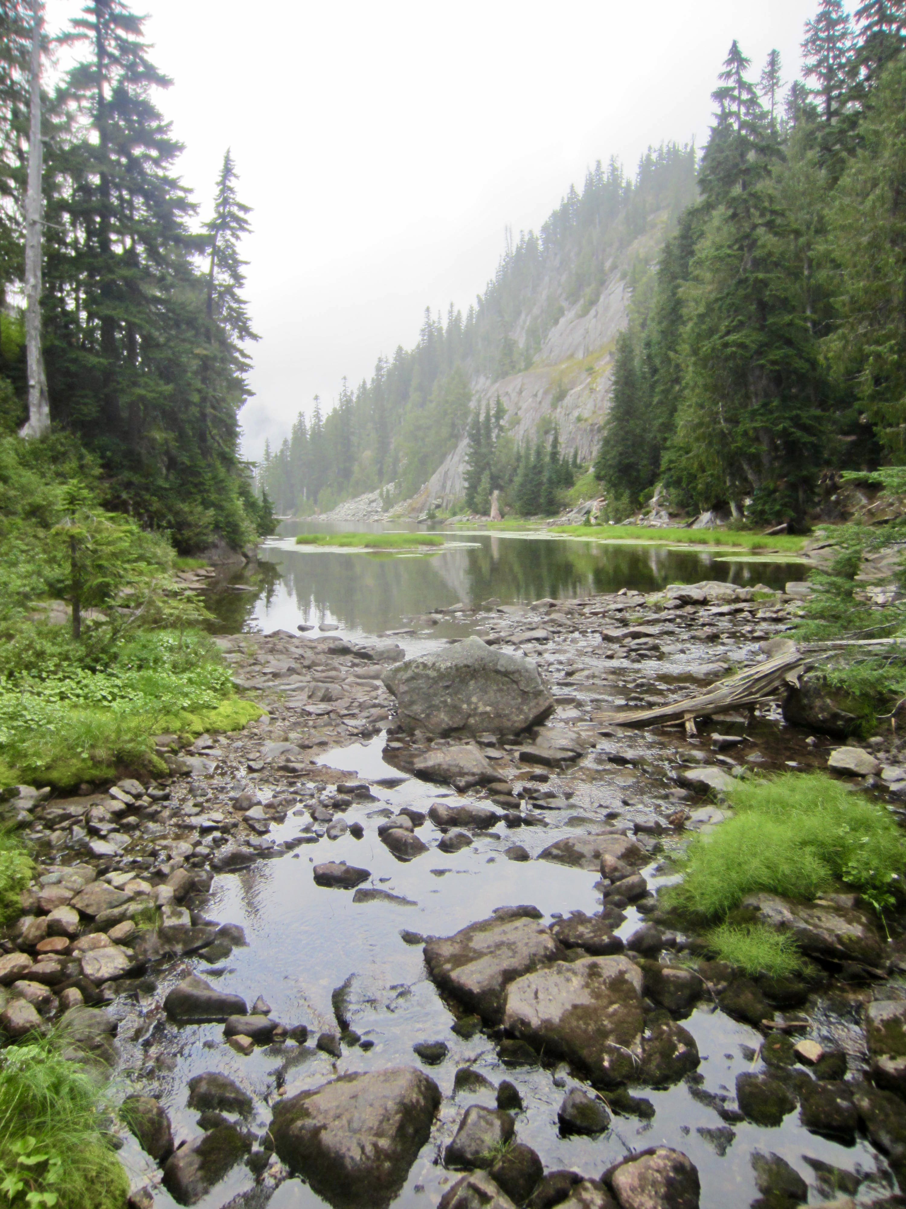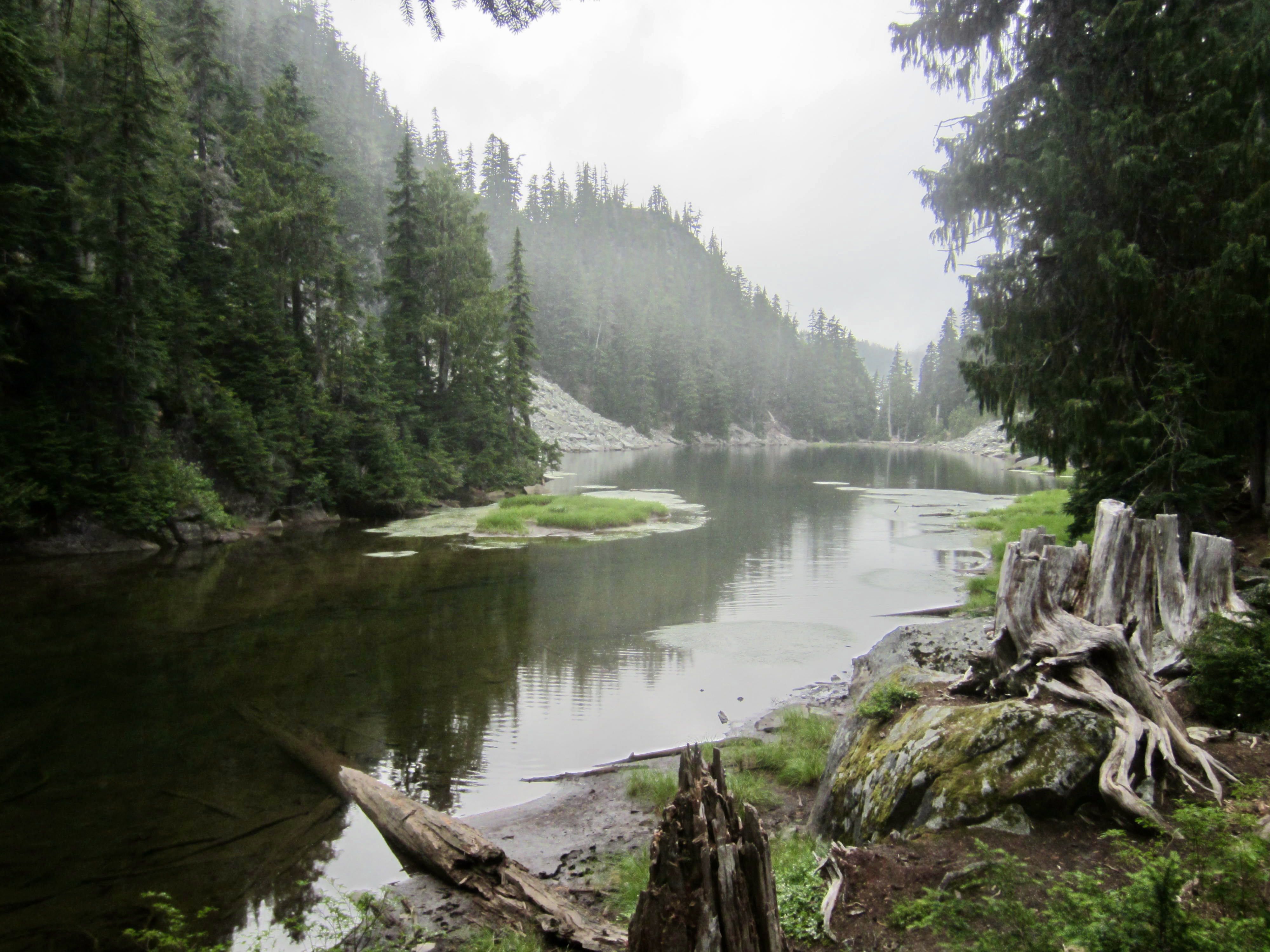 Eileen and I hiked up to Myrtle Lake, then took a hard right turn and plunged into the brush. Although it had stopped raining by now, all of the vegetation was saturated; we both got drenched while struggling through the huckleberry bushes, firs, and scrub cedars.