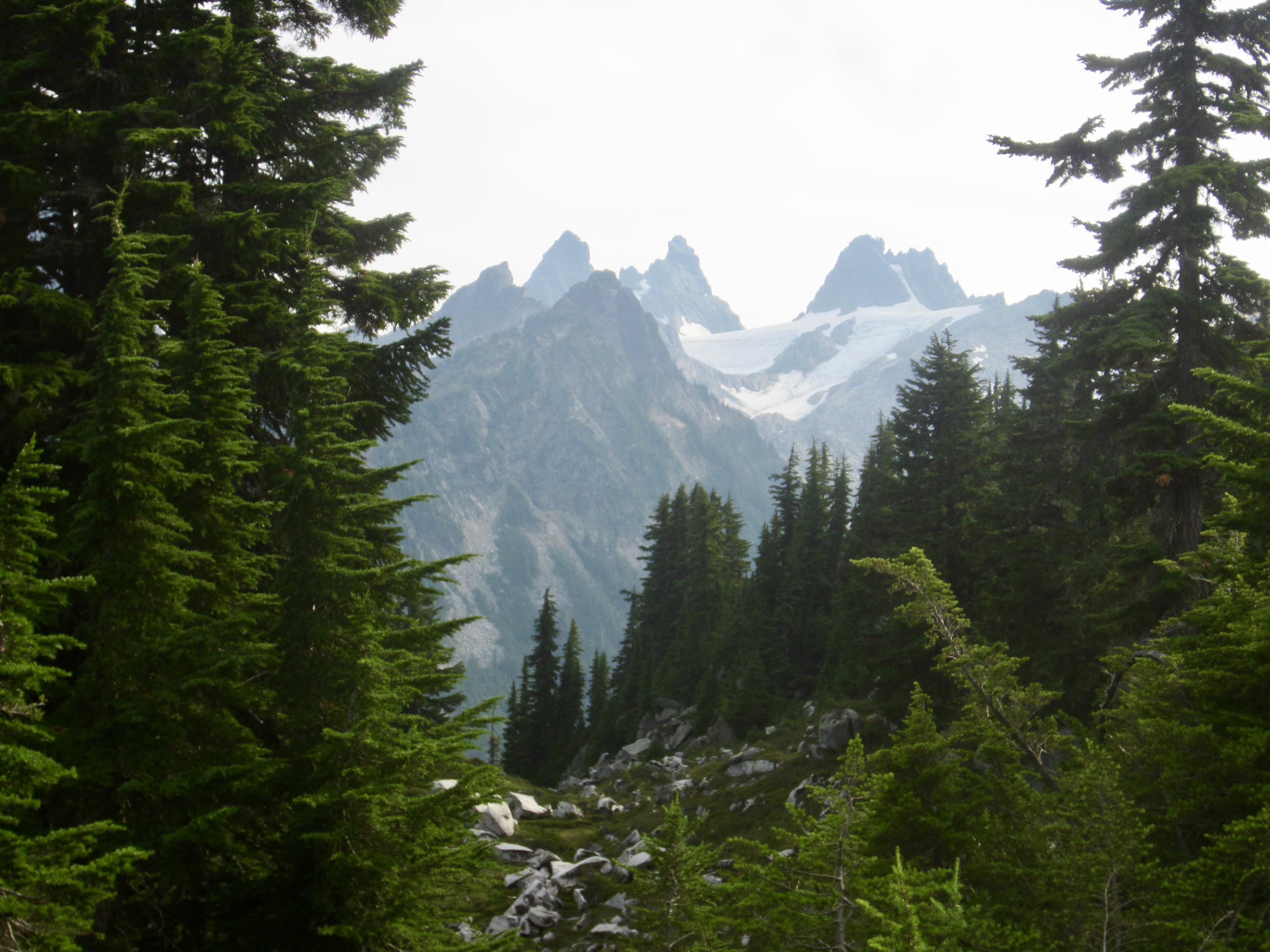 Rain showers and light fog moved in during the early morning hours, prompting us to pack up rather hastily at dawn. Eileen and I headed out with Andrew and the other couple. We followed boot tread and scattered ducks out of the lake basin, then descended 1000 feet on moraine rubble to reach Necklace Valley. Good trail took us through the valley and down to the East Fork Foss River Trail, from where it was a straightforward 5-mile hike out to the trailhead. Jim A. met us on the trail and joined us for the last ¼ mile. We arrived at the parking lot in mid-afternoon (7.4 hours + 10.0 miles + 500 feet from Camp 4) to conclude a very memorable traverse.
