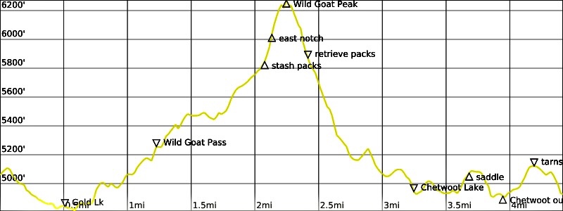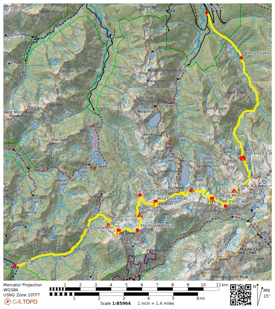 Way Points: Dingford Creek & Goat Creek & Myrtle Lake & Big Snow Creek & Big Snow Lake & Snowflake Lake & Big Snow Mountain summit & Hardscrabble Gap & Gold Lake Tarns & Gold Lake Knoll & Gold Lake & Wild Goat Pass & Wild Goat Peak slope & Chetwoot Lake & Little Chetwoot Lake & Azure Tarns & Azure Lake & Iron Cap Knob & Iron Cap Lake & Iron Cap Mountain slope & Iron Cap Basin & Iron Cap Pass & Tank Lakes Plateau & South Tank Lake & Tank Pass & Necklace Valley & Opal Lake & Necklace Cabin & Jade Lake & Necklace Creek & East Fork Foss River & Alturas Lake & Burn Creek Bridge (trail hike & bushwhack & off-trail hike & rock scramble)
