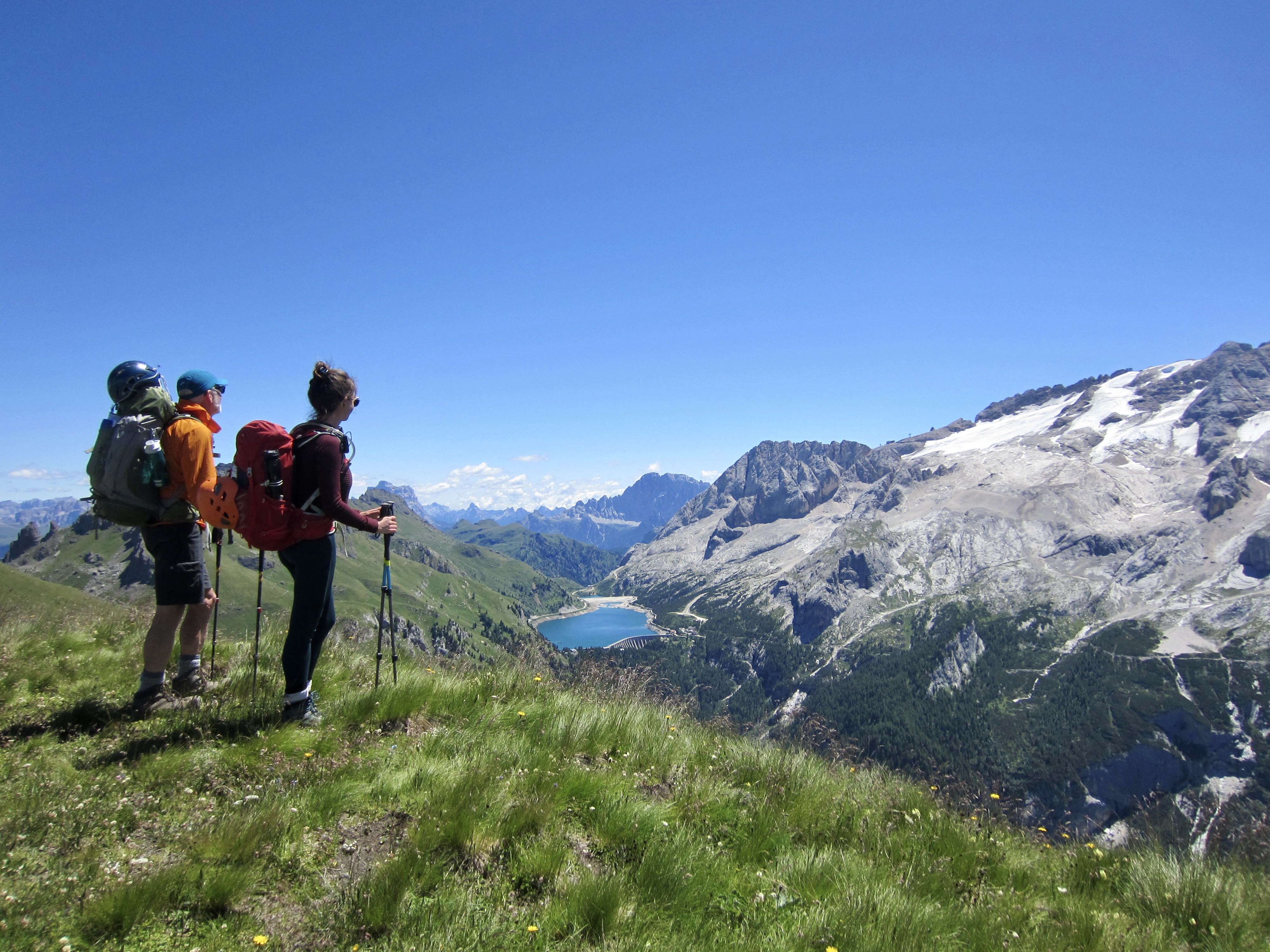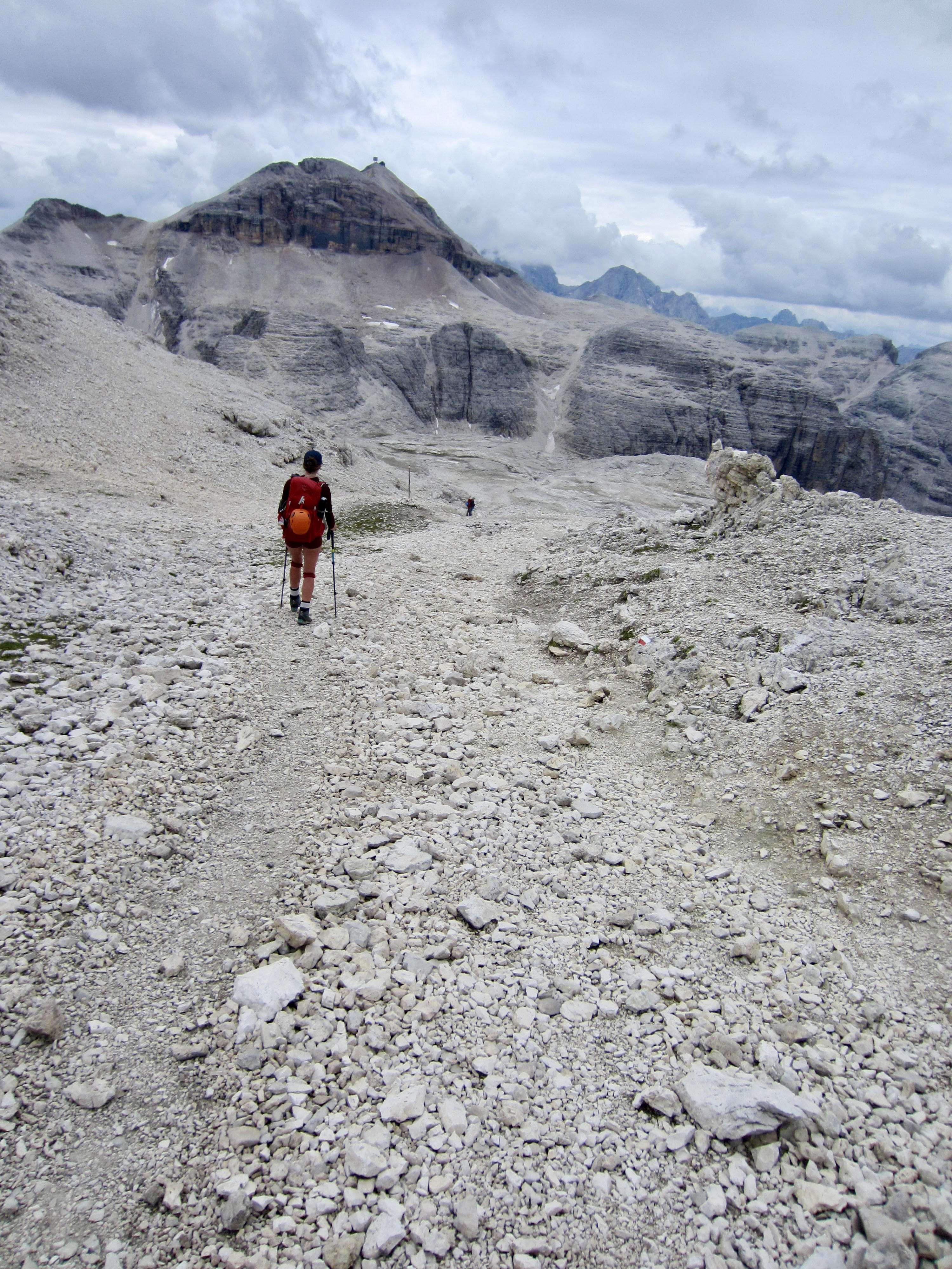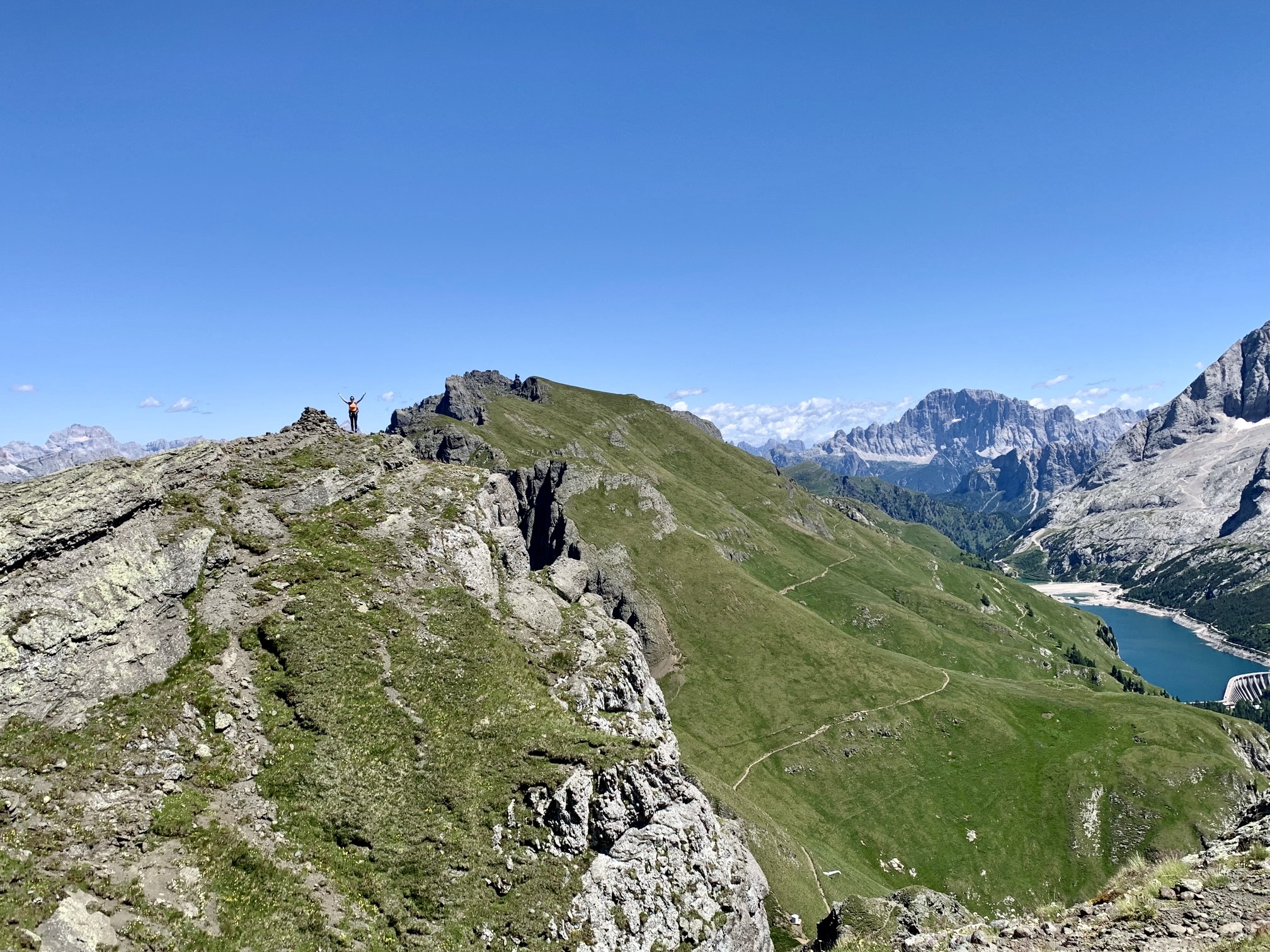 We spent our afternoon making an easterly traverse down to Lake Fedaia. Eileen stayed on AV2 and completed the traverse in less than 2 hours, whereas Brooke and I elected to take a higher (and rougher) variant trail that ran along the crest of Cappello Ridge. A short Class 3 rock scramble gained us the summit of Sass Cappello for marvelous views in all directions.