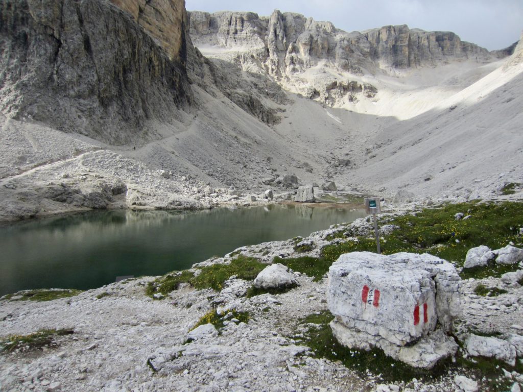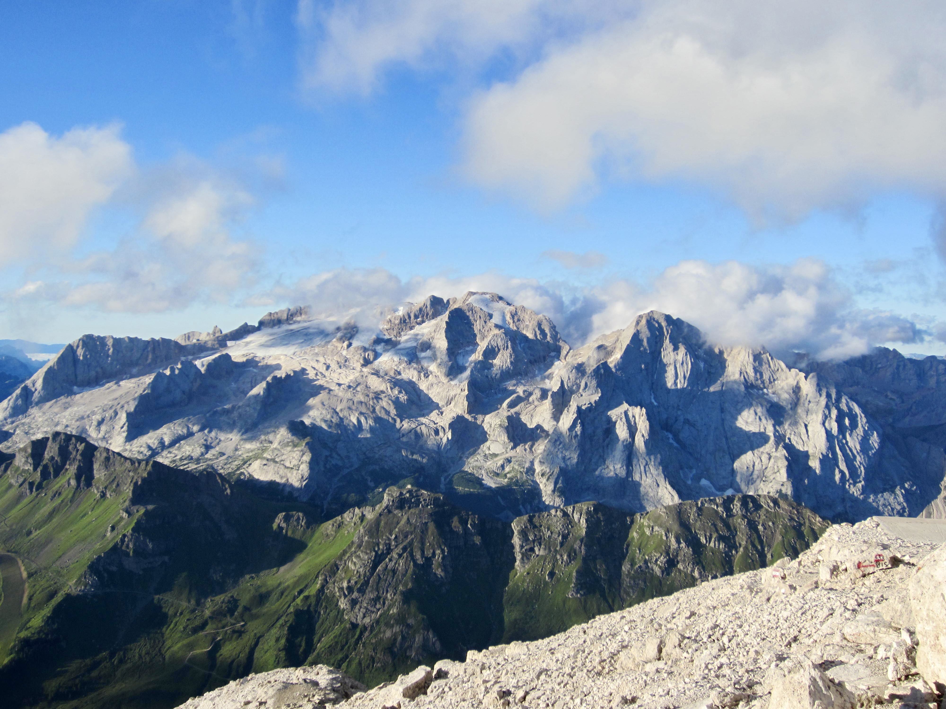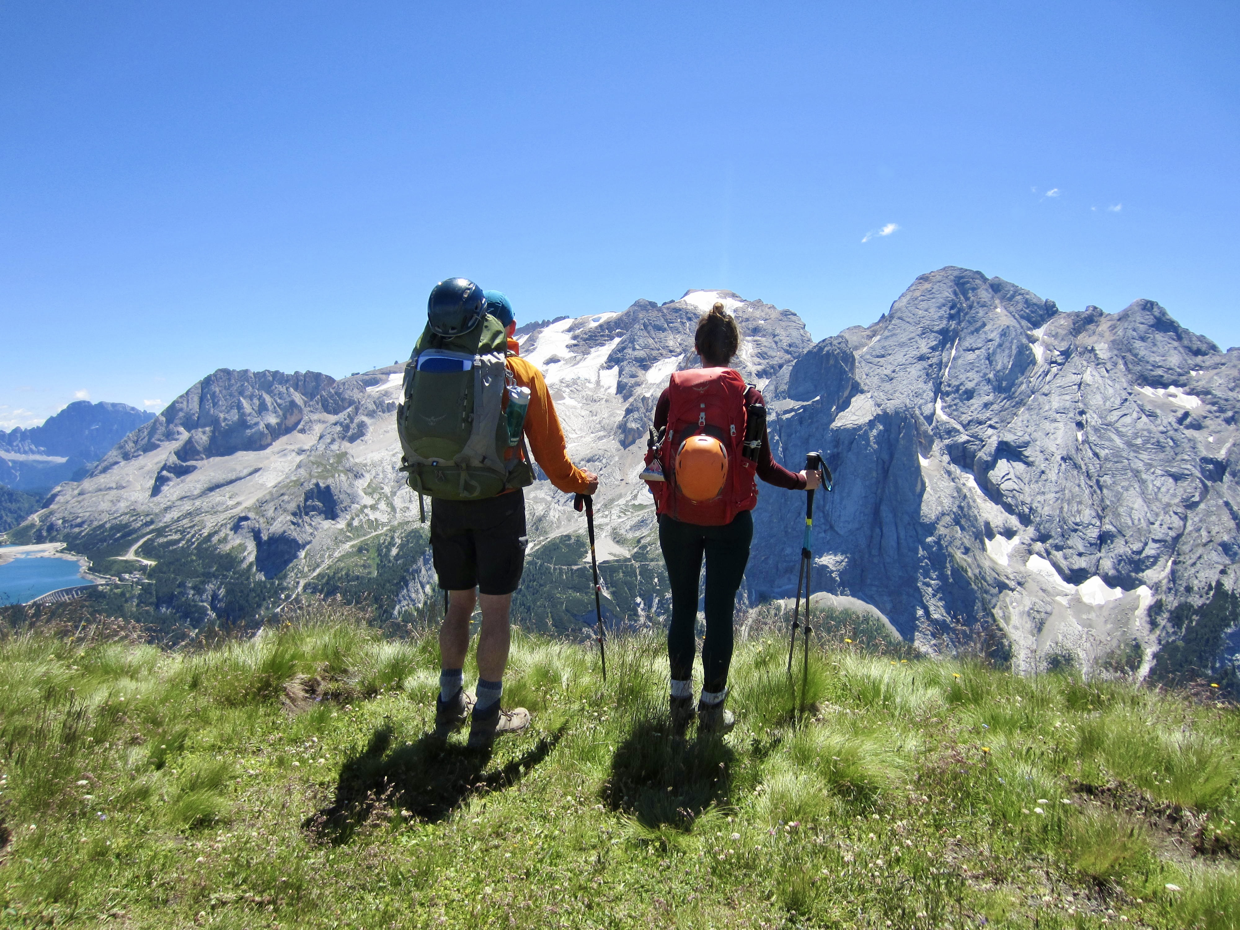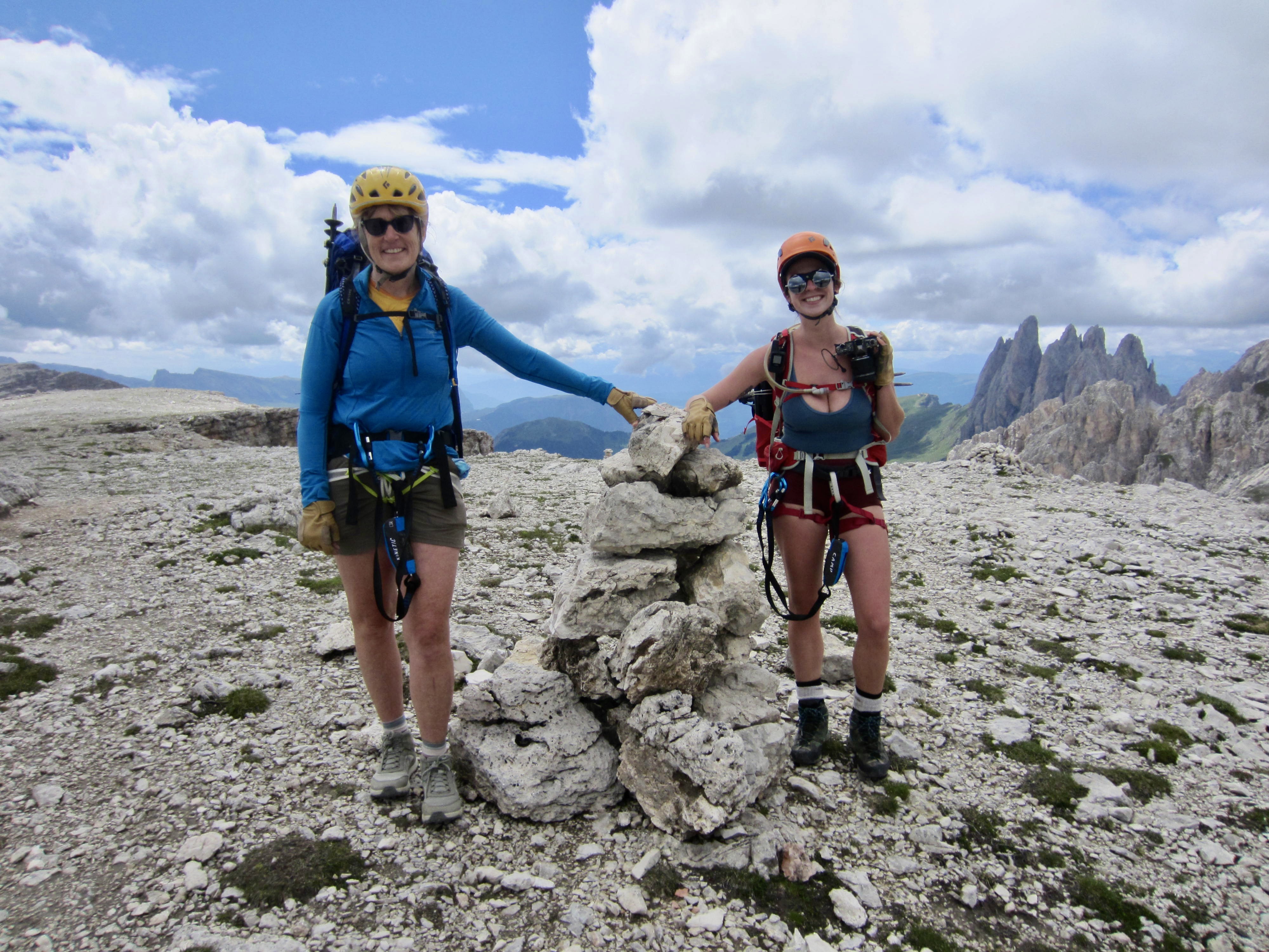 We spent our afternoon making an easterly traverse down to Lake Fedaia. Eileen stayed on AV2 and completed the traverse in less than 2 hours, whereas Brooke and I elected to take a higher (and rougher) variant trail that ran along the crest of Cappello Ridge. A short Class 3 rock scramble gained us the summit of Sass Cappello for marvelous views in all directions.