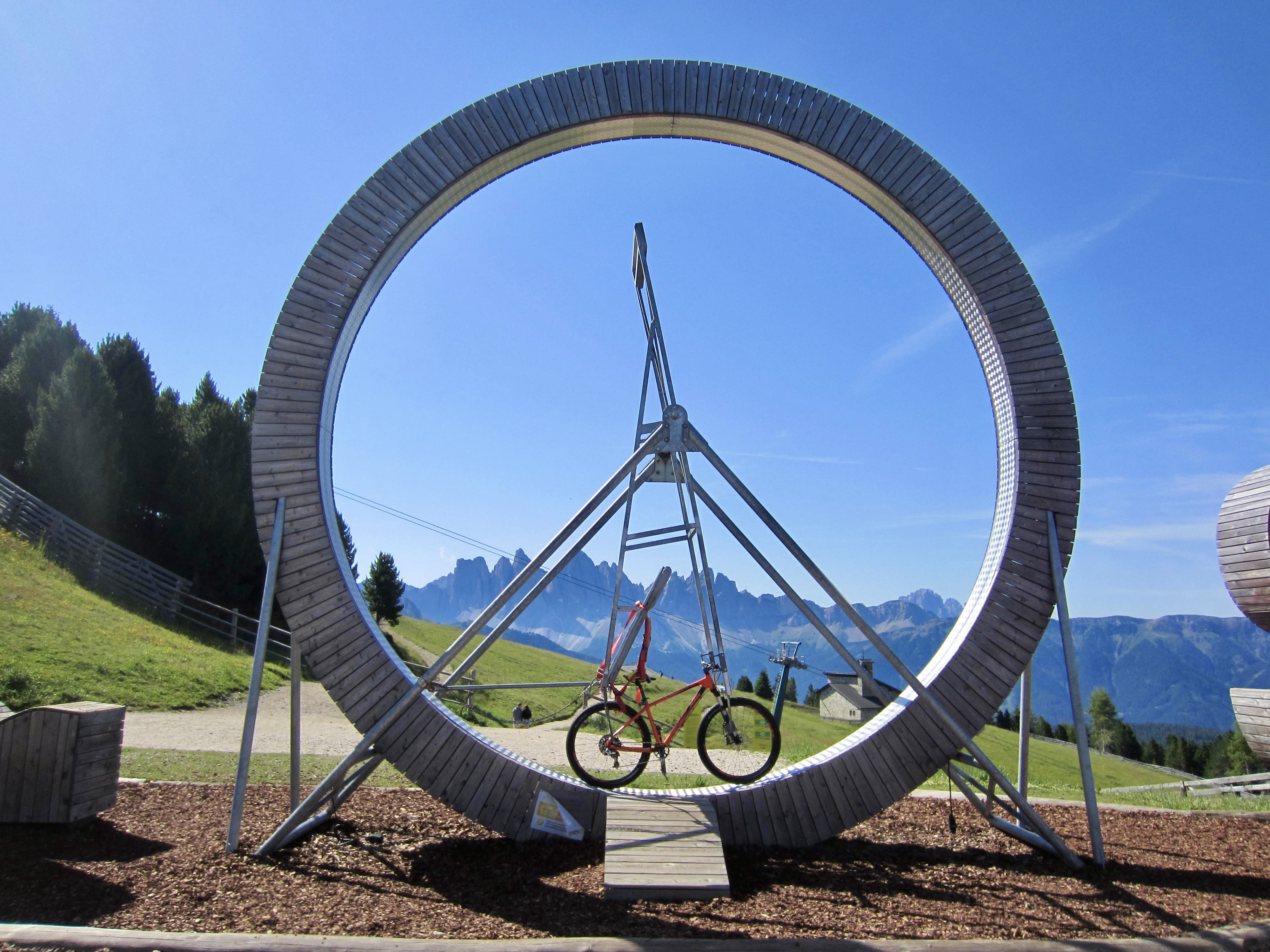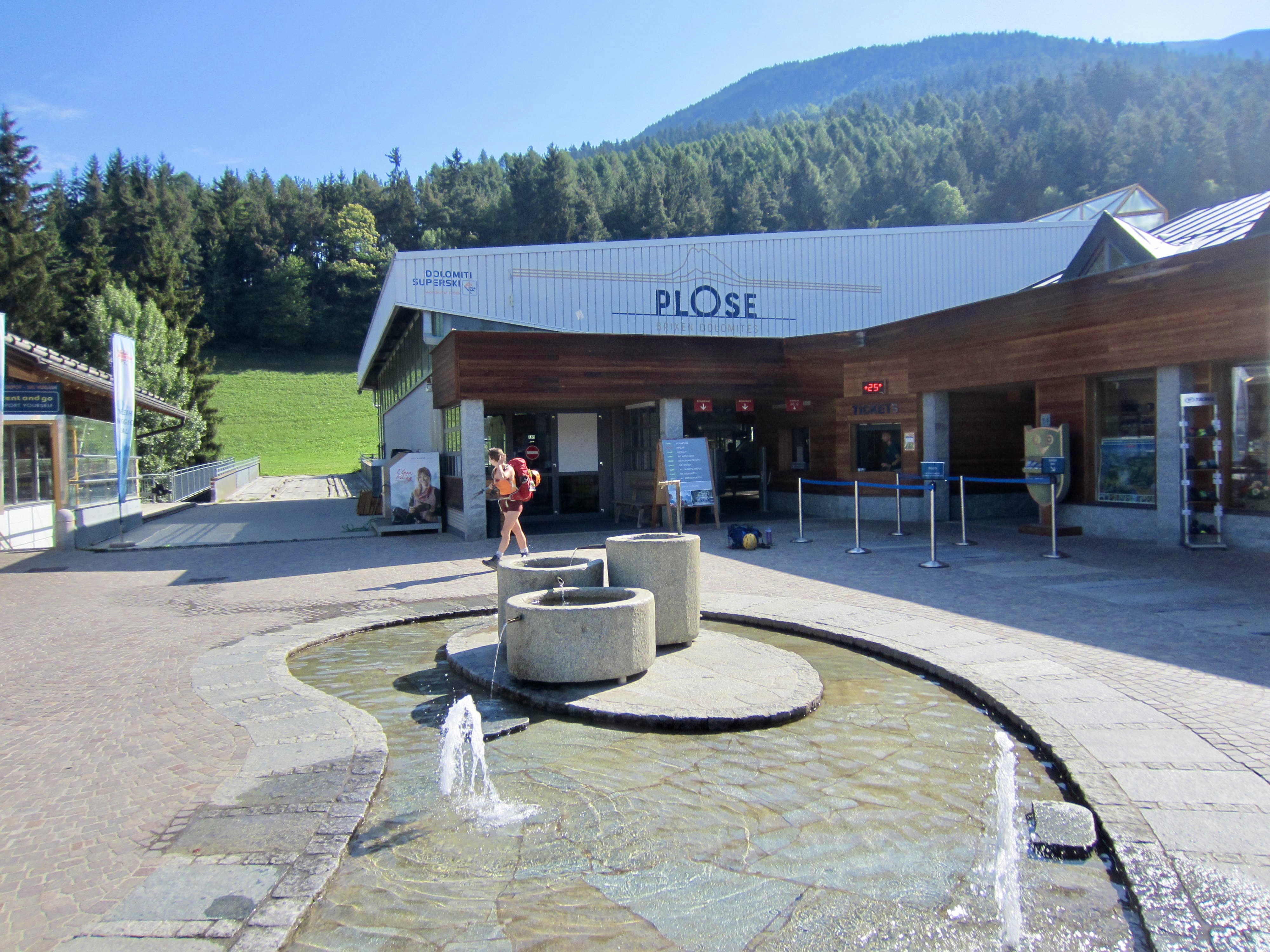Following an overnight stay in the charming ski town of Brixen/Bressanone, we took a taxi up to the Plose Gondola base station, then rode the gondola to the top station. (Taking the gondola saved us nearly 3400 feet, or 1000 meters, of elevation gain and buckets of sweat on this hot morning.) The top area was swarming with day-hikers, long-trekkers, and mountain bikers of all ages.