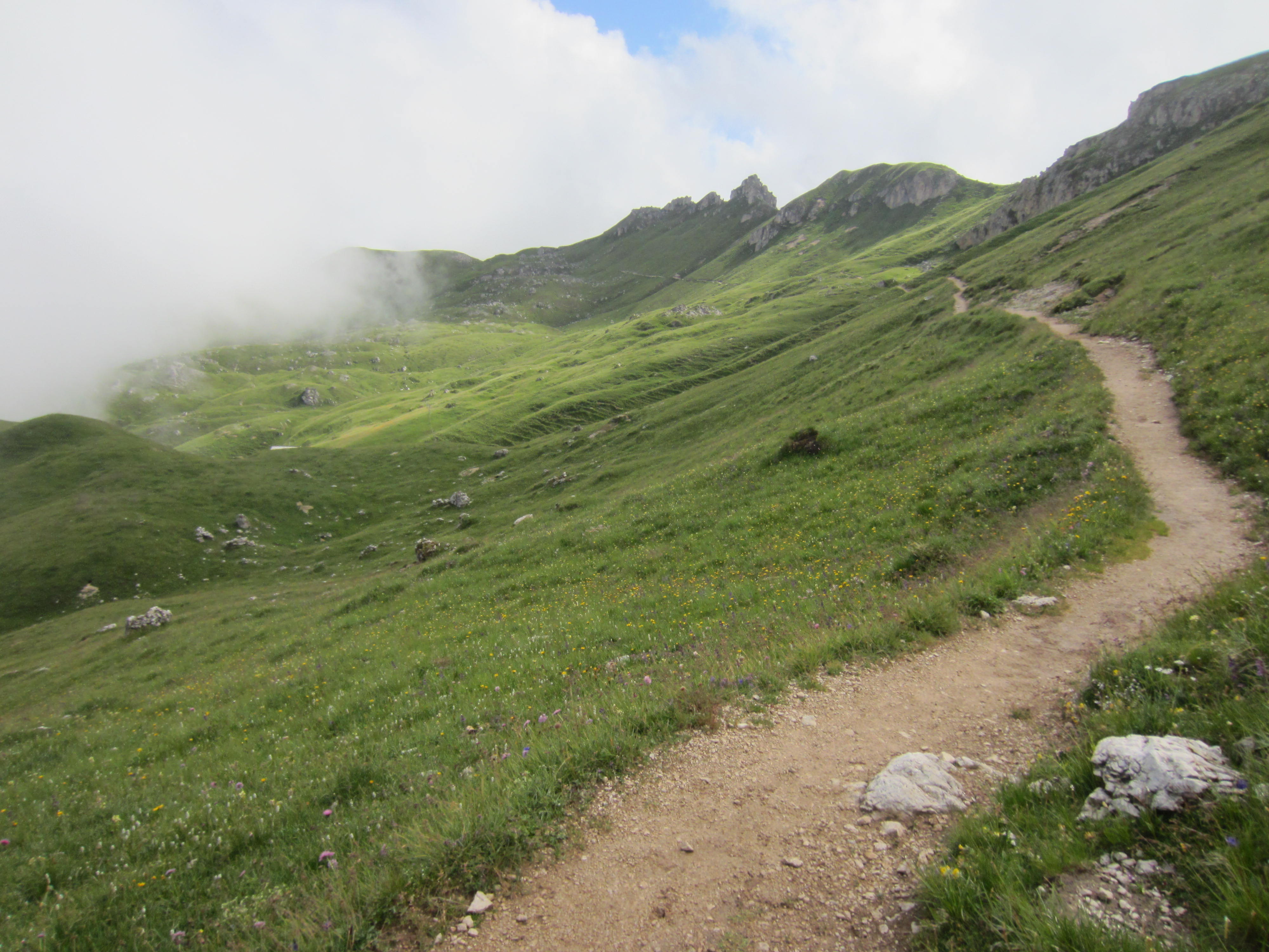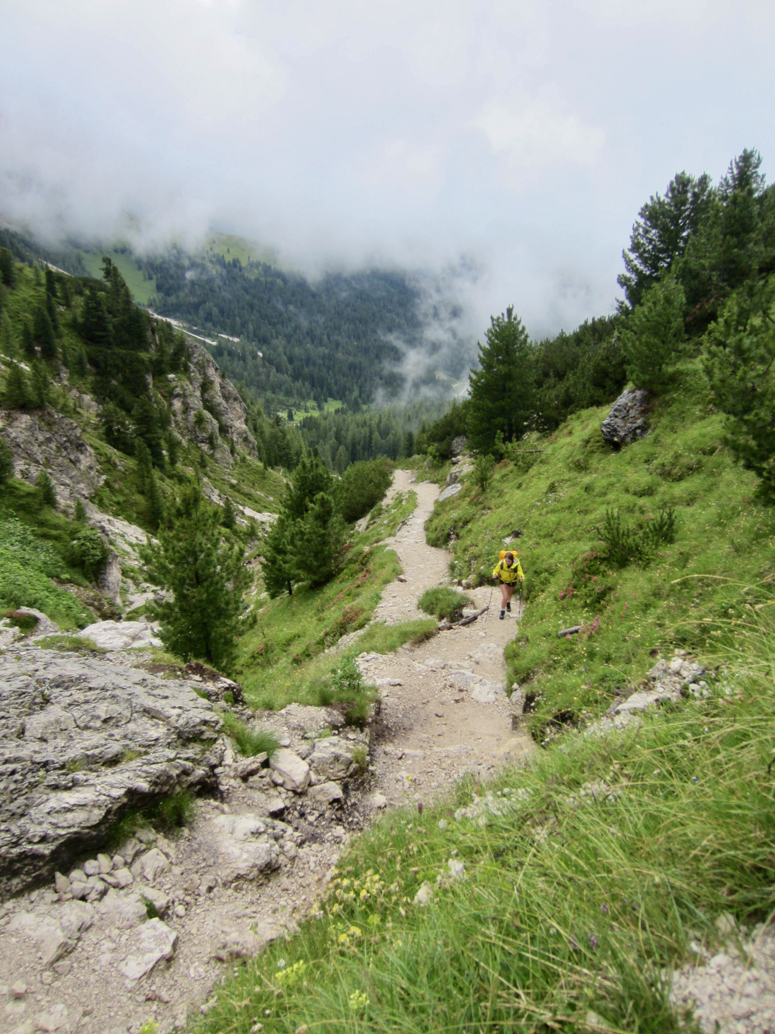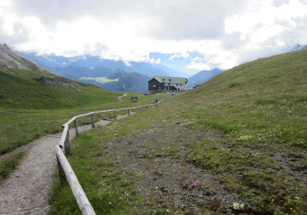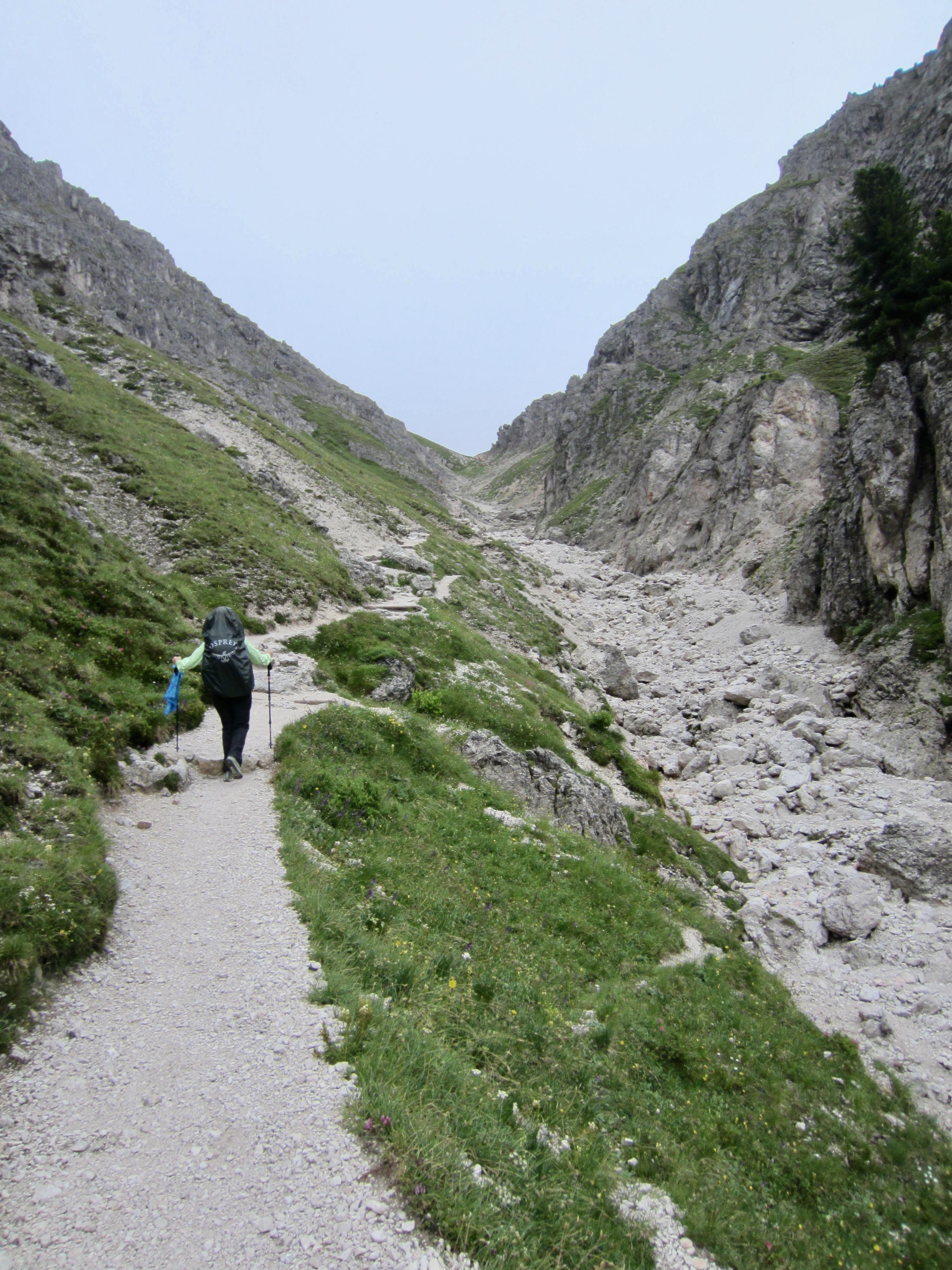 Eileen and Brooke dropped their rucksacks at the pass and scurried off to do a via ferrata ascent of Putia/Peitlerkofel, the highest peak in this mountain group. Sadly for me, I was suffering with a badly swollen knee and was relegated to being a bench warmer—at least until a cold fog prompted me to move on. The pleasant trail led me through strikingly green meadows and down to Schluter/Genova Hut, our destination for today.