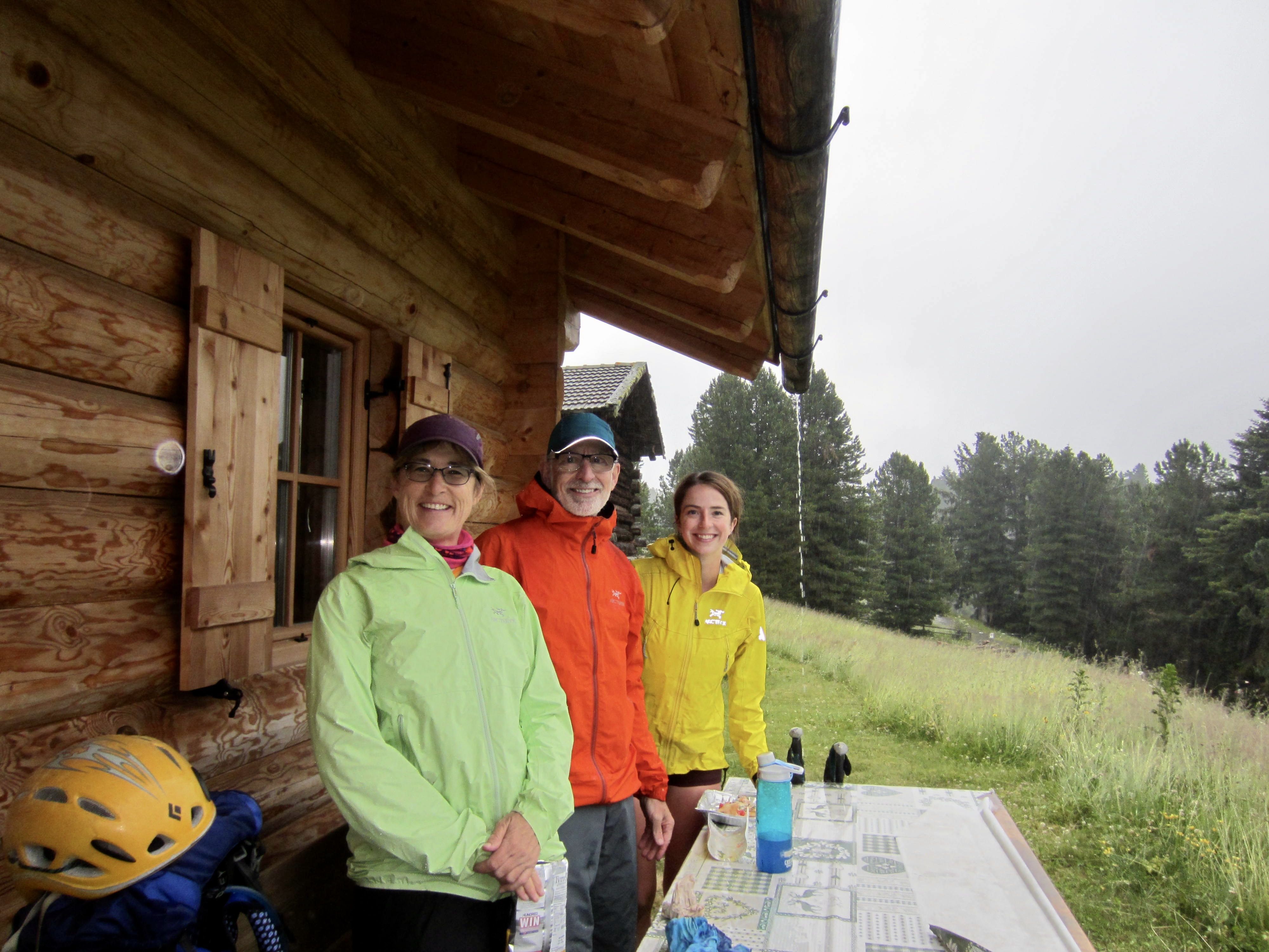 Eileen and Brooke arrived at the hut a couple hours later, just in time for dinner. Although this was not the first mountain hut any of us had ever stayed at, it was our first night in a fully catered Alpine hut, and we thoroughly enjoyed the experience of being served a tasty, three-course dinner—with wine, no less! Being a vehicle-accessible hut, Schluter/Genova offers better meals than most of the remote mountain huts and, as we later learned, is a favorite among Dolomite trekkers.