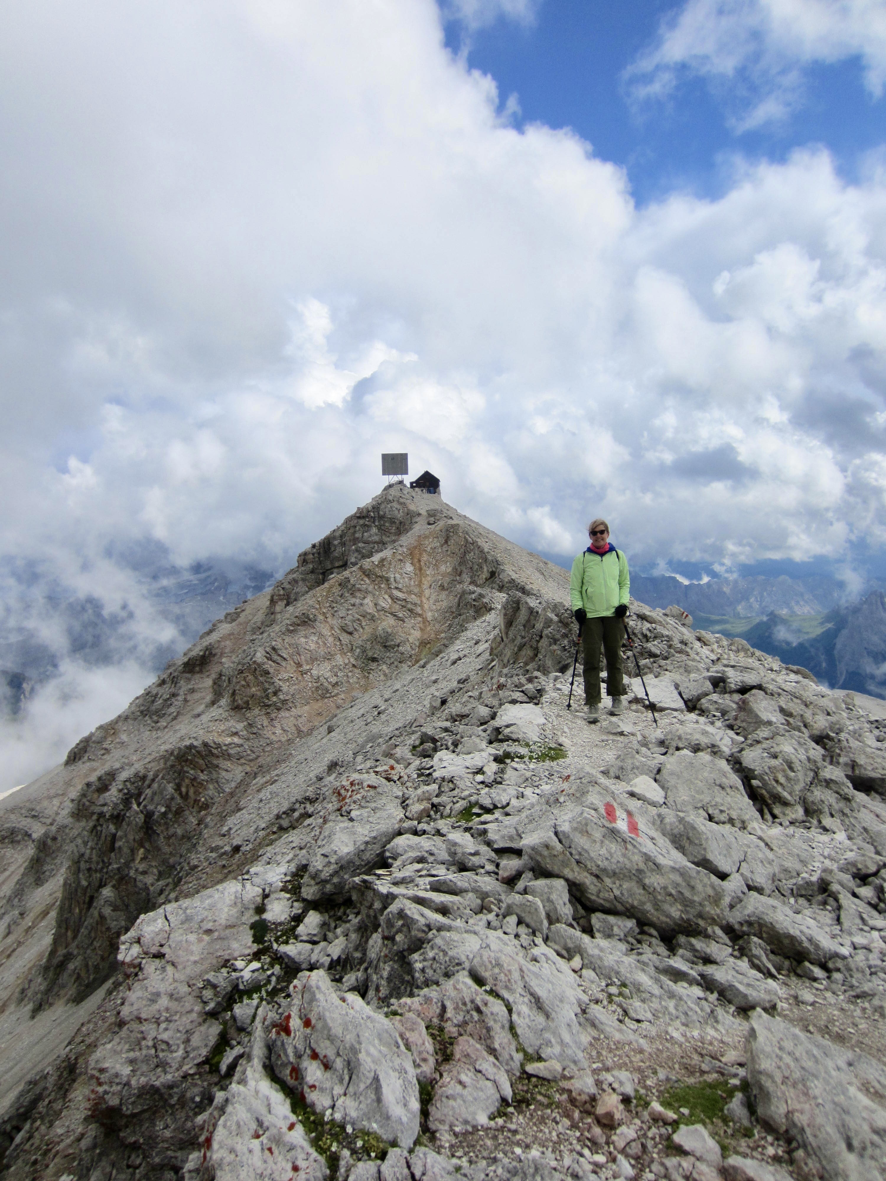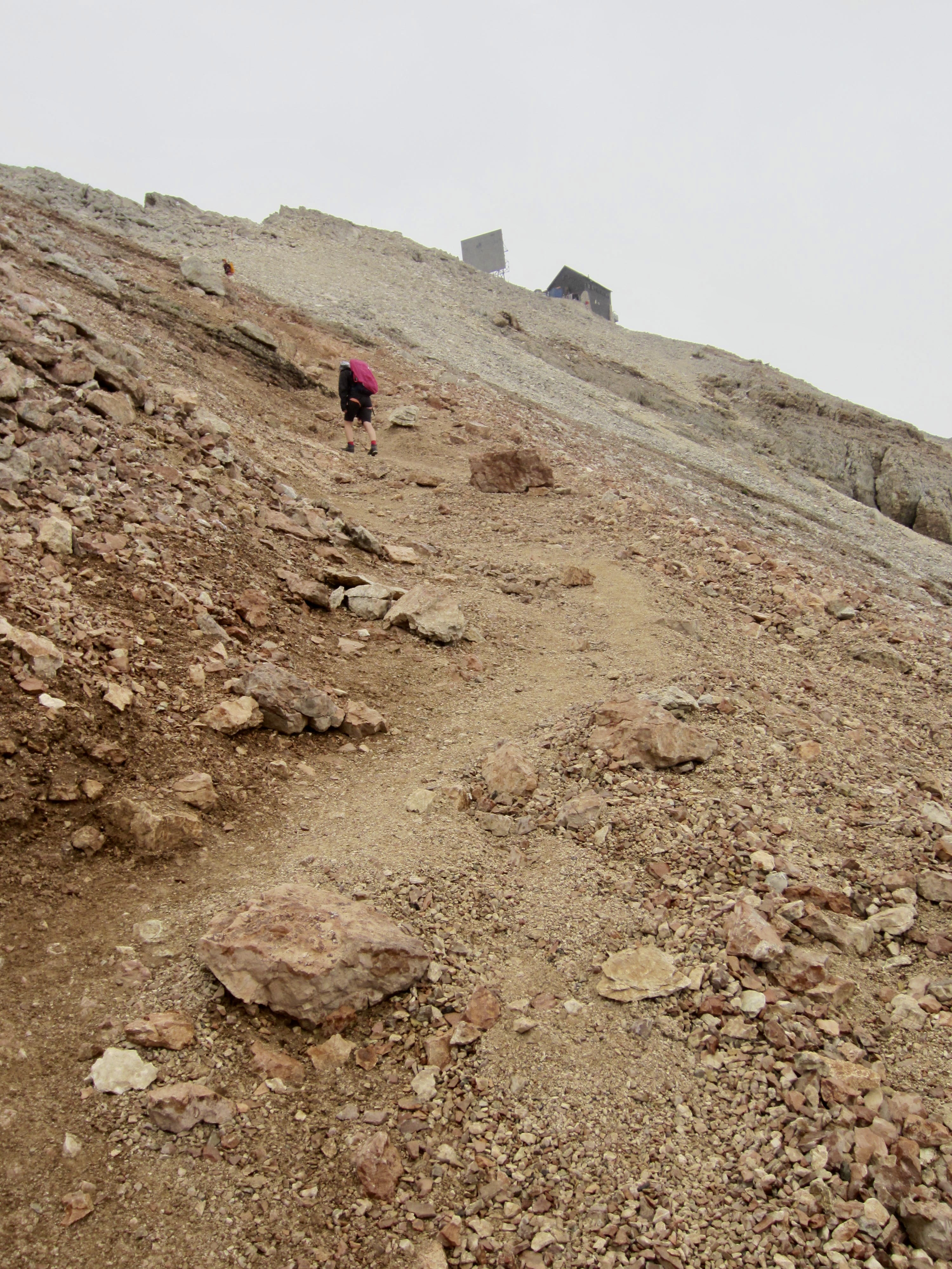 During our steep hike from Boe Hut to the summit of Piz Boe, raindrops started to fall and rumbles of thunder could be heard. Higher up, we were pelted with wind-driven snow and hail. As improbable as it seemed that there could be a cozy hut on this lofty summit, we were certainly happy to arrive in the middle of a thunderstorm!