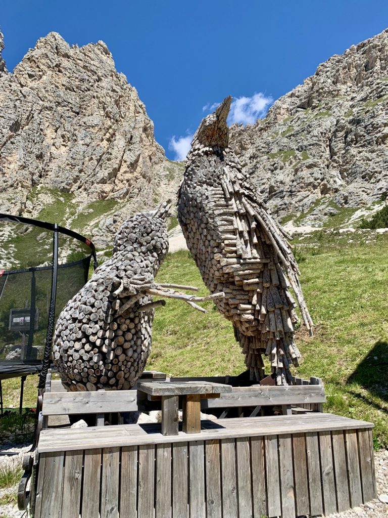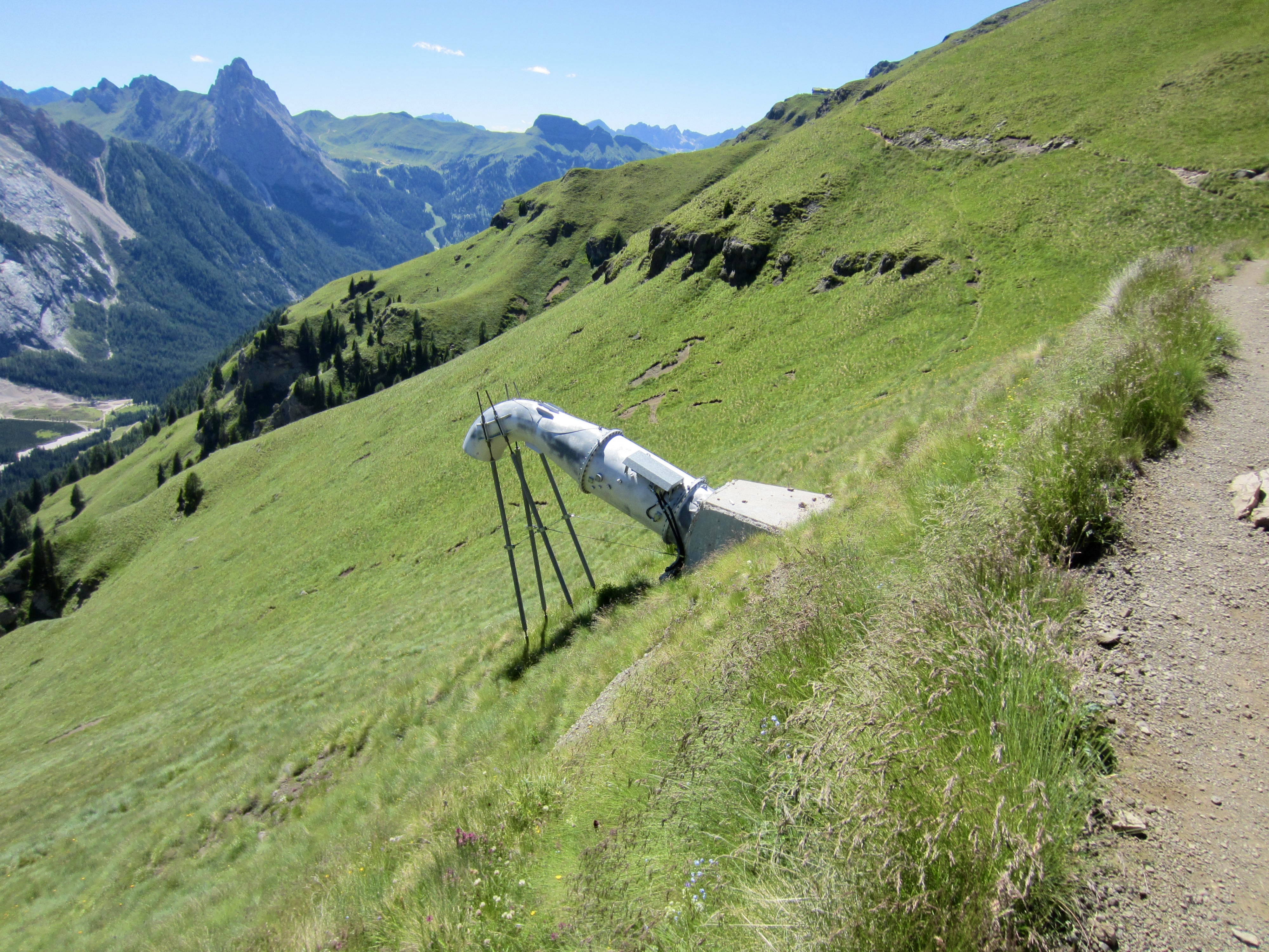 From below the summit of Sass Cappello, we skidded down a super-steep dirt path and rejoined AV2 on a grassy hillside. Interestingly, there were numerous large pipe structures, shaped like giant spigots, spaced along this hillside. Later research revealed that they are are avalanche control devices. They combine oxygen and propane to create an explosive blast that triggers small avalanches.