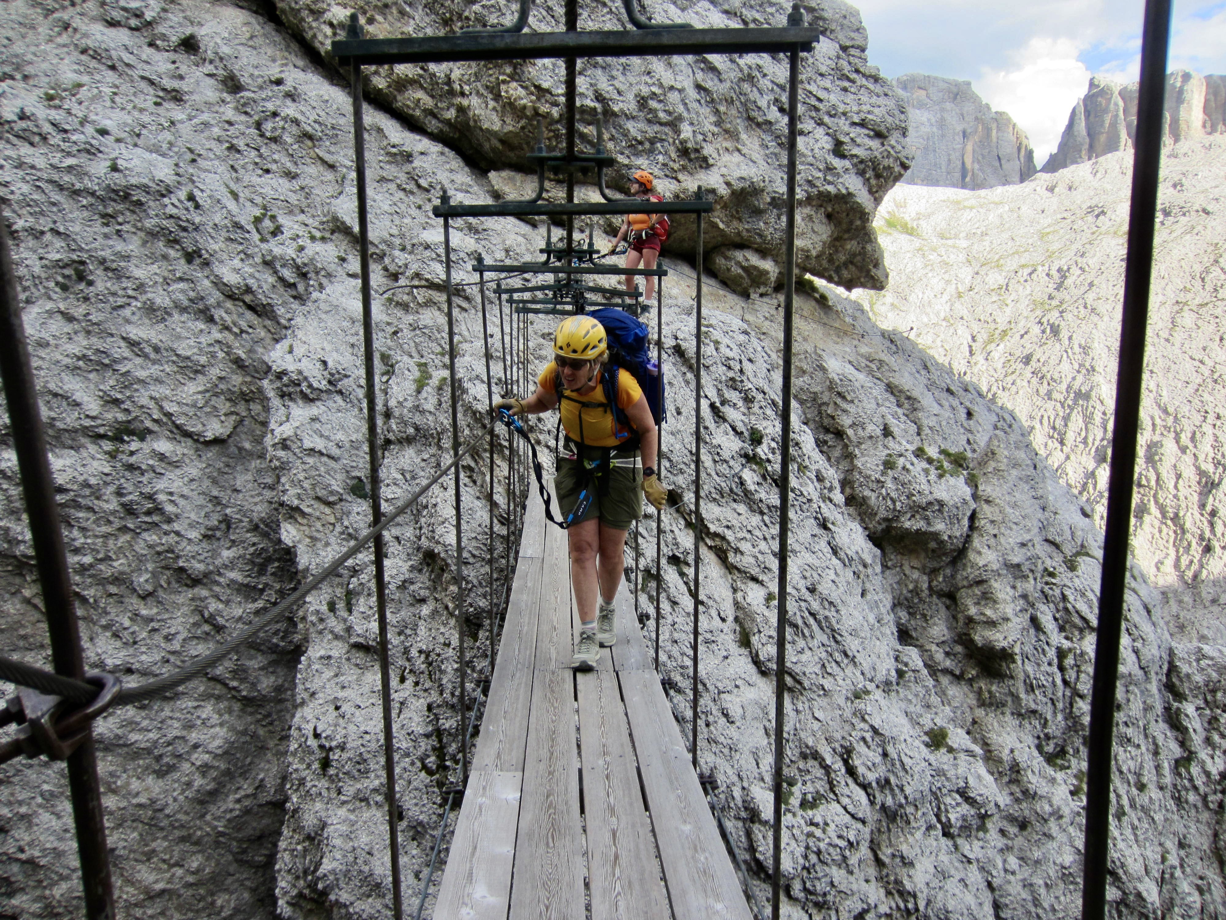 Eileen and Brooke arrived from their successful via ferrata climbs at 1:30pm, giving one a big thumbs-up and the other a so-so. Brooke stayed at Dantercepies Hut for a cold brew while Eileen and I rode a chairlift down to Gardena Pass, where we regained AV2 and began an eastward traverse to the day’s main attraction: Via Ferrata Brigata Tridentina.
