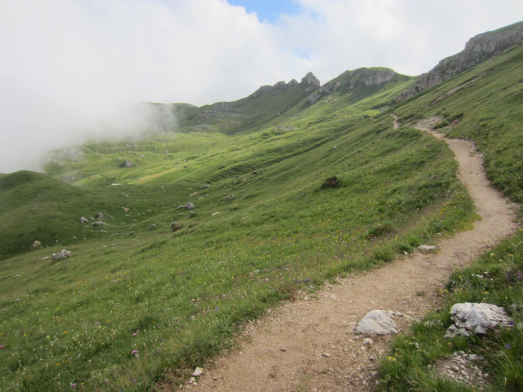 After lunch, we walked a paved road for a mile and then got back on a trail leading to Forcella Putia. (The word forcella translates to fork but is routinely used to designate any high mountain pass with a trail junction.)