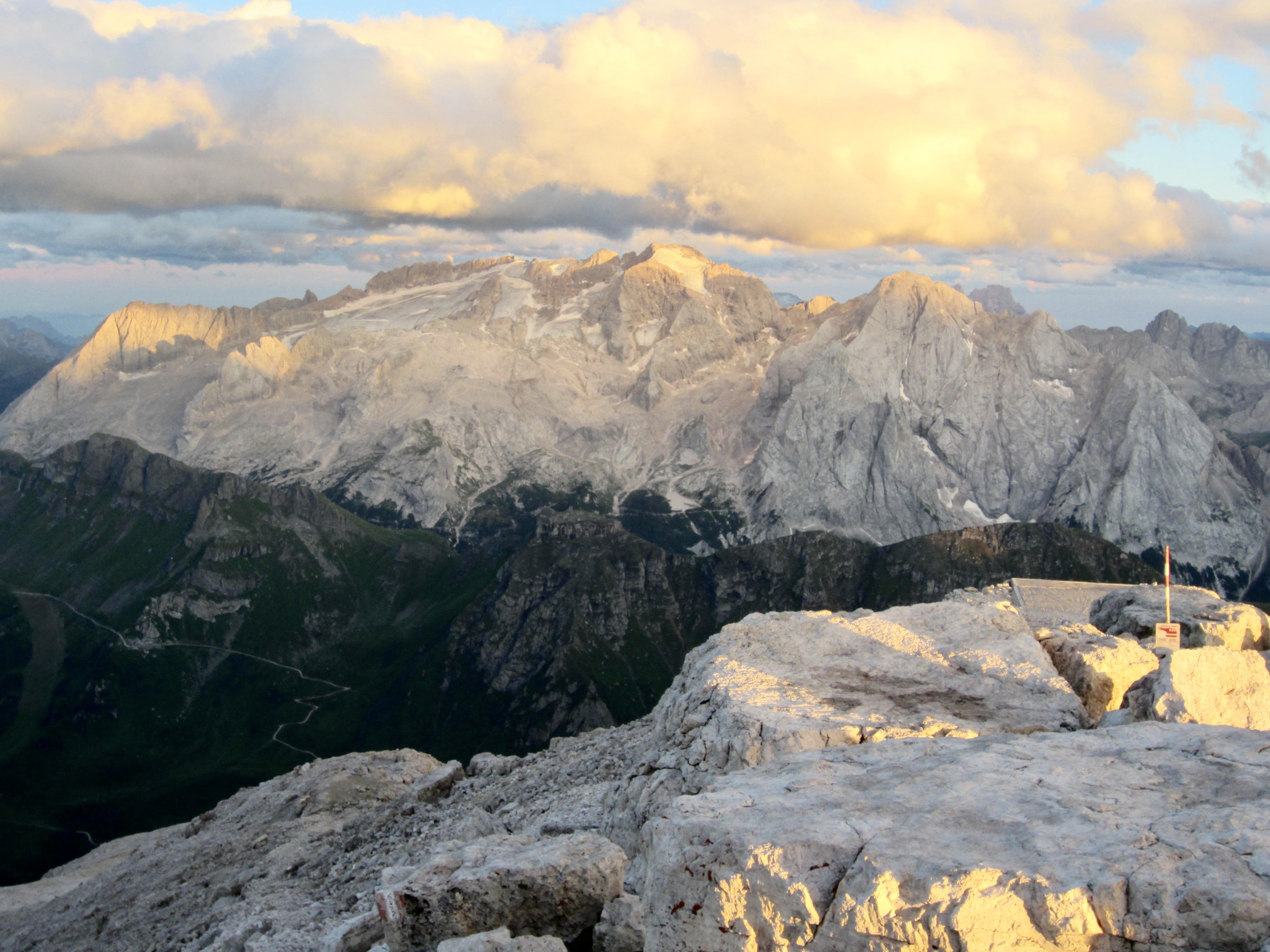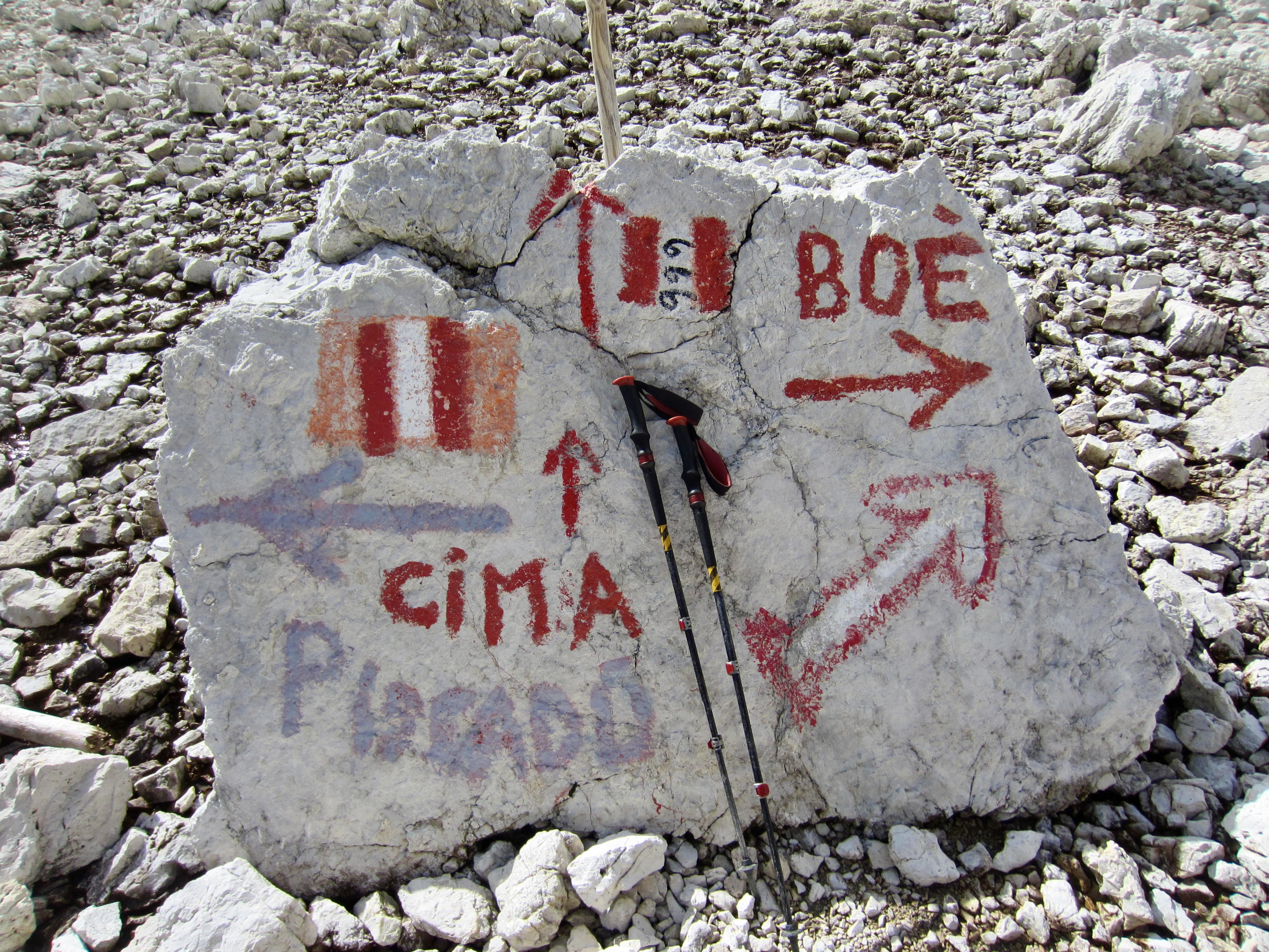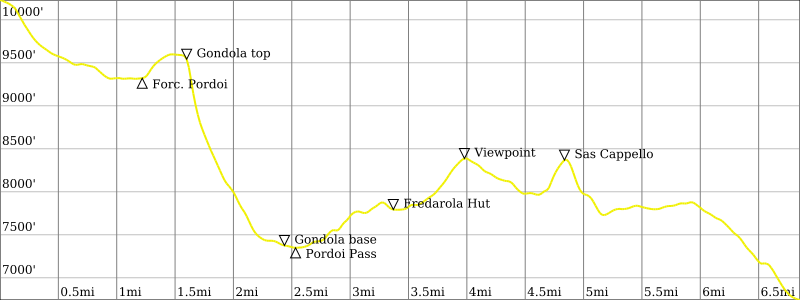 Way Points: Schnatz Creek & Edelweiss Hut & Forcella de Putia & Genova/Schluter Hut & Forcella Roa & Puez Hut & Forcella Crespeina & Forcella Cir & Jimmy Hut & Dantercepies Hut & Gardena Pass & Pisciadu Hut & Boe Hut & Piz Boe summit / Cappanna Fassa Piz Boe Hut & Forcella Pordoi & Sas Pordoi / Maria Hut & Pordoi Pass & Cuch Col / Fredarola Hut & Viel dal Pan Hut & Cappello Ridge & Castiglioni Marmolada Hut (trail hike & trail scramble)