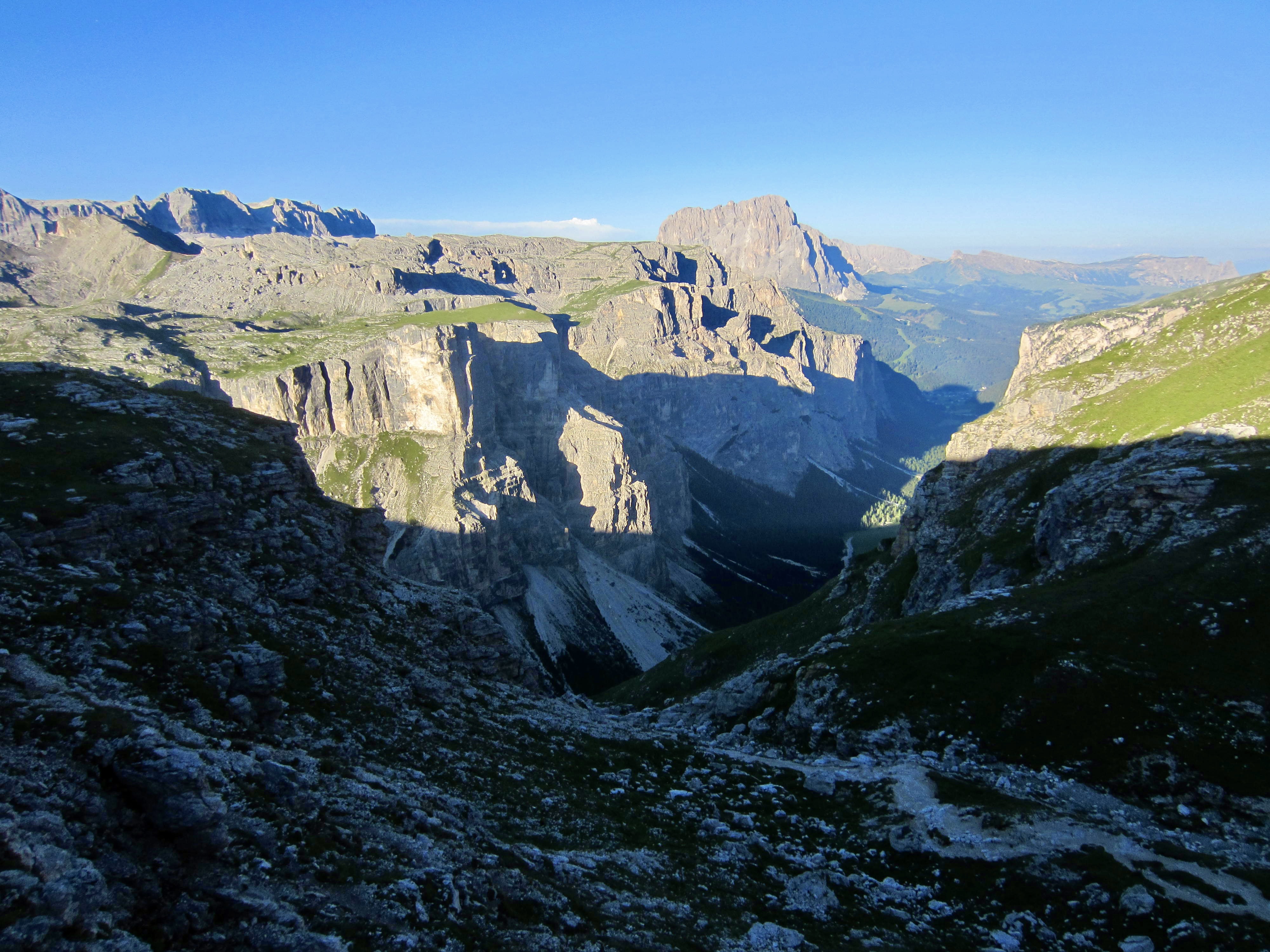 Knowing that today would be filled with several via ferratas, we left Puez Hut before breakfast was served. The kitchen staff had graciously given us “sack breakfasts” with juice, apples, rolls, and granola bars to eat on the trail. Eileen and I followed AV2 around the head of Pisuli Canyon, across a meadowy plateau, and up to 8300-foot Crespeina Pass. Brooke took an alternative high trail over the summit of Sas Ciampac and met us near the pass.