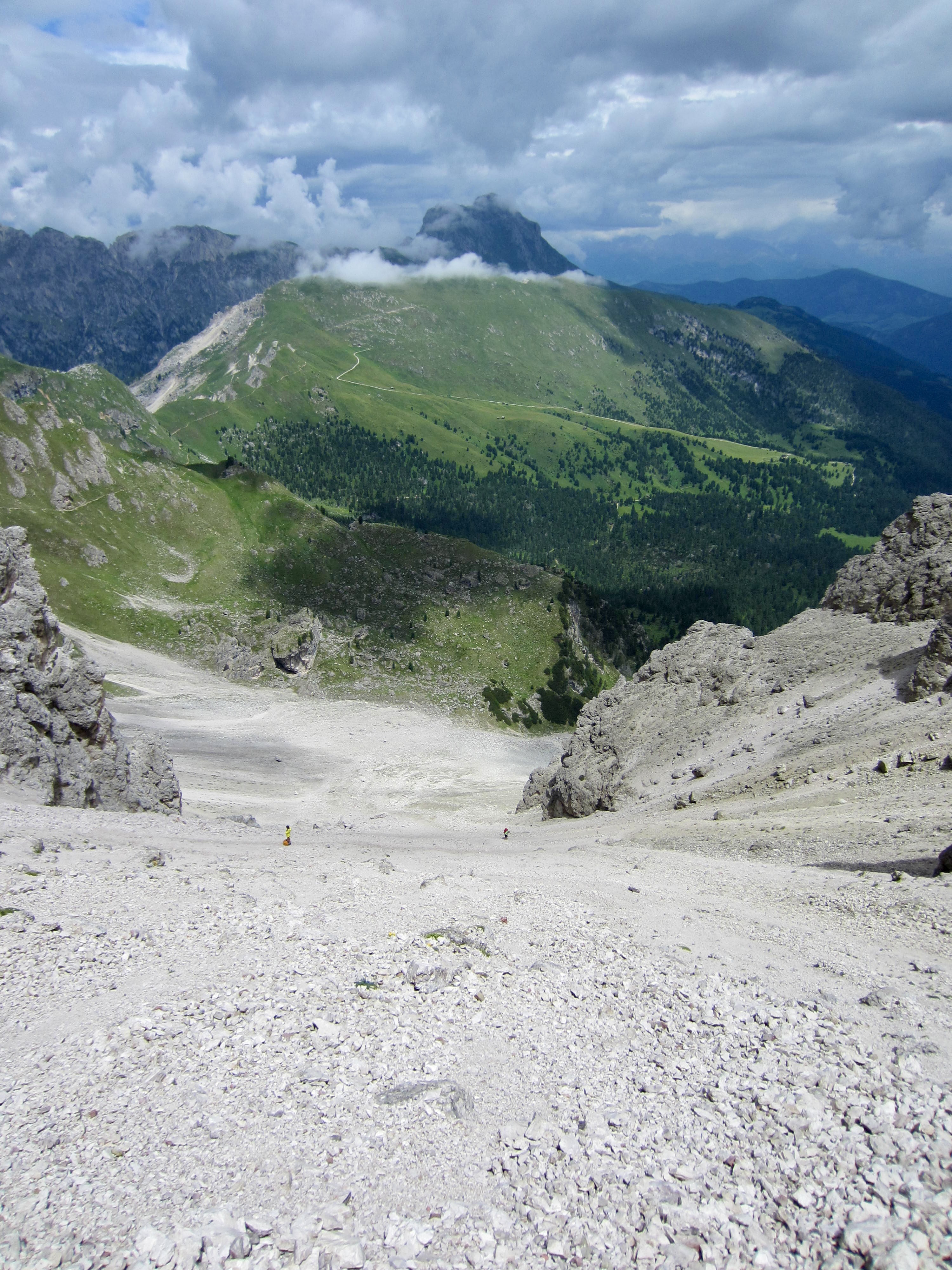 I was still on injured-reserve, so I stayed at Forcella Cir for an extra hour while Eileen and Brooke hurried off to climb two via ferrata routes on Gran Cir and Pitla Cir. By the time I left, over a hundred hikers had come up to the pass! A steep, convoluted trail led me down to civilization for a delicious lunch at Jimmy Hut and a delectable affogato at Dantercepies Hut.