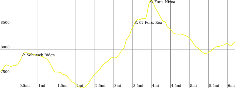 Approximate daily stats (excluding gondola ride & sidetrips): 7.0 hours elapsed; 9.0 miles / 14.5 km traveled; 2650 feet / 810 meters gained; 1800 feet / 550 meters lost.