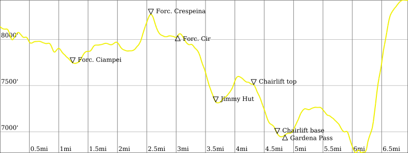 A short traverse brought us to Forcella Cir and an unexpected crowd of tourists with tiny rucksacks. We were startled to suddenly encounter so many people after being nearly alone for the past day and a half! It turned out that we were only a mile from Gardena Pass—a major recreation area with numerous gondolas, chairlifts, and restaurants.