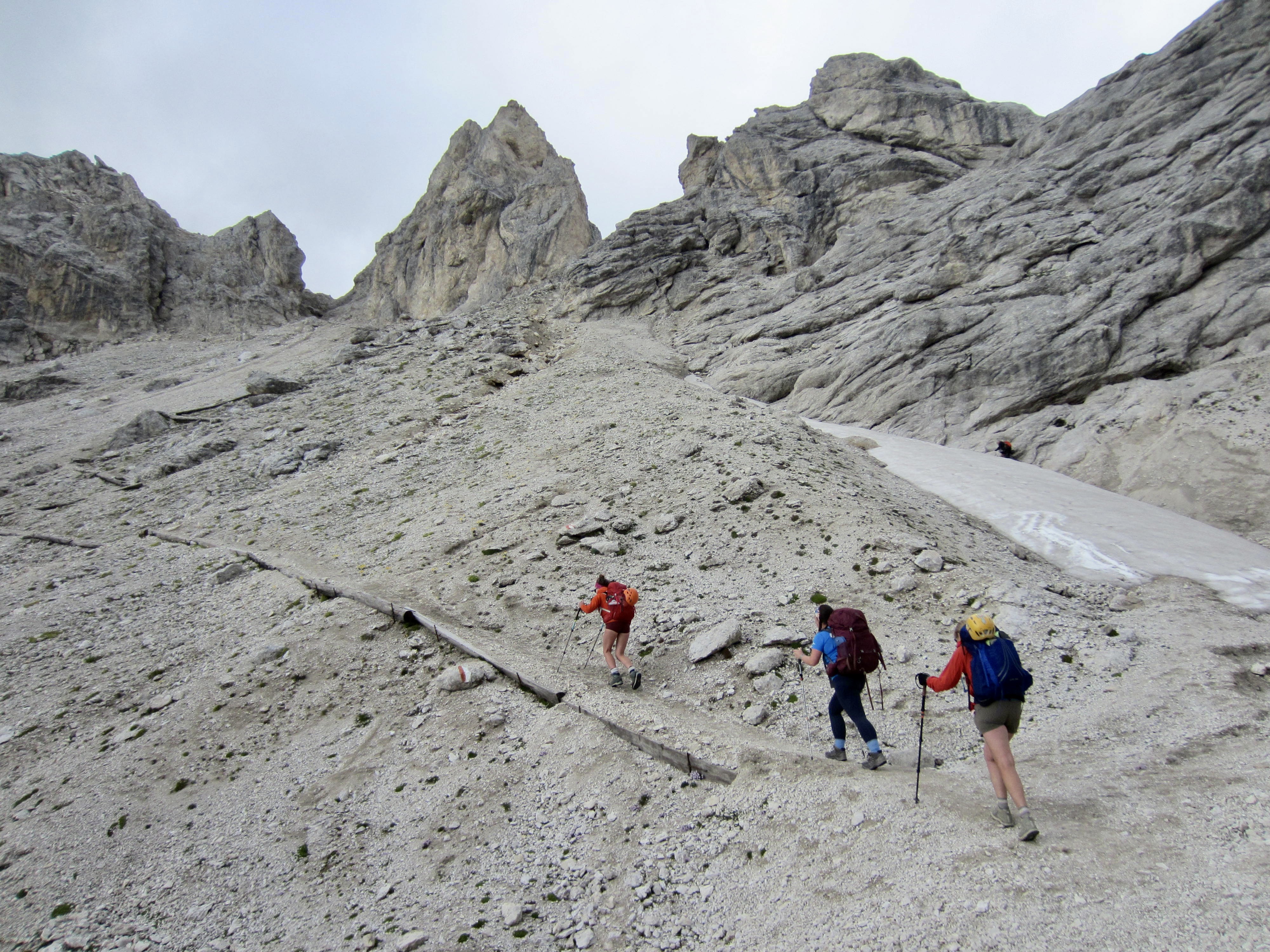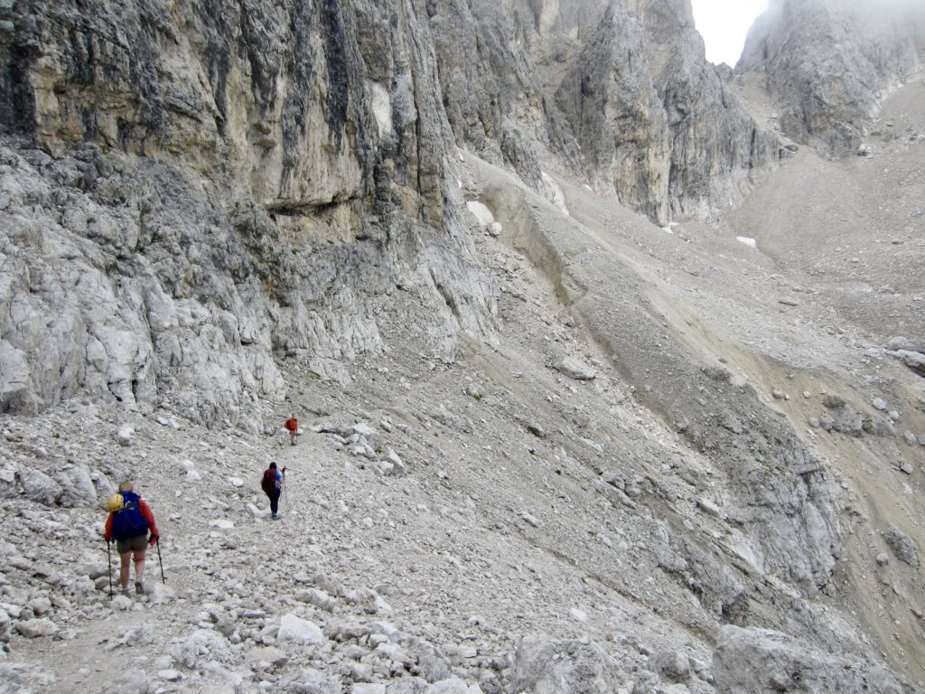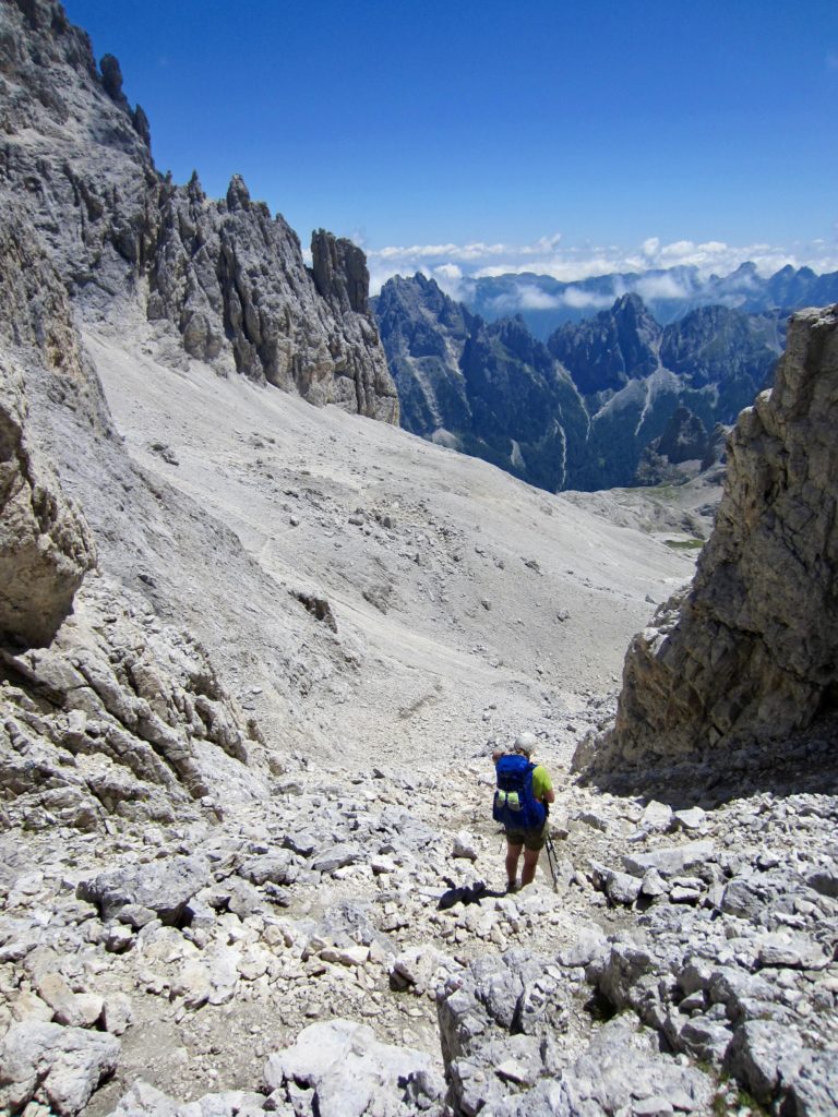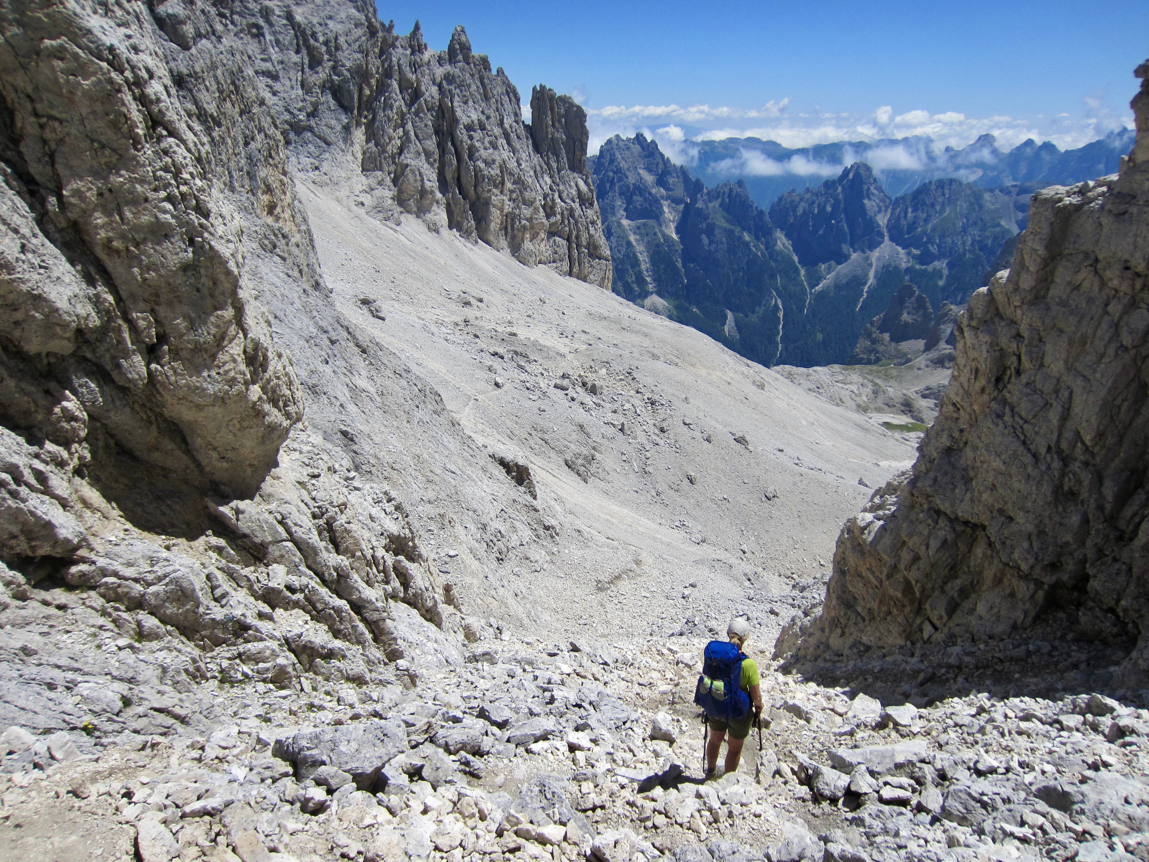Because Mulaz and Rosetta are the two highest huts on the southern part of AV2, most of our day was spent on barren slopes of scree, talus, and dolomitic outcrops. The trail led us up to Forcella Margherita, then across a talus bowl before making a steep ascent to 9000-foot Farangole Pass—the maximum elevation we reached all week.