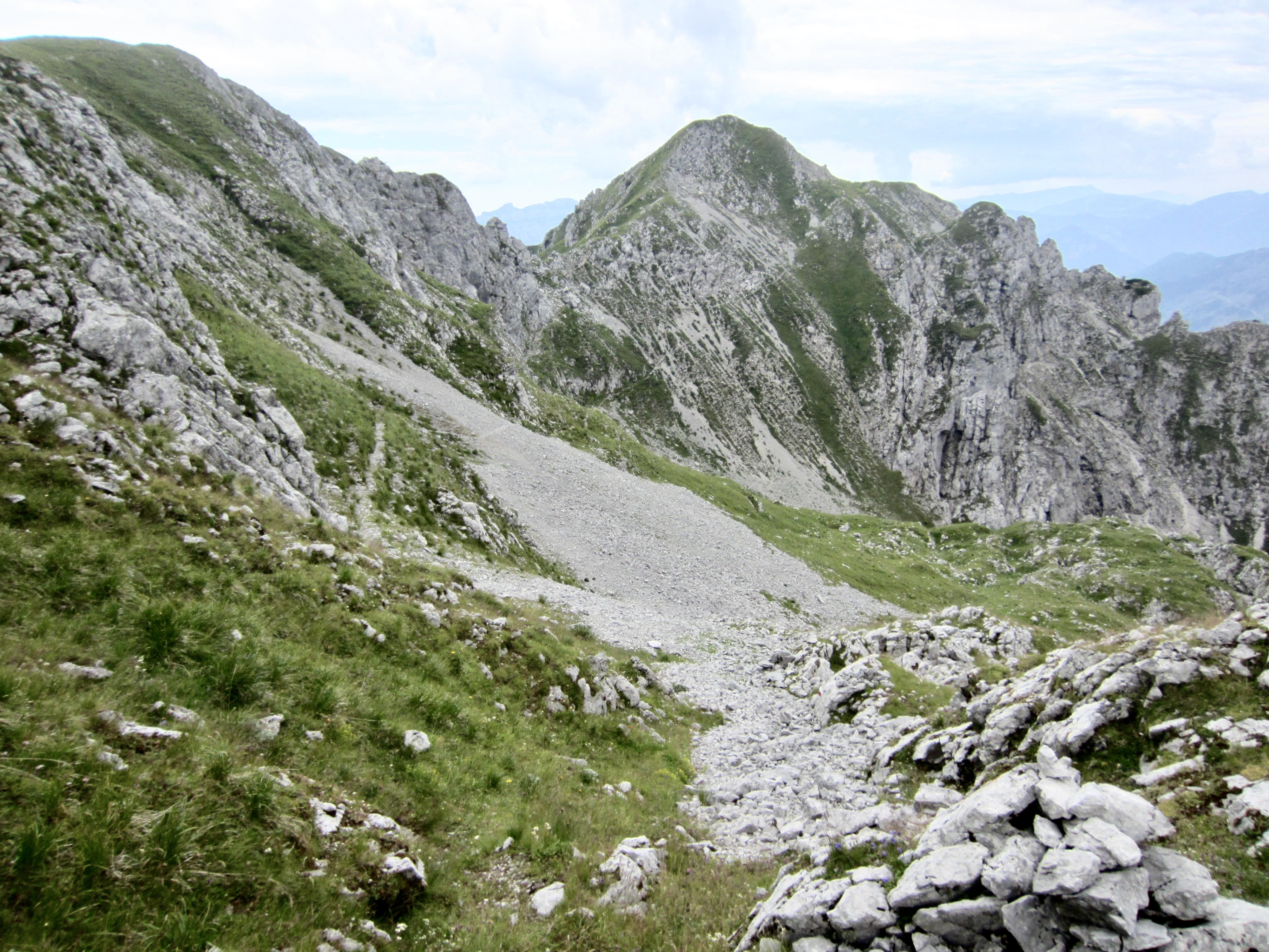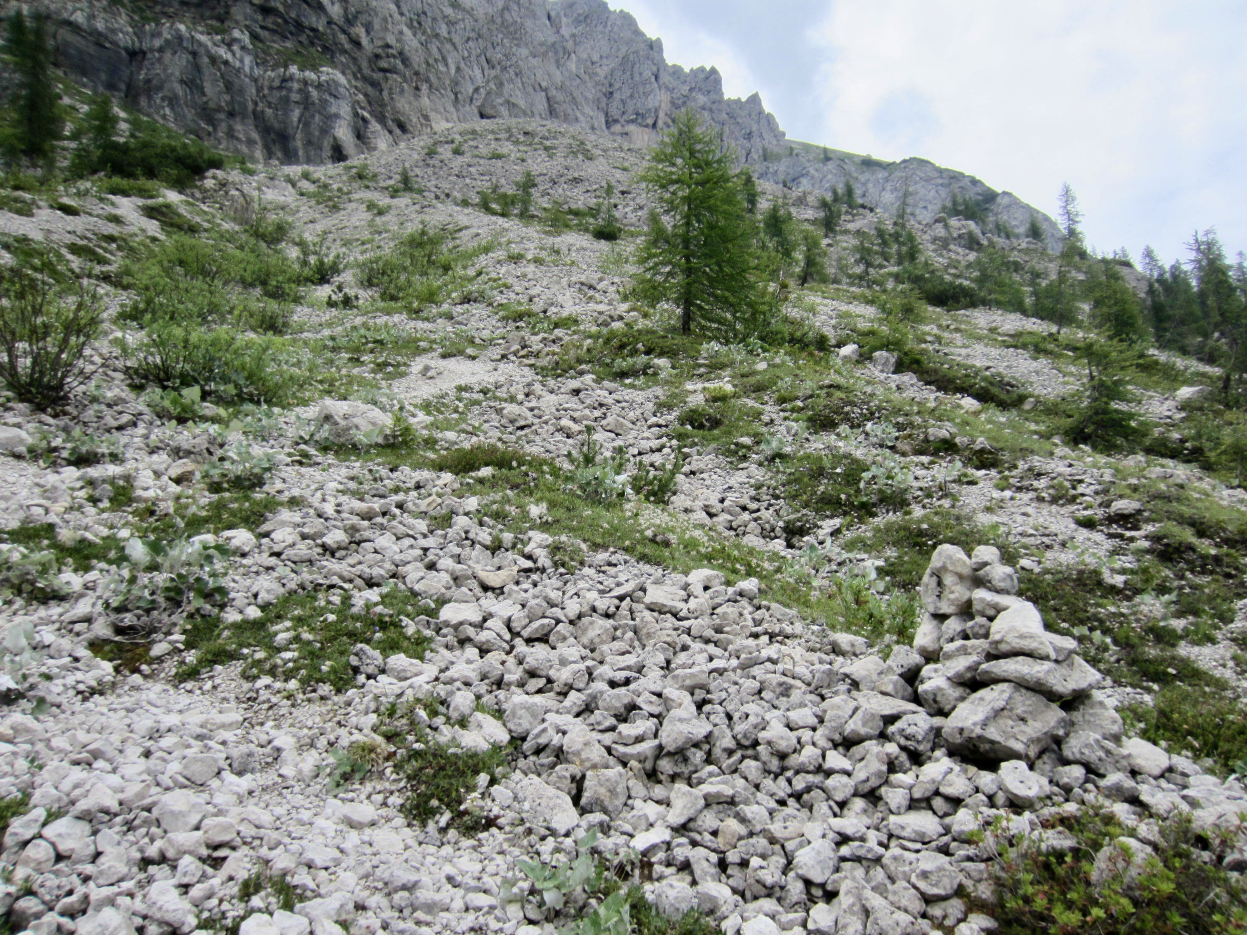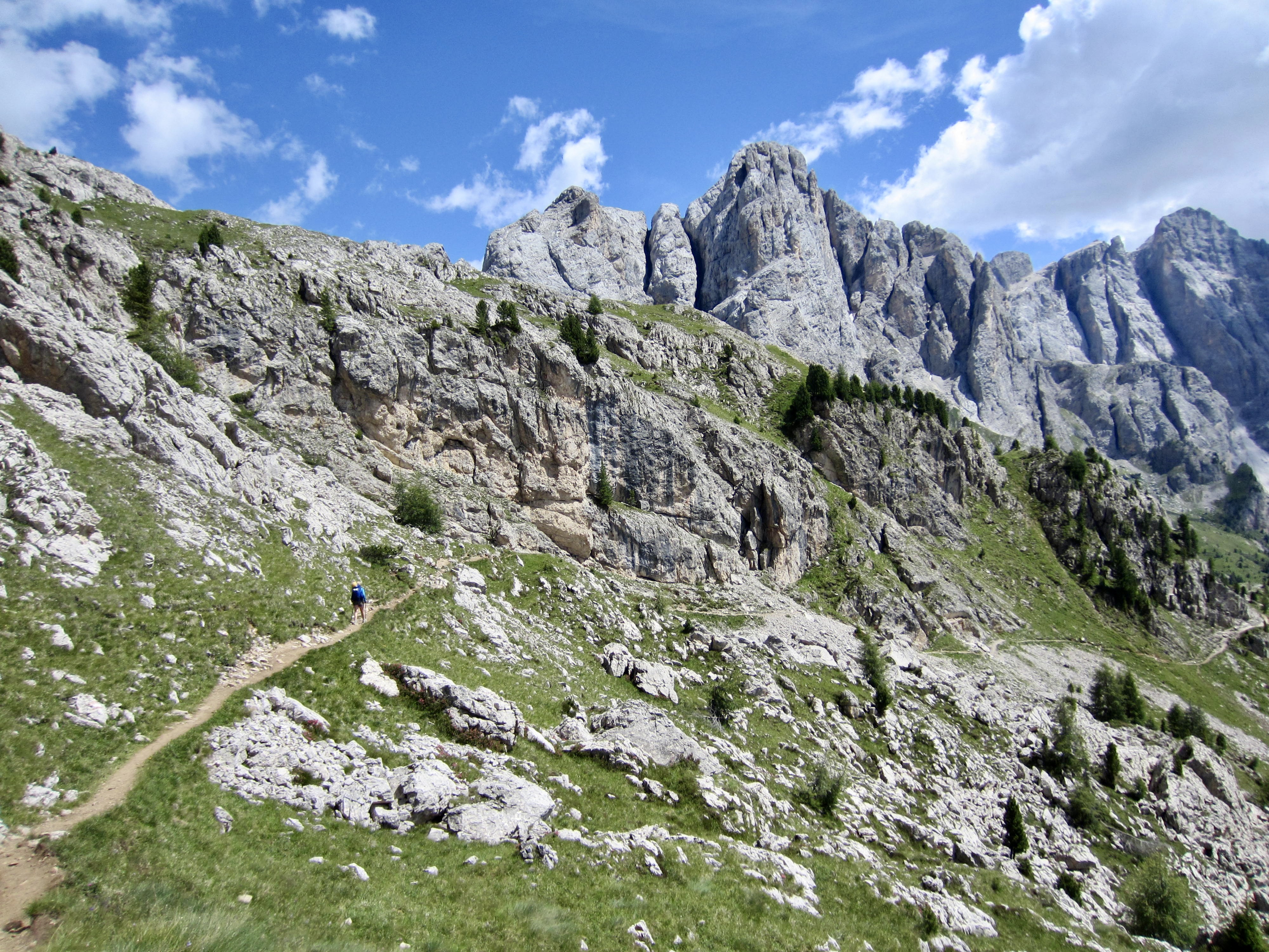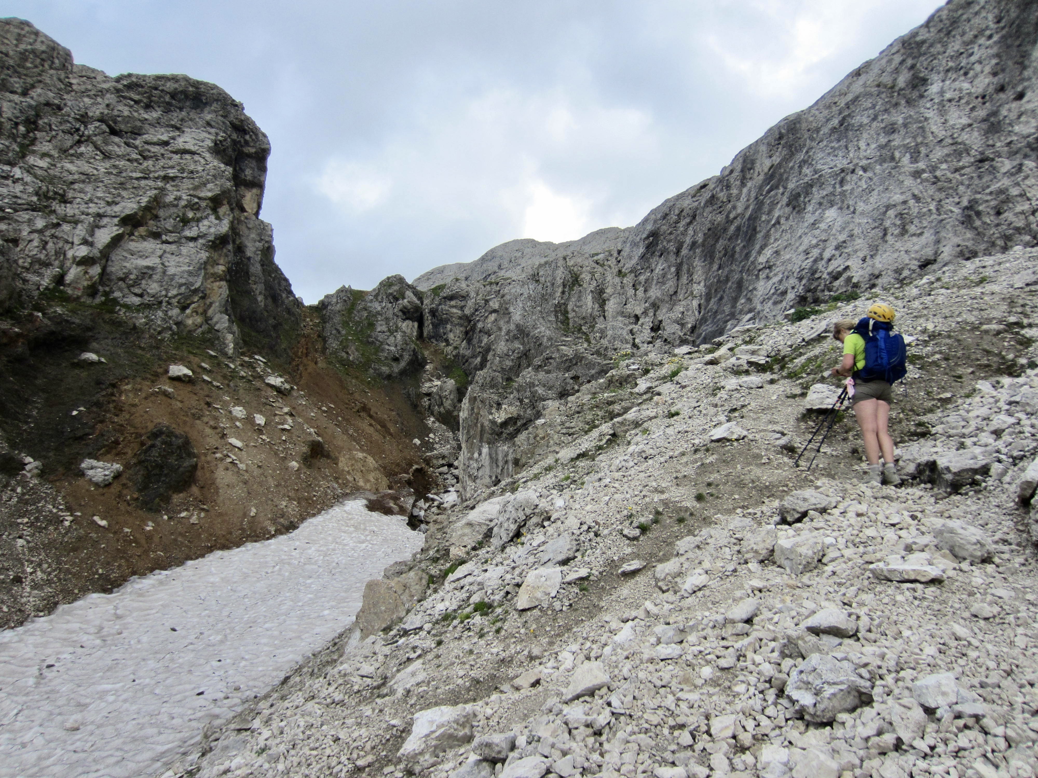 Because Mulaz and Rosetta are the two highest huts on the southern part of AV2, most of our day was spent on barren slopes of scree, talus, and dolomitic outcrops. The trail led us up to Forcella Margherita, then across a talus bowl before making a steep ascent to 9000-foot Farangole Pass—the maximum elevation we reached all week.