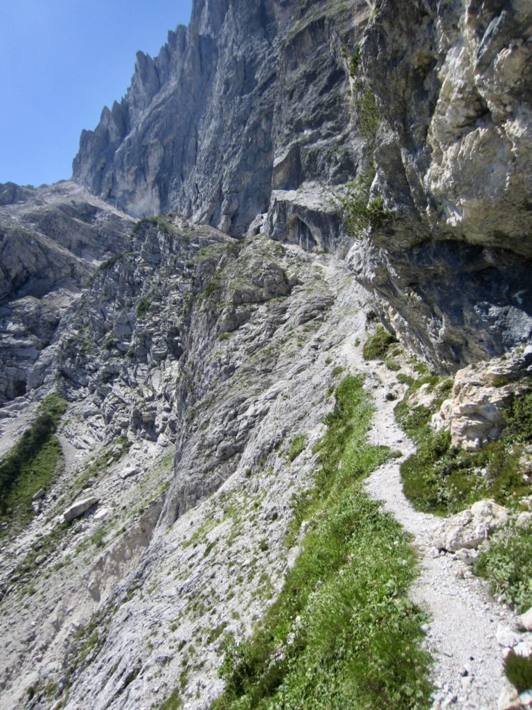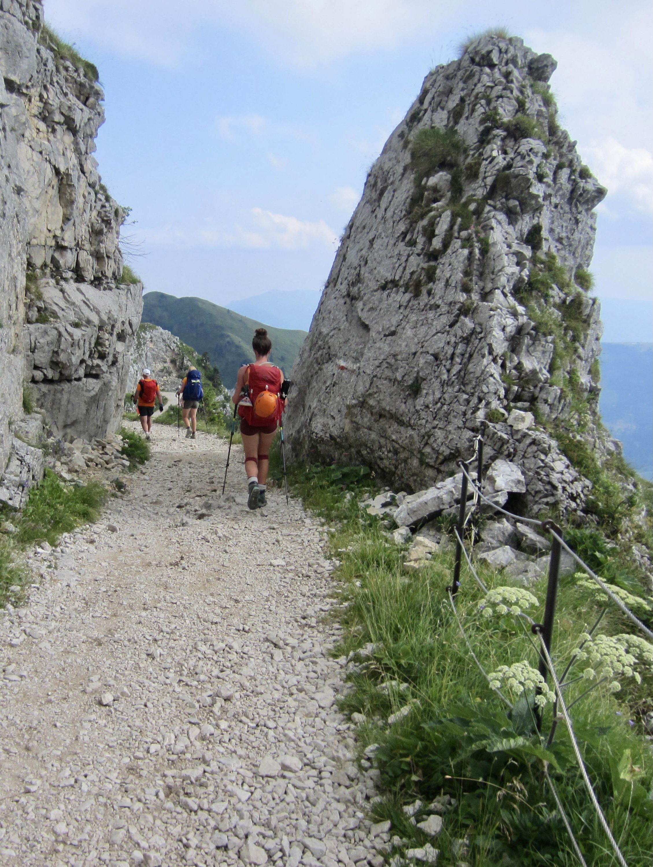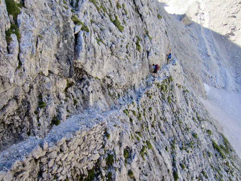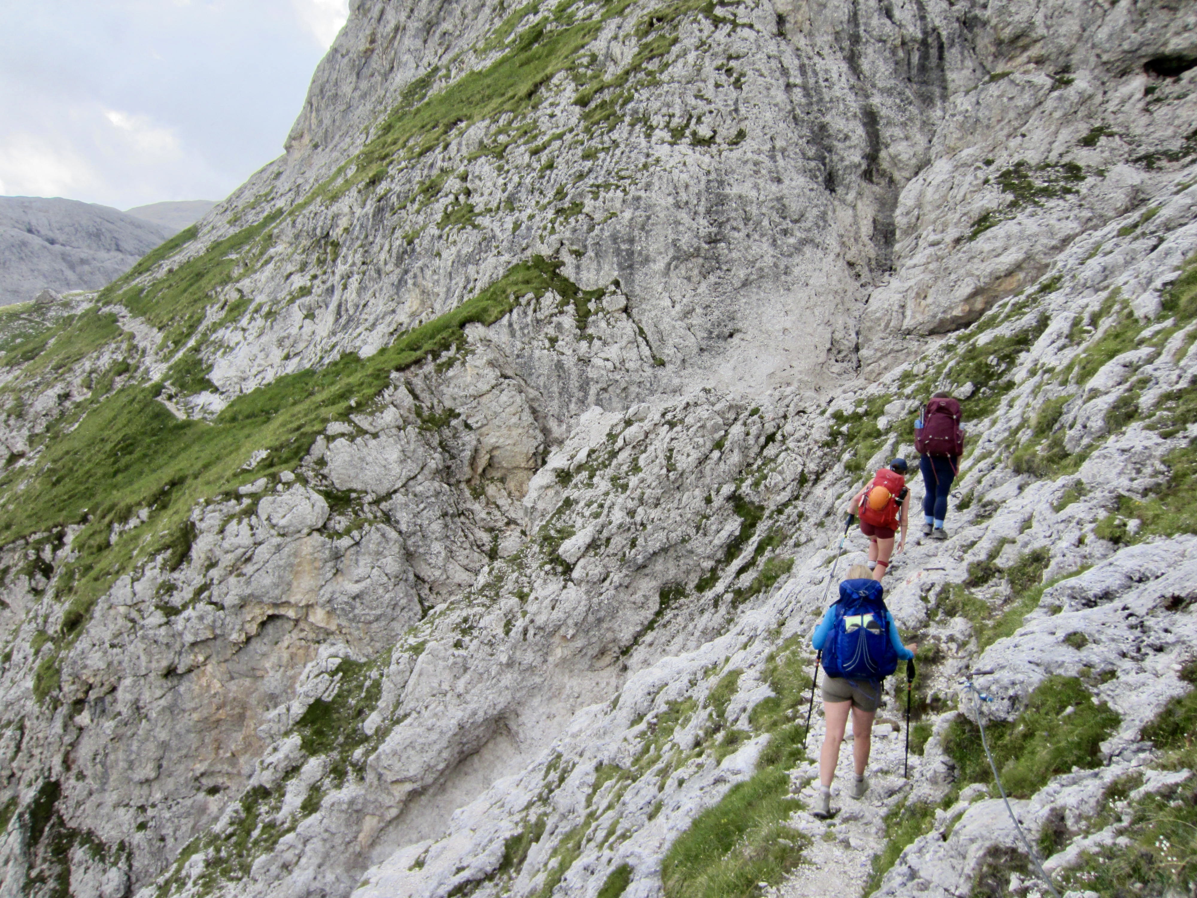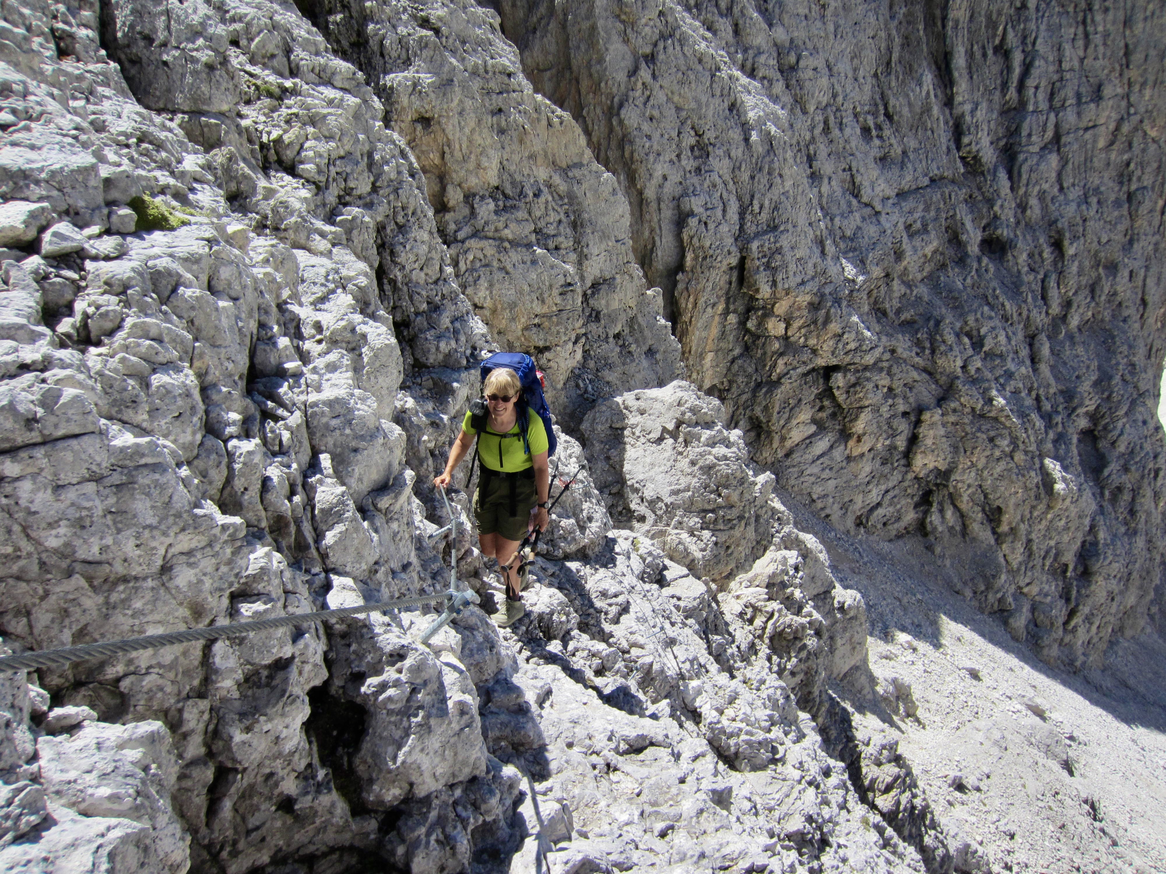 There had been a dousing thunderstorm during the night, so the AV2 trail was slick and muddy when we left Boz Hut in the morning. We hiked over Finestra Pass and made a long traverse beneath a sharp ridgeline. In many locations, the trail followed narrow ledges blasted into near-vertical cliffs where steel cables provided a welcome handline. This is not a place for inattention!