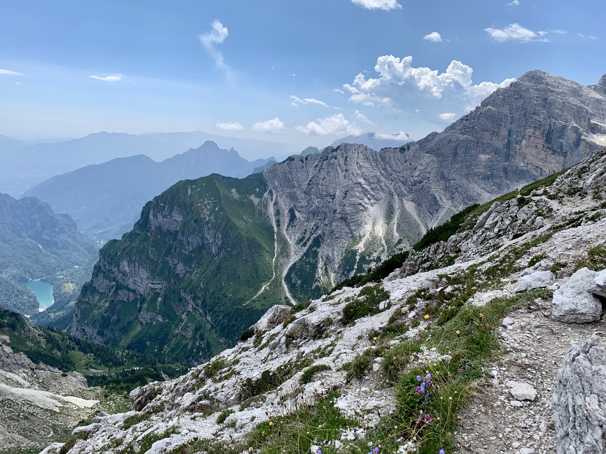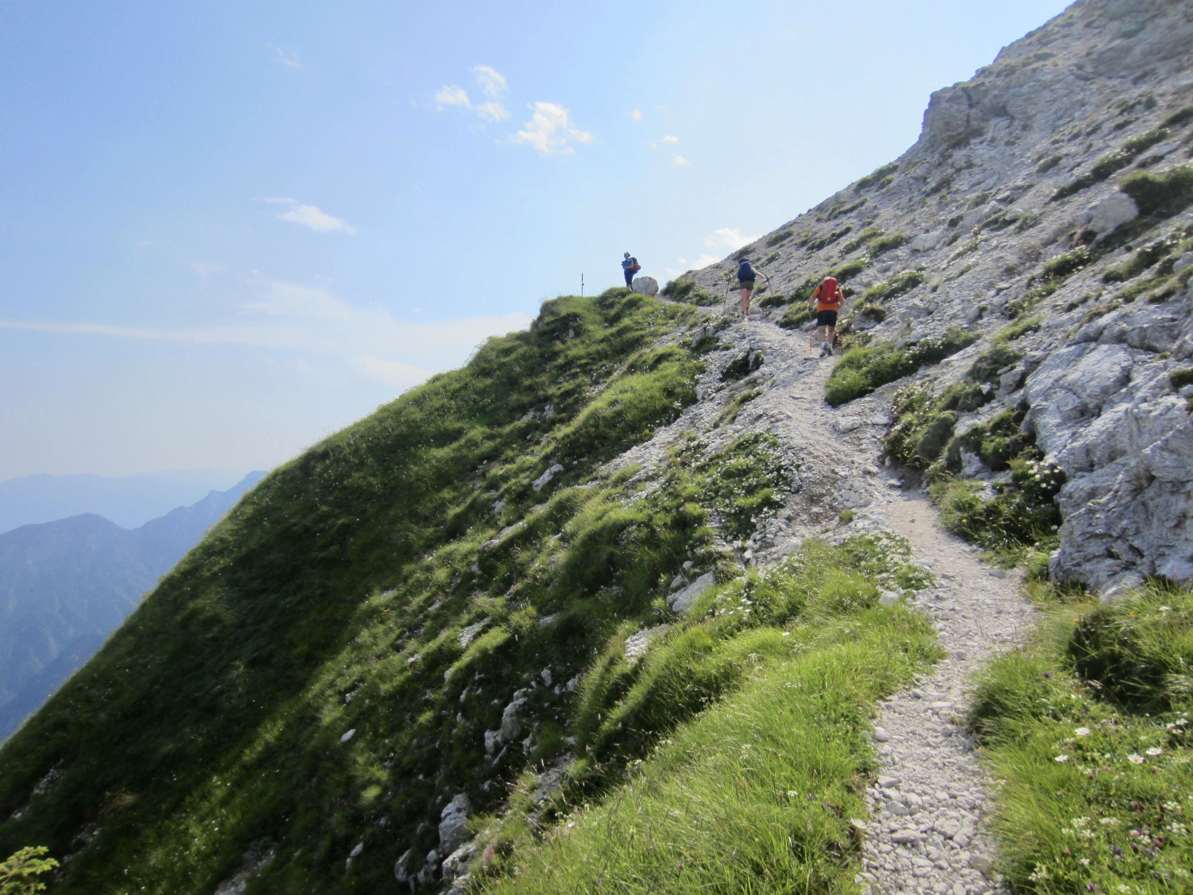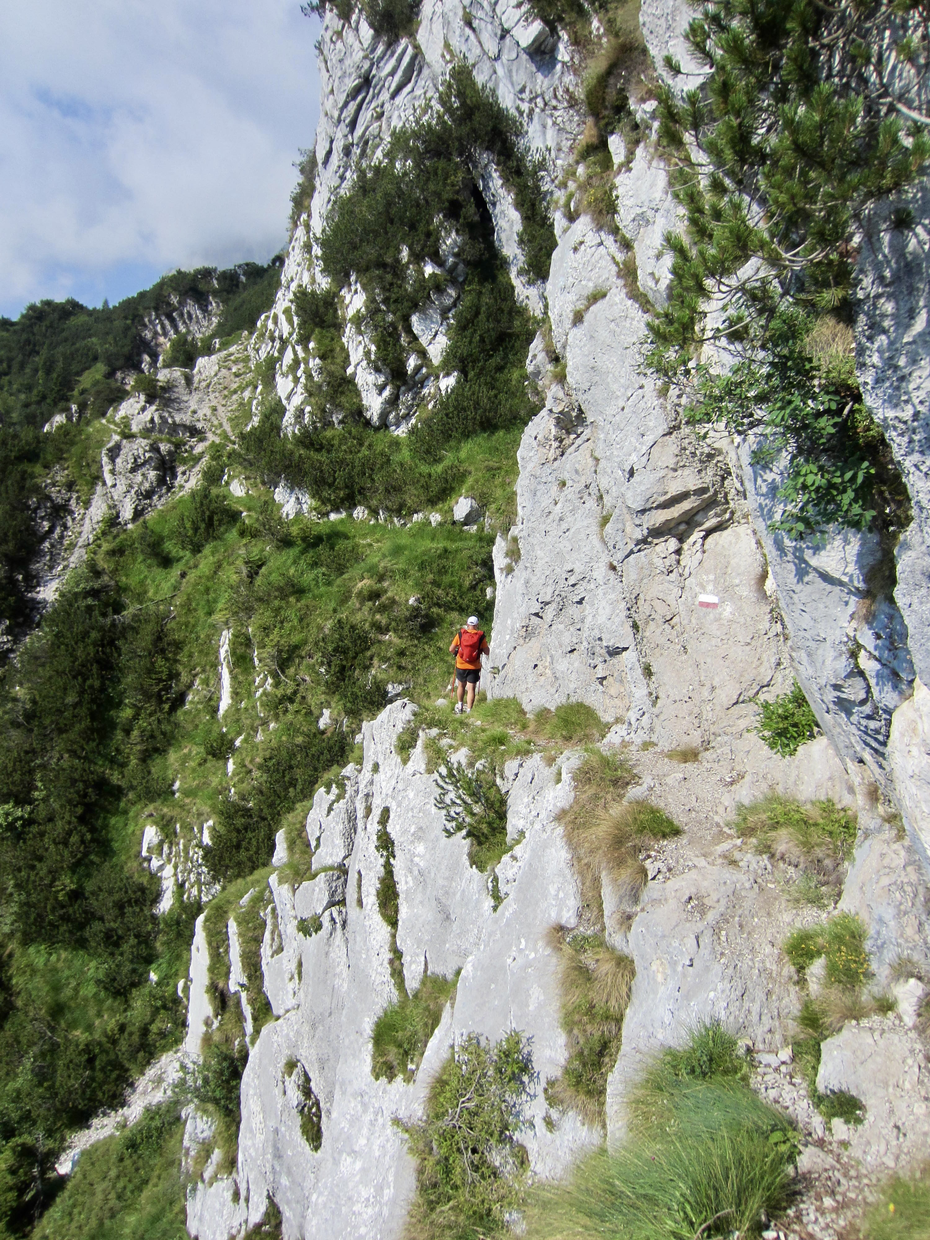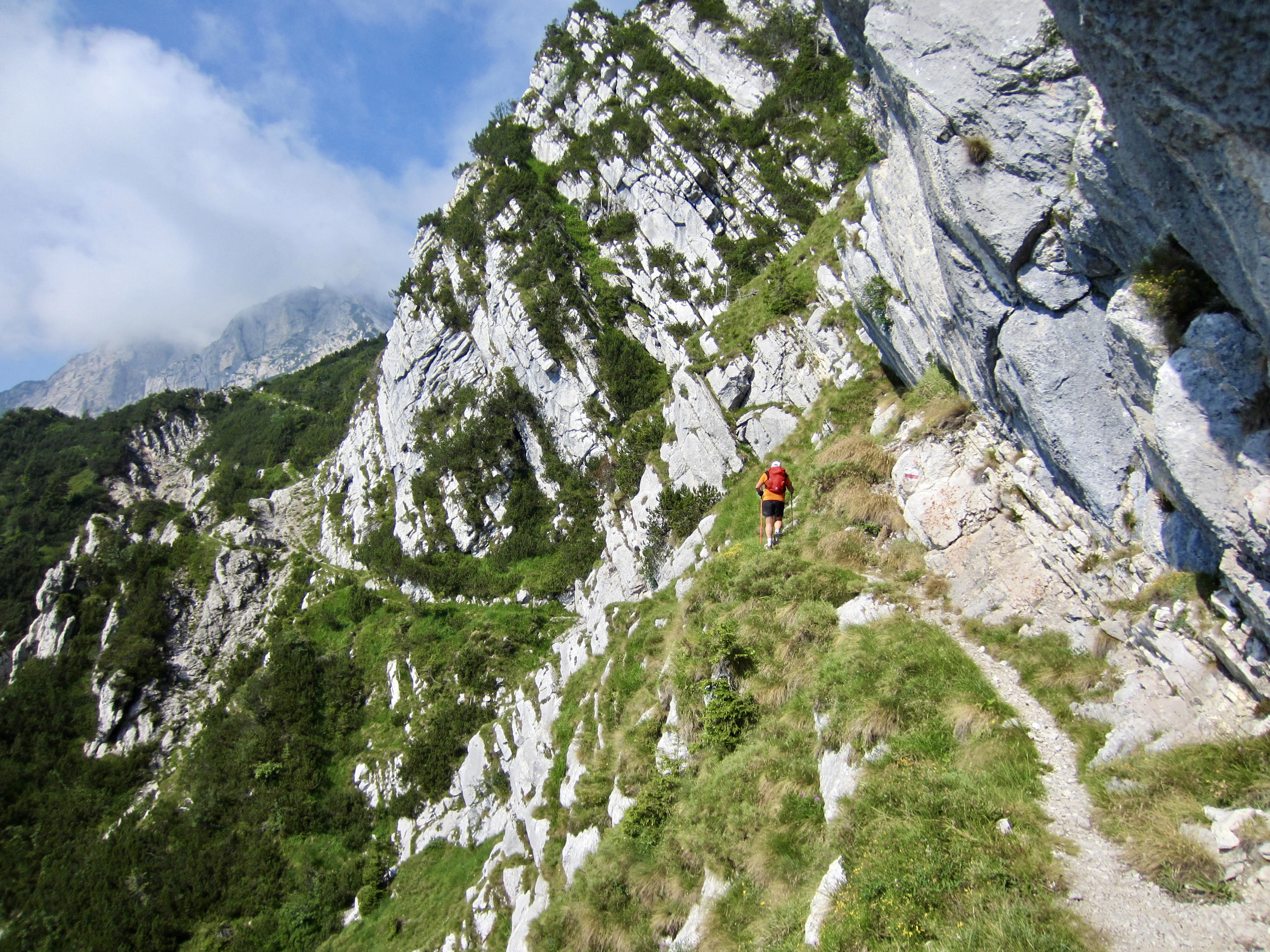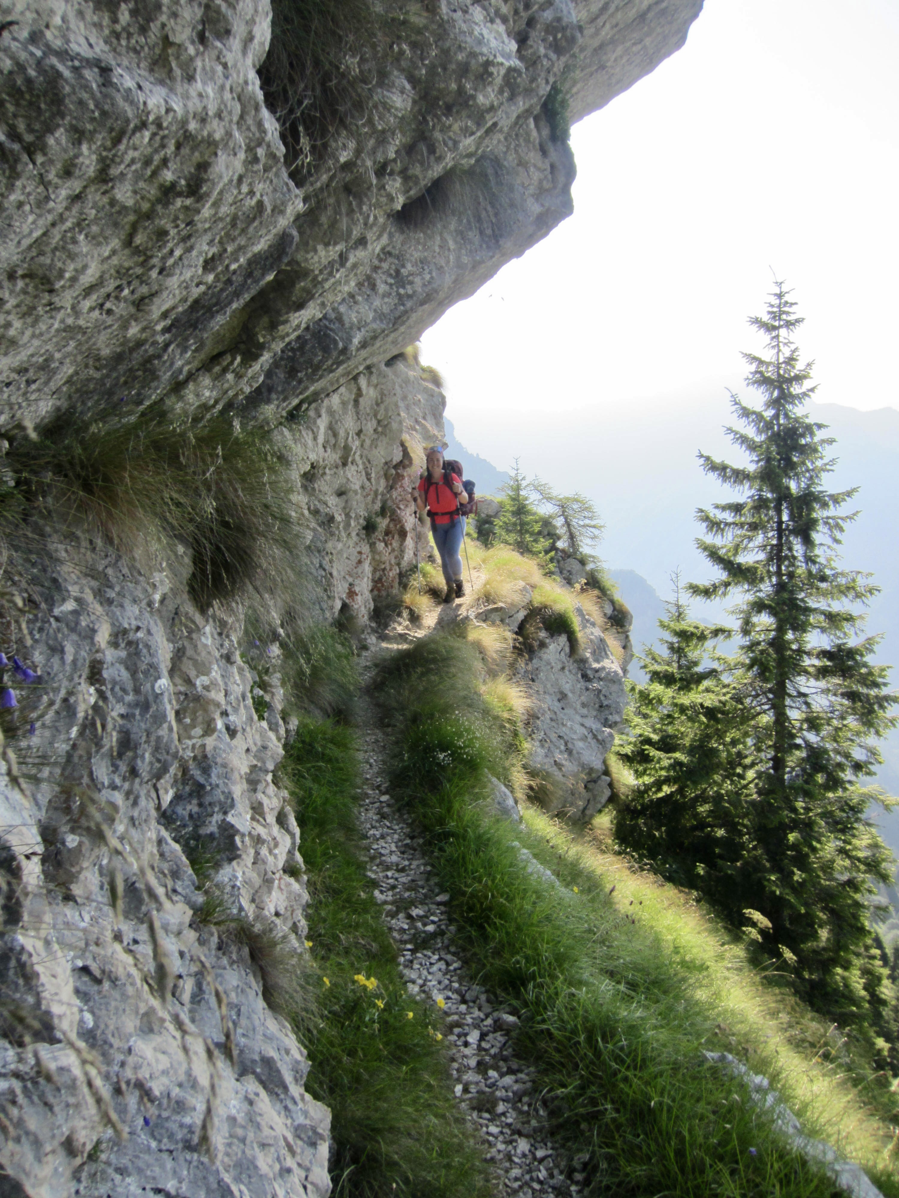 There had been a dousing thunderstorm during the night, so the AV2 trail was slick and muddy when we left Boz Hut in the morning. We hiked over Finestra Pass and made a long traverse beneath a sharp ridgeline. In many locations, the trail followed narrow ledges blasted into near-vertical cliffs where steel cables provided a welcome handline. This is not a place for inattention!