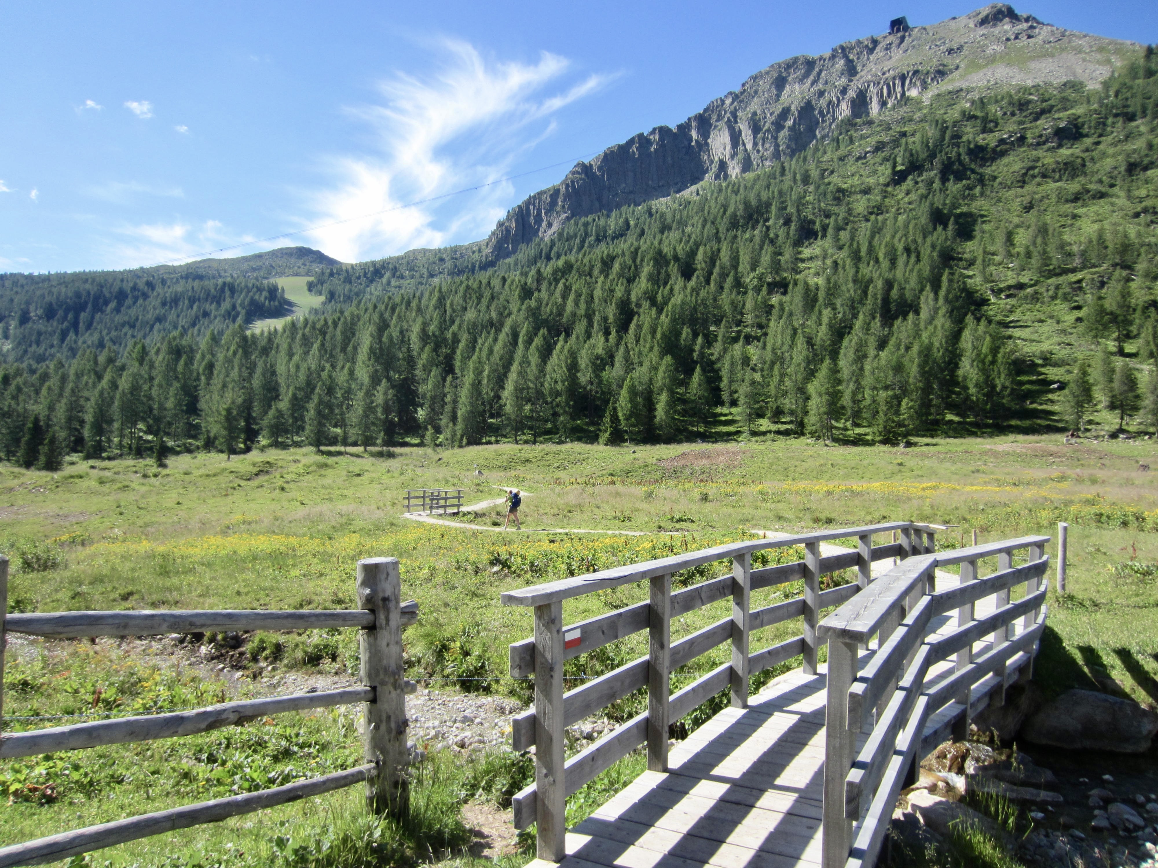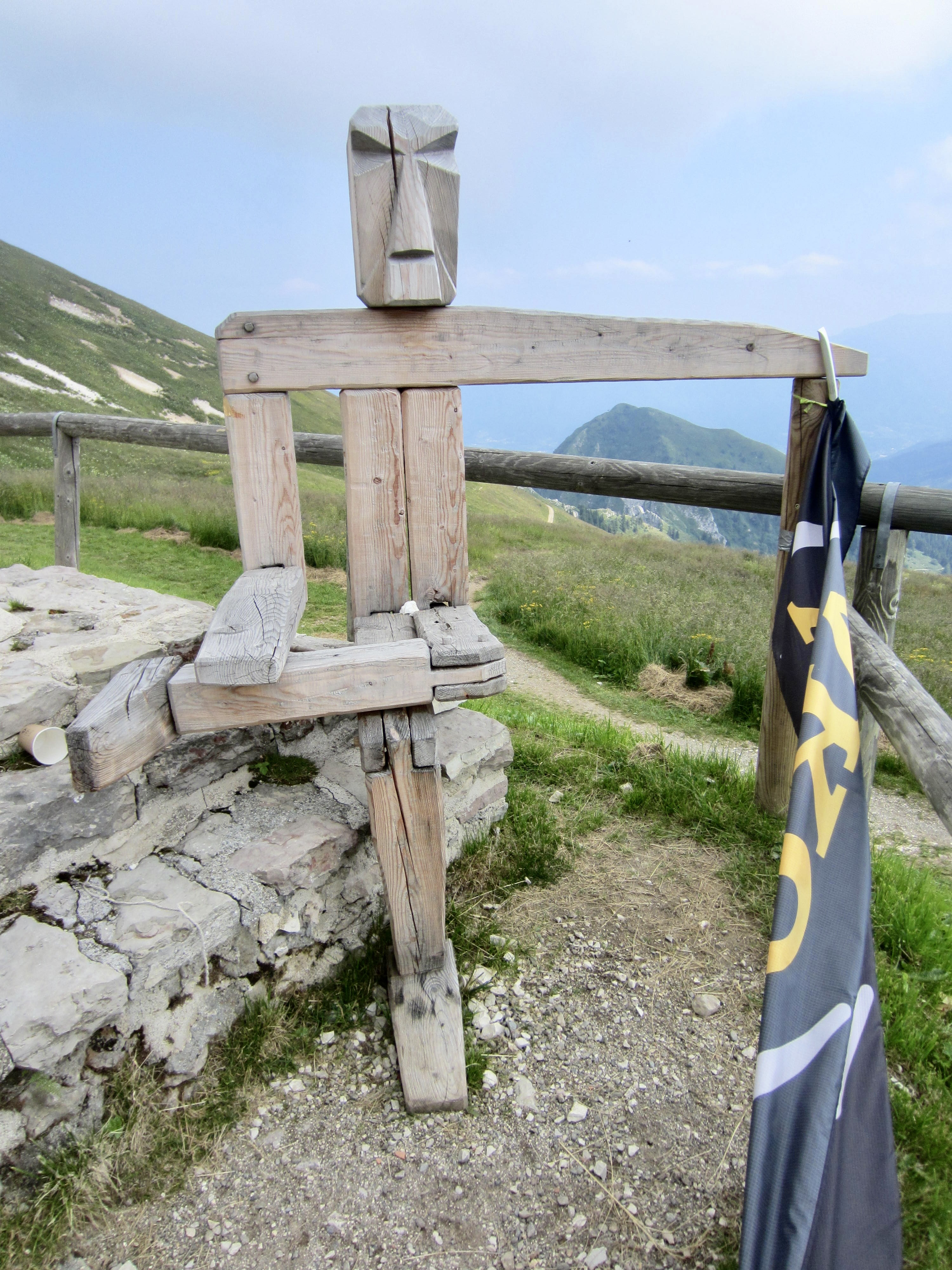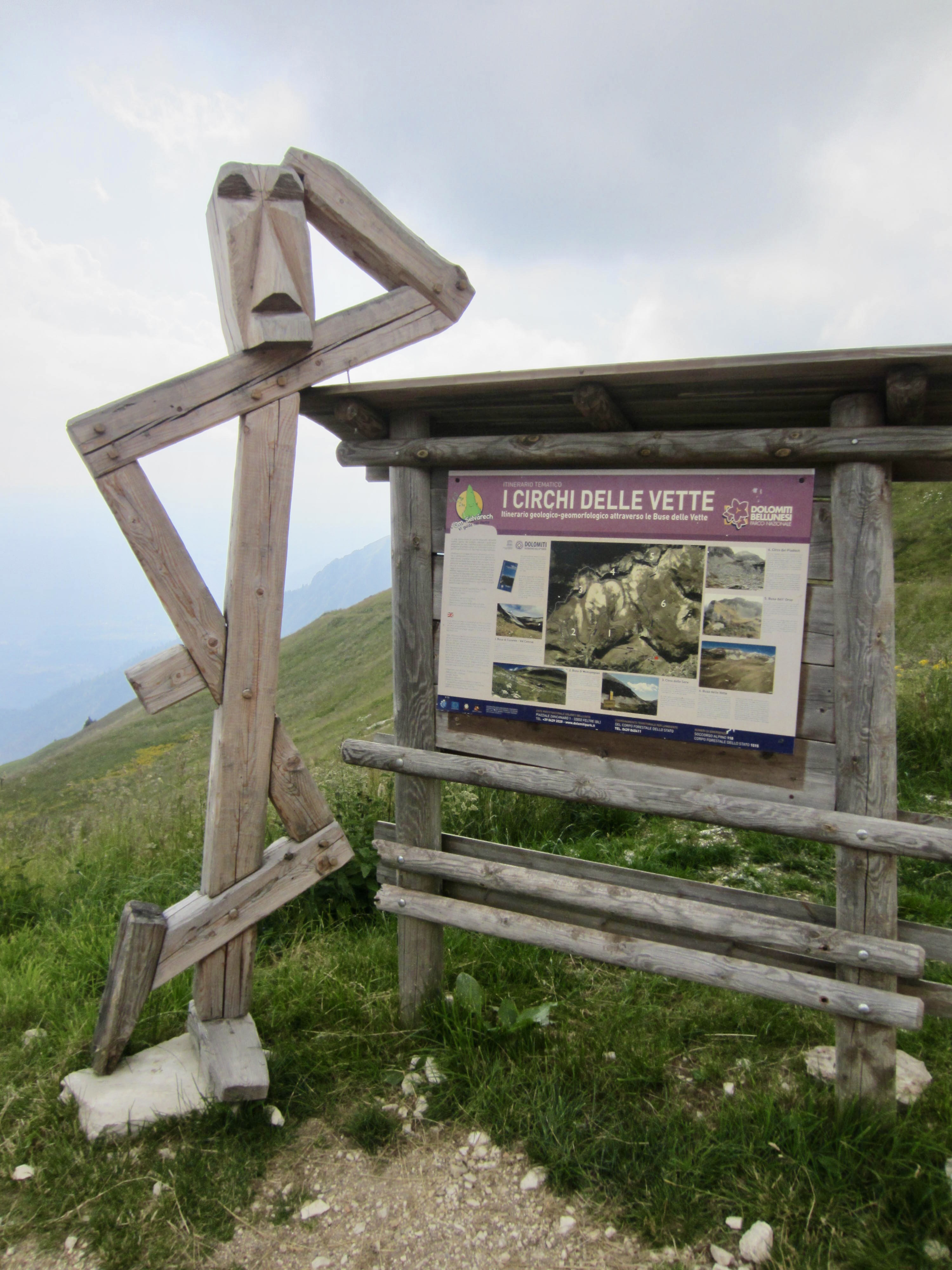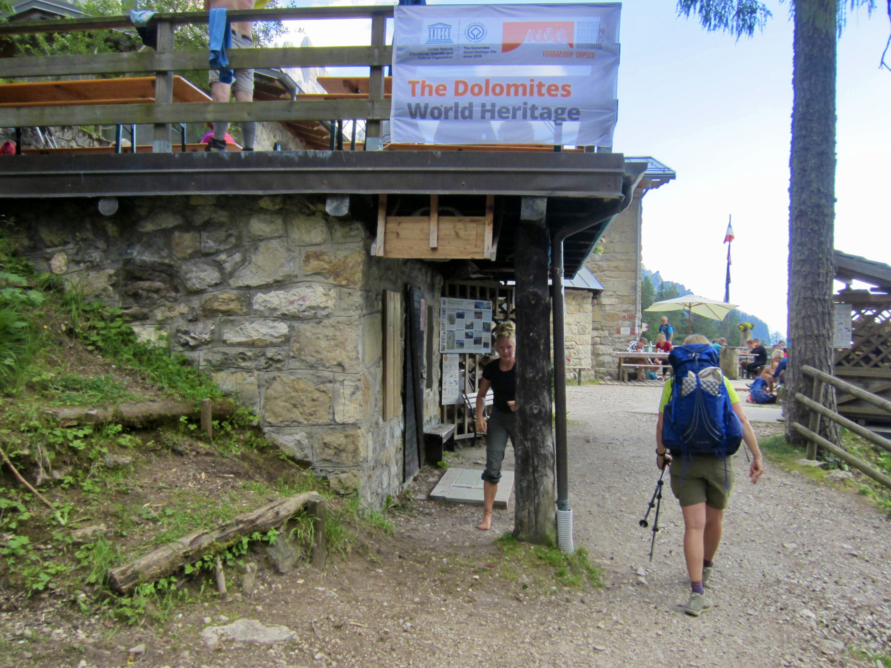 The old military road crossed a low ridge and dropped a bit to Piaz Hut, the southernmost shelter on AV2. We all stopped to enjoy a cold drink and dessert and to admire the wooden artwork. Most of us had originally planned to spend the night here, but we unanimously agreed to push on.