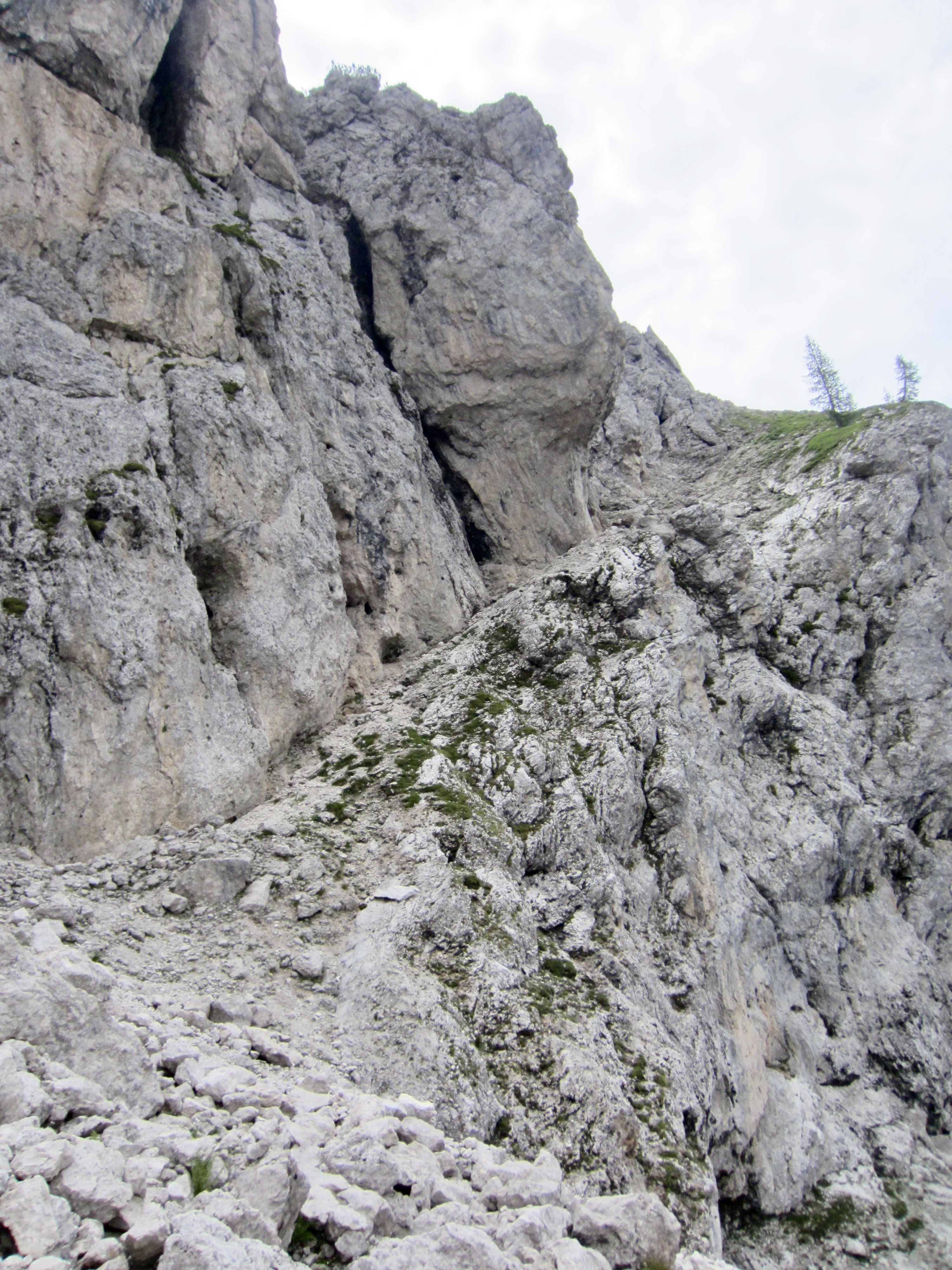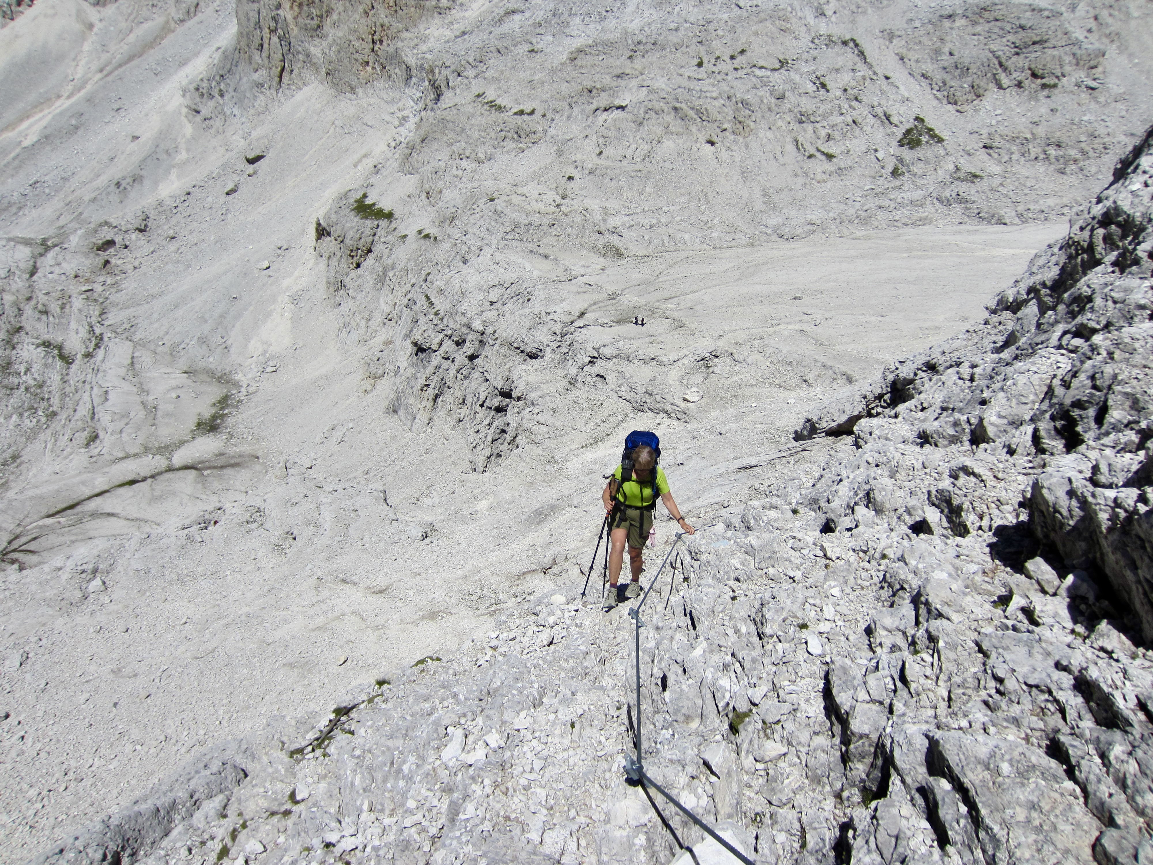 As a fun diversion from hiking, we started our day with a climb of Via Ferrata Canalone, which is located on a cliff directly behind Treviso Hut. This short but difficult (Grade 4) via ferrata is very popular due to its easy access. For details regarding our climb, see my separate trip report.
