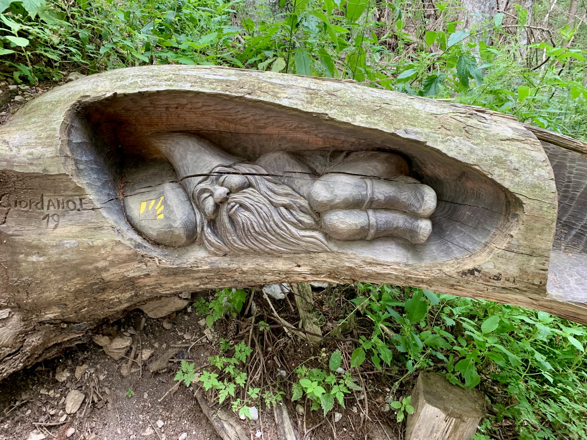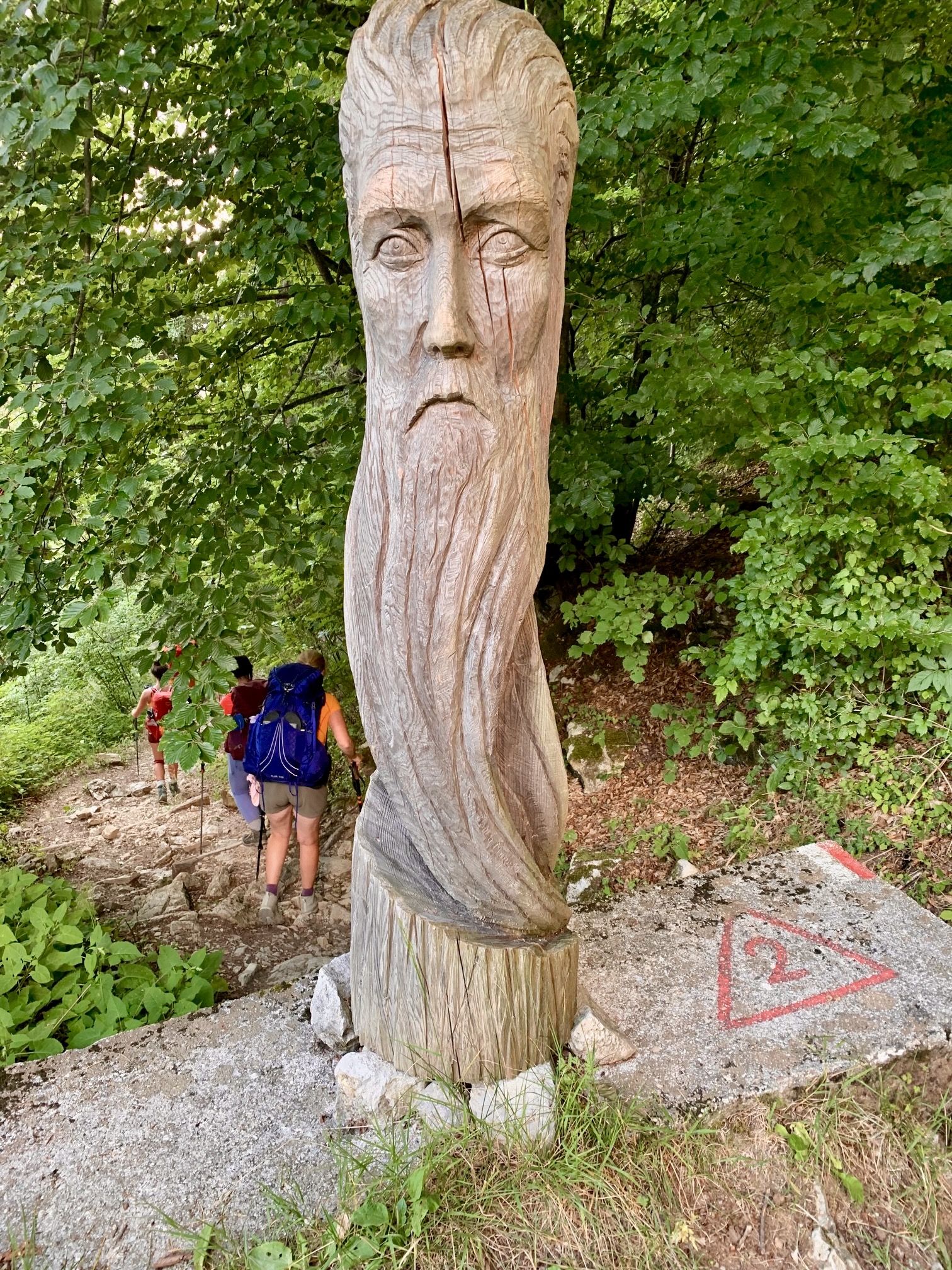 The final portion of trail featured a variety of modern wooden sculptures and ancient drainage structures. In early evening, we all arrived at a paved road in the tiny village of Croce d’Aune, feeling tired, sore, hungry, and giddy. Although there is an official continuation of AV2 down more roads and trails to the big town of Feltre, very few trekkers are interested in doing it. Our group was more than happy to terminate our adventure here, so Maeve called a taxi that took us into town, where we celebrated with pizza and wine.