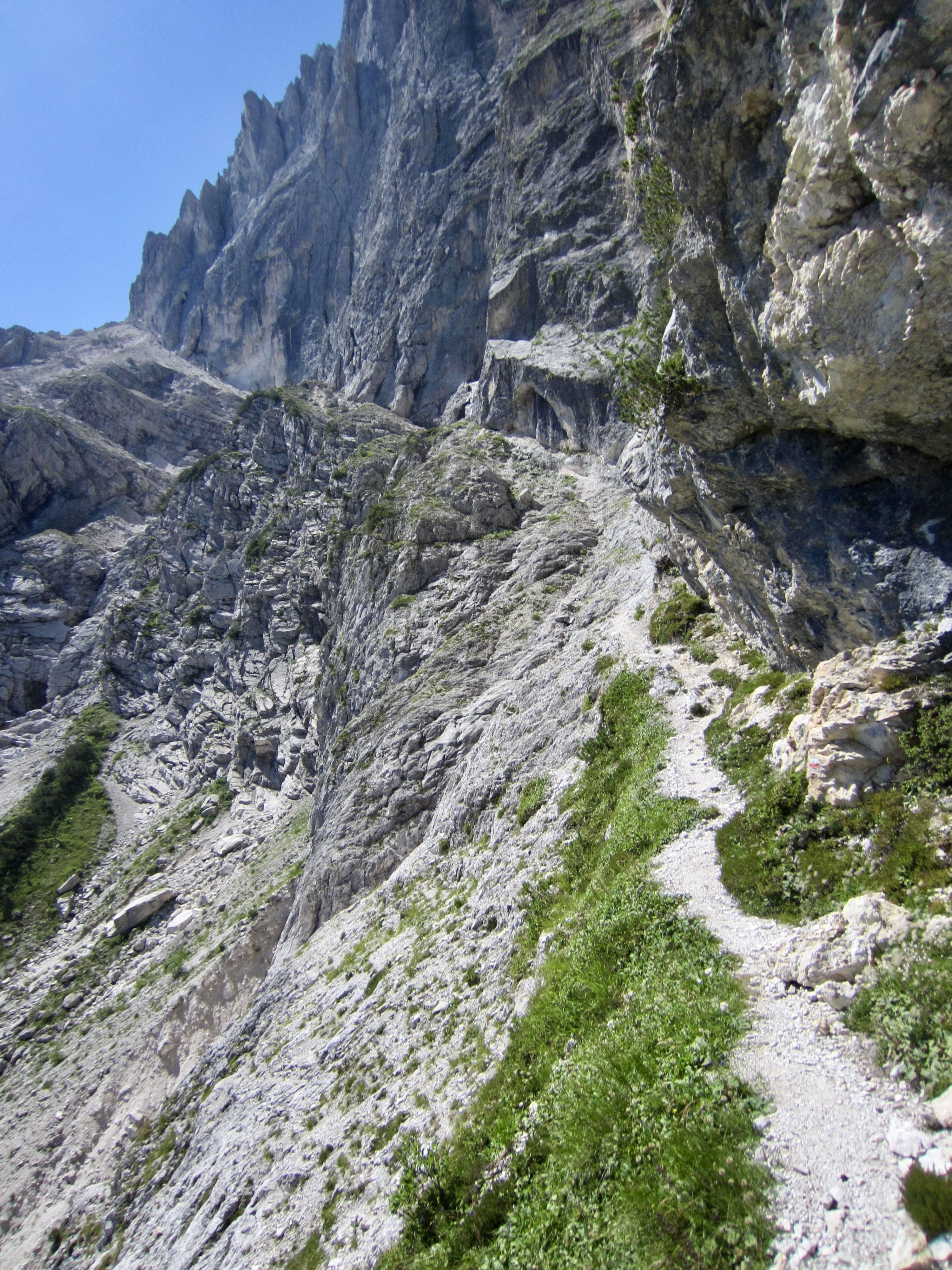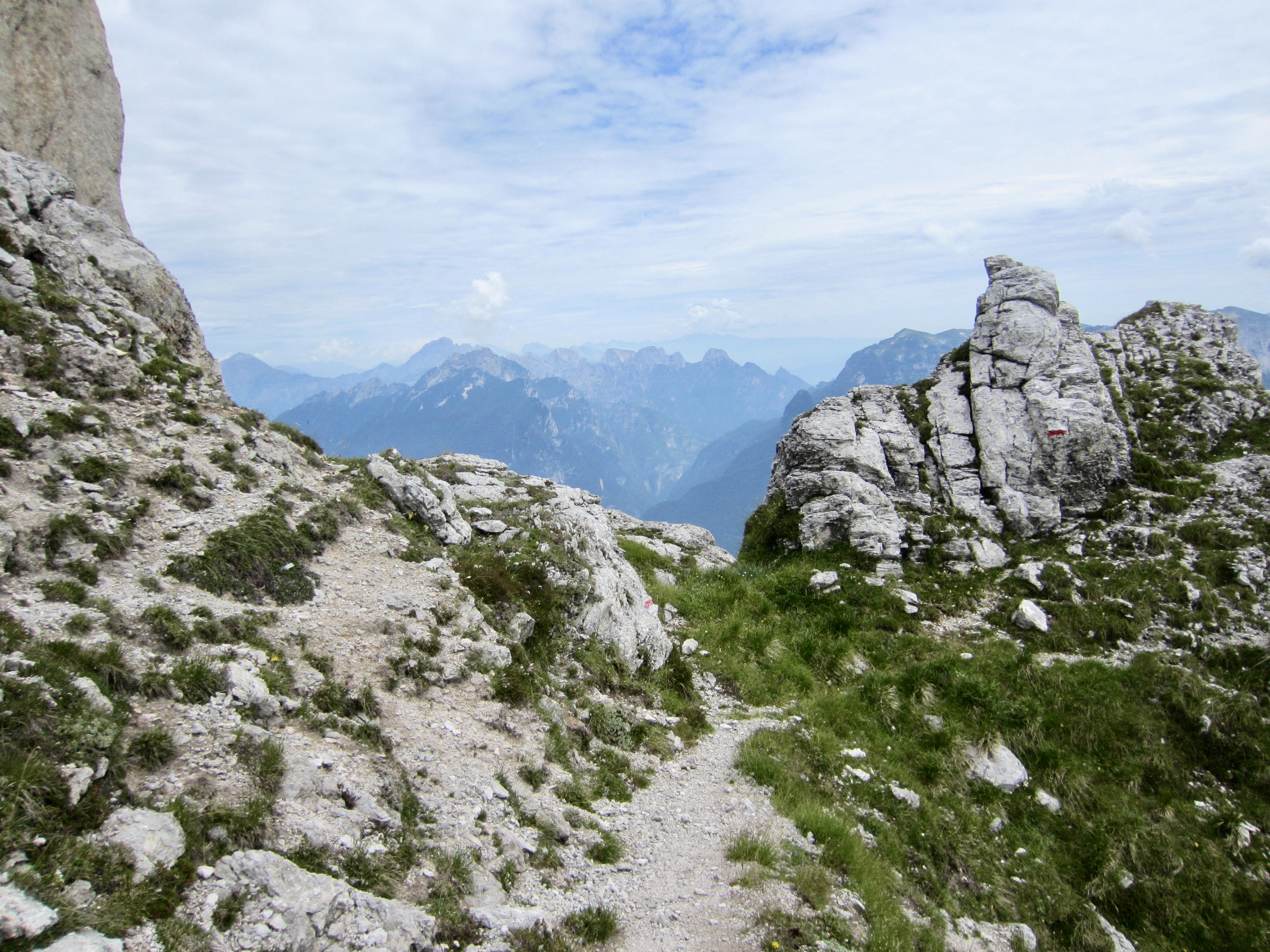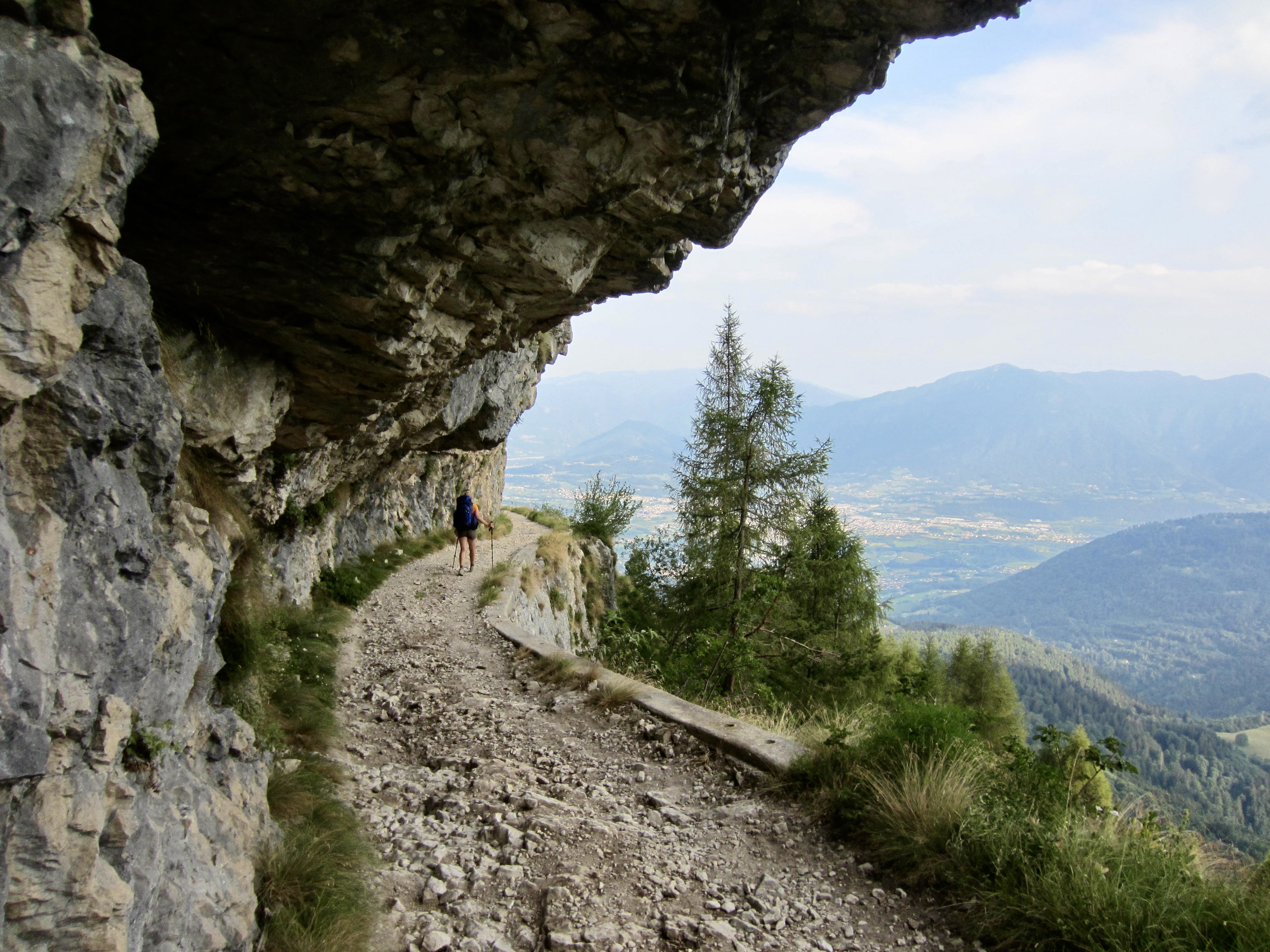 Single-track trail gradually transitioned to a wide trail paved with dolomite flagstones. This portion of AV2 follows an old military road built during World War I for the purposes of moving troops and supplies.