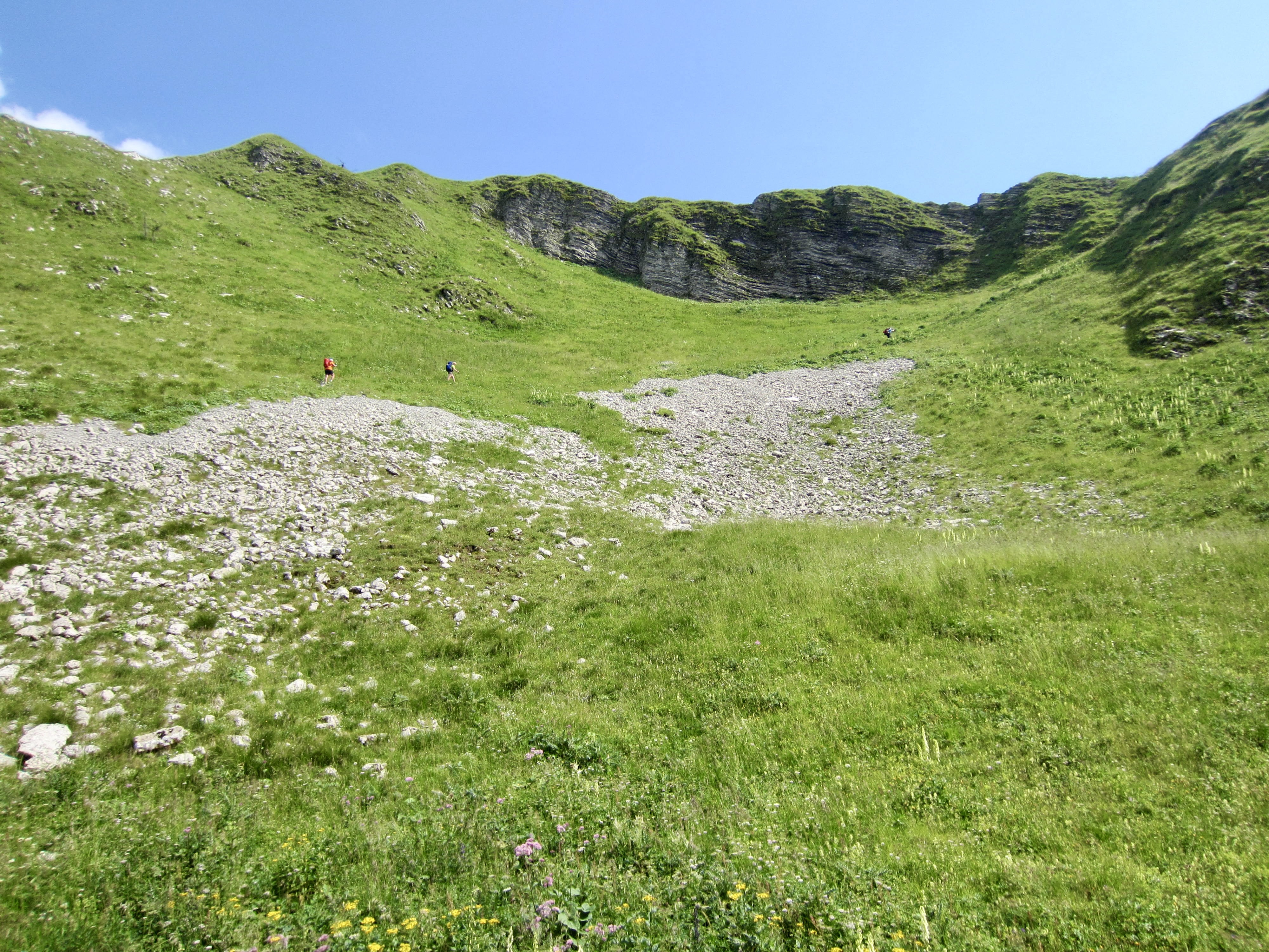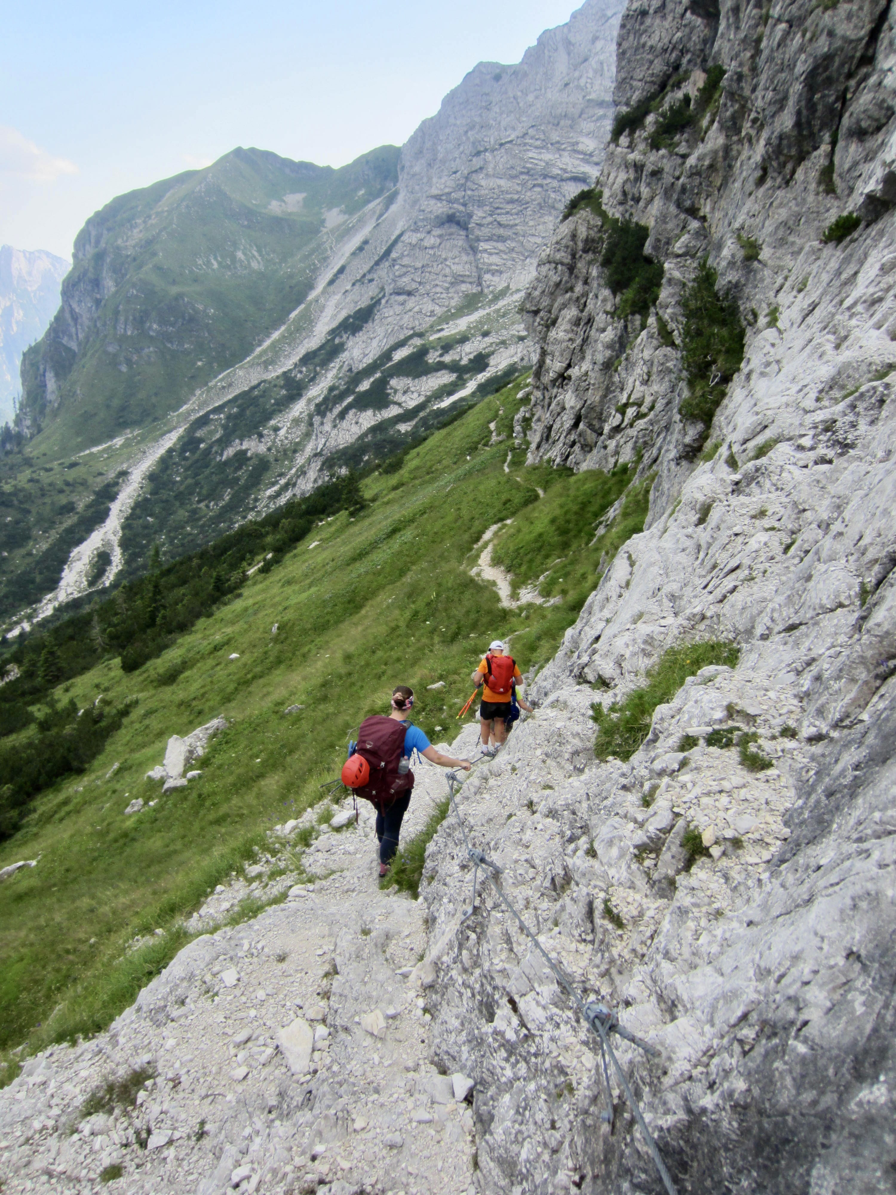 We descended into a small gravel basin below the pass and then made a long traverse across a steep hillslope. There were cables in place at the more exposed locations, but the terrain was fairly easy.