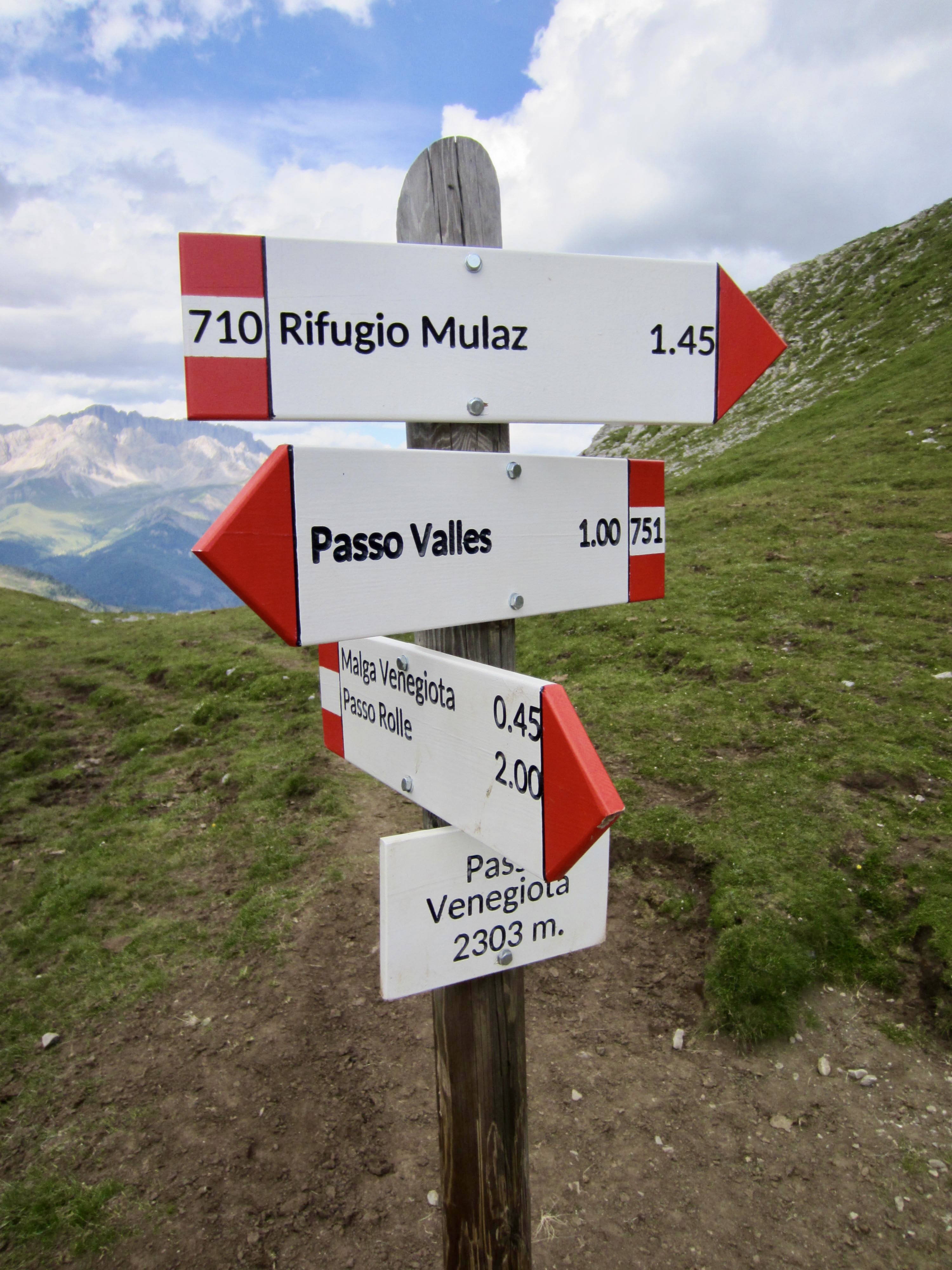 From Forcella Venegia, there are two trail options: an indirect low trail and a direct high trail. The signage is a bit ambiguous here, but it appears that AV2 has recently been rerouted from the low trail to the high trail. We all took the high trail and found it to be very agreeable. At Venegiota Pass, Brooke and Maeve proceeded on to the Mulaz Hut while Eileen and I took a short sidetrip up Cima delle Venegiota (0:30 + 200 feet RT).