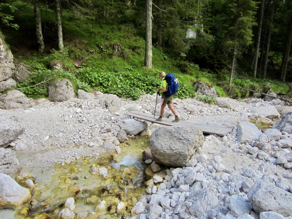 We continued down the trail, which was still steep and rough—and interrupted in places by small cliff bands with no cables. This appears to be a sorely neglected section of AV2. There were several slips and falls along the way. Trail conditions improved greatly below treeline, and it was a relief to finally reach Canali Creek in late afternoon. We stopped to splash off and drink up.