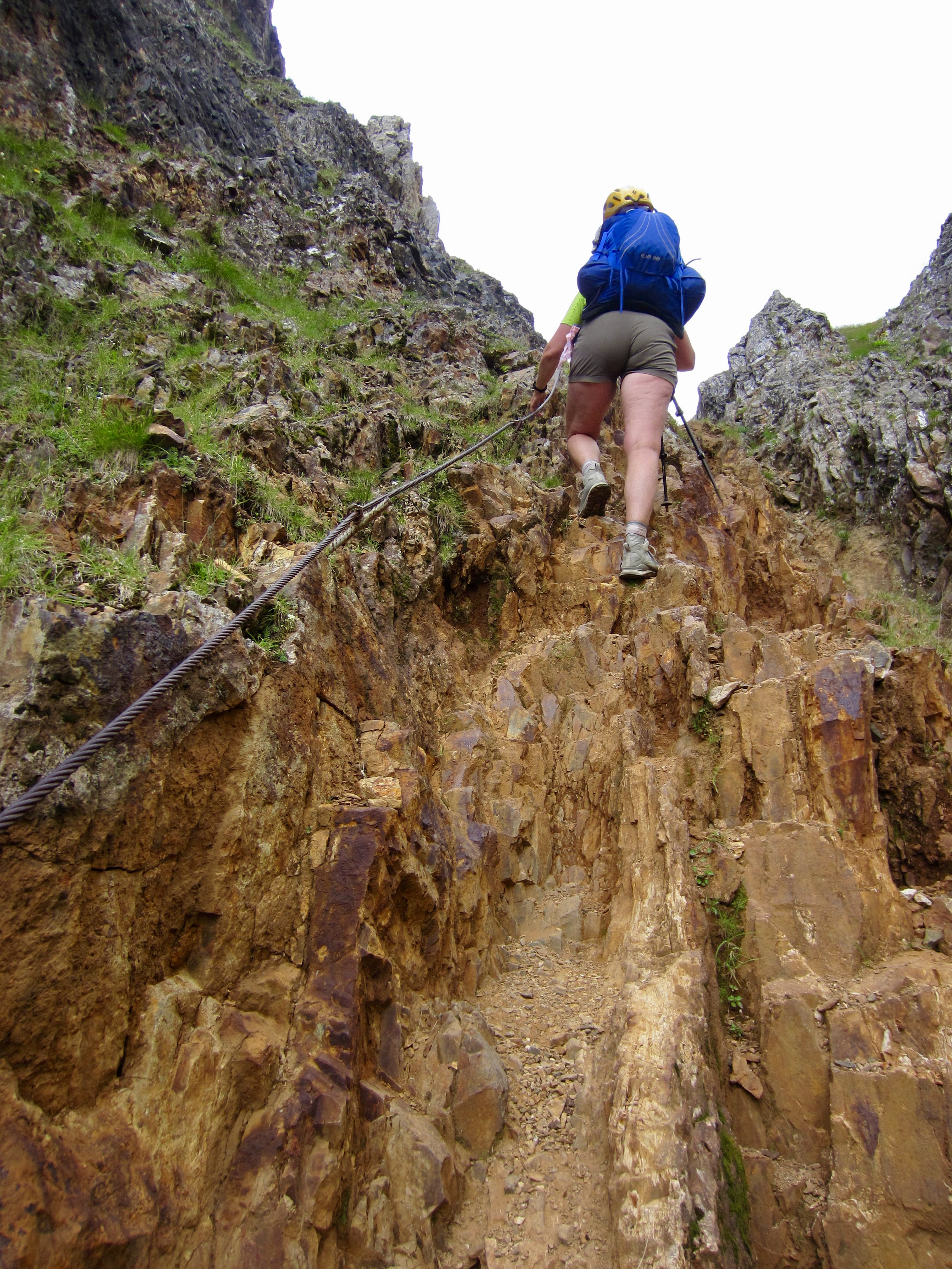The uppermost portion of Farangole Pass involves climbing up, across, and back down steep, loose rock with the aid of iron rungs and steel cables. We all wore harnesses, lanyards, and helmets for safety here.