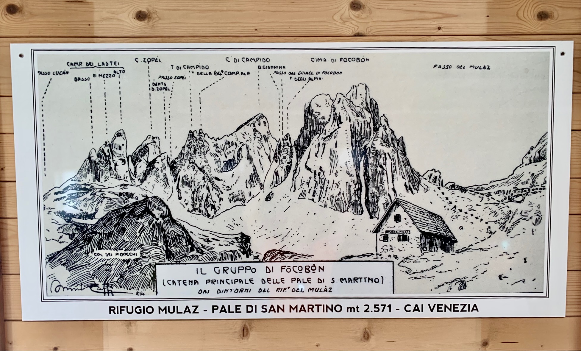 Mulaz Hut is an old stone structure tucked up against towering peaks. Like many Dolomite huts, the interior displays an interesting collection of historical photos, climbing memorabilia, and artwork.